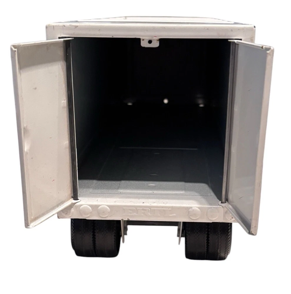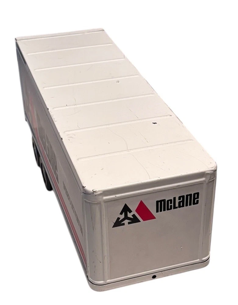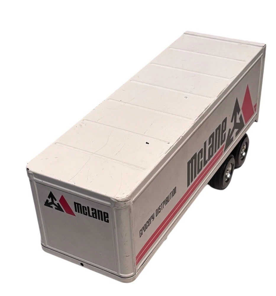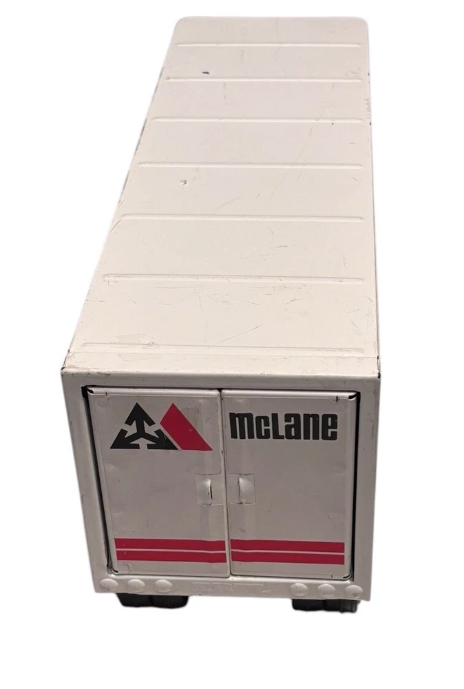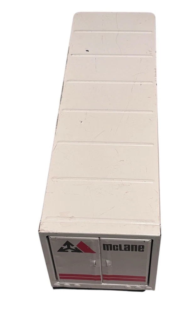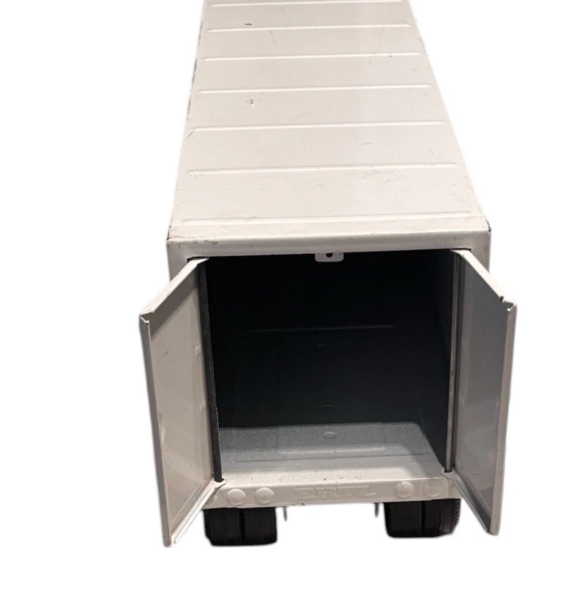 Vintage McLane Company Ertl Metal Toy Trailer 16” White Doors Open No Truck/Cab. Good preowned vintage condition showing normal signs of wear/use with some light scratching/chipping present mainly on the top. The back doors open and close. This listing is for the trailer only. There is no truck or other accessories. Is it approximately 16 inches long. Please see photos for design and condition details. Don’t hesitate to message me with any questions.