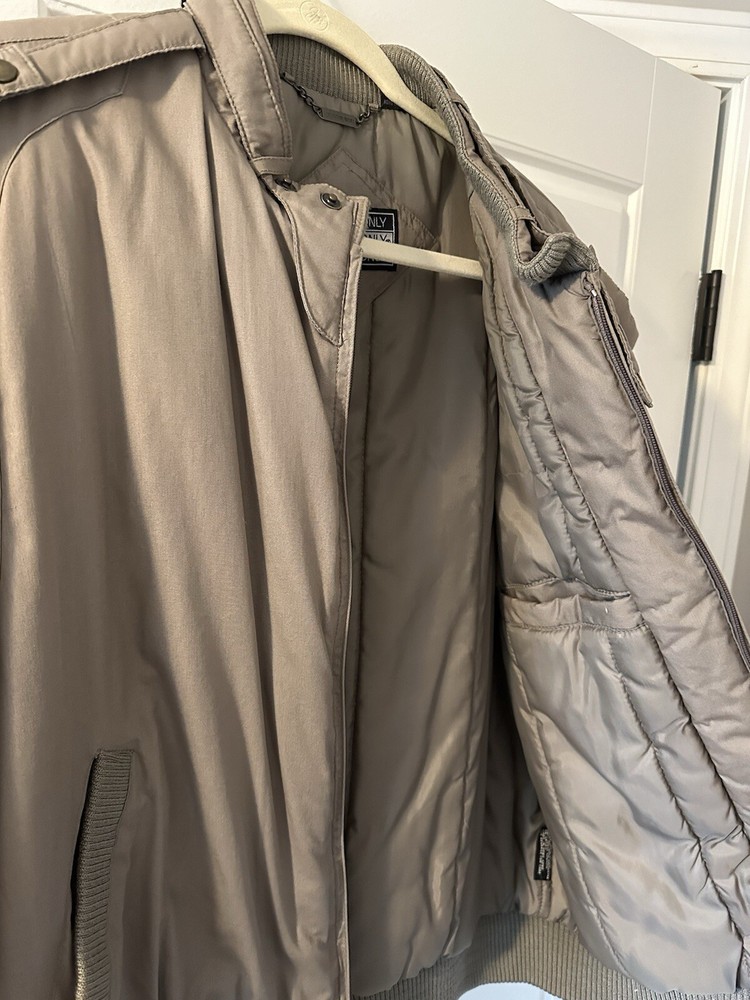 This vintage Members Only bomber jacket is a must-have for any 80s fashion enthusiast. With a beige, tan, and light brown color scheme, this jacket features a solid pattern and a softshell fabric type. The outer shell is made of polyester, and the lining is also made of polyester and cotton. The jacket has a full zip closure, with a band collar style, and is accented with a strap, zipper, and logo. It is lightweight and has pockets, making it perfect for fall and winter seasons. This jacket is a size 46 and is made in Hong Kong. Add this vintage gem to your wardrobe today!