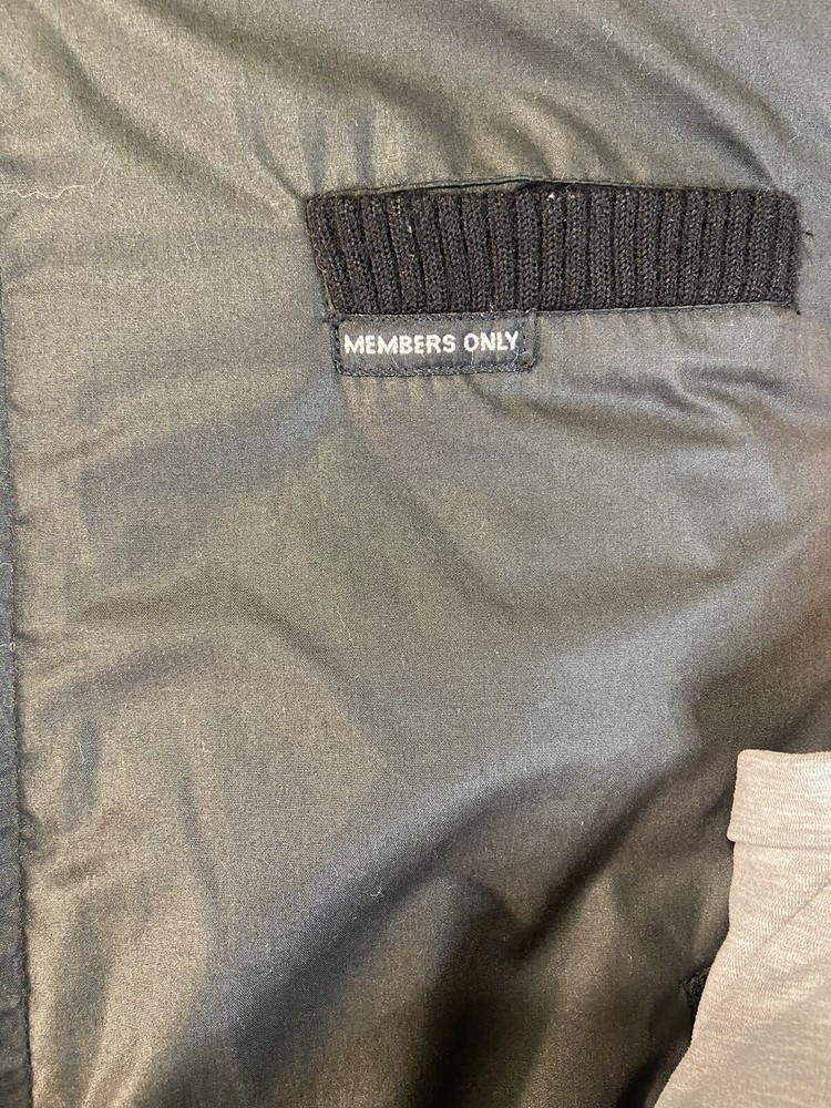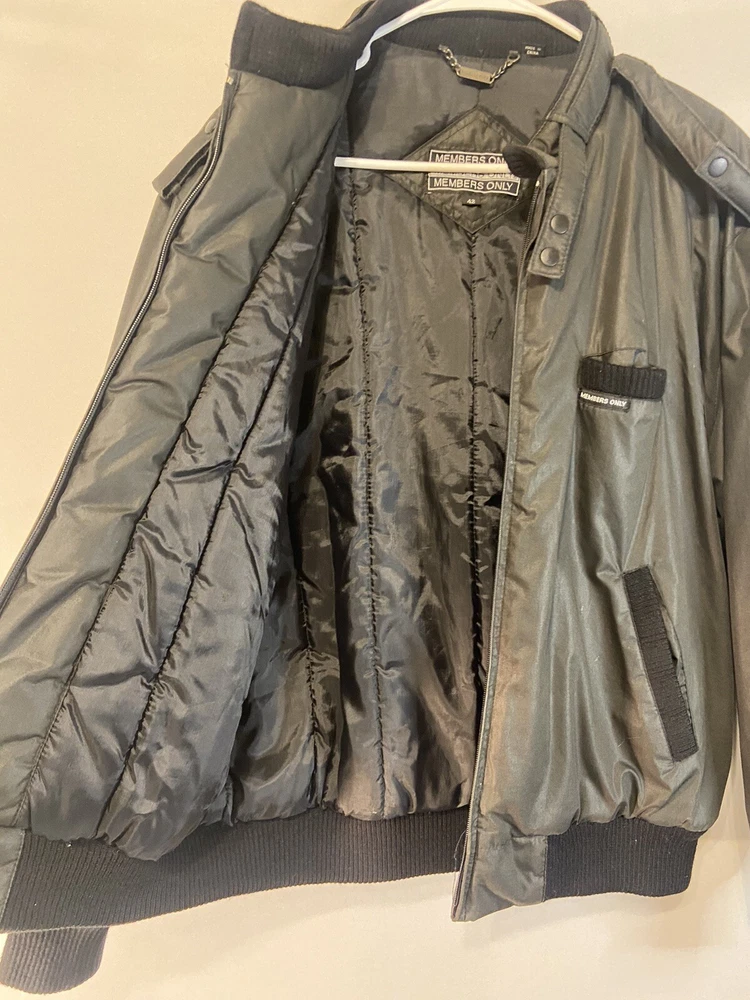 This vintage Members Only jacket is a must-have for any fashion-forward man. With a classic black color and a mid-length bomber style, this jacket is perfect for any occasion, from casual wear to workwear to parties. The jacket features a full zip closure with buttons, a band collar, and the iconic Members Only logo on the front. Made from lightweight knit polyester fabric and insulated with polyester, this jacket is perfect for fall, winter, and spring seasons. It also has multiple pockets, making it practical for outdoor activities like hiking, skiing, and cycling. This jacket is a true gem for anyone who loves nature, nautical, and outdoor themes.