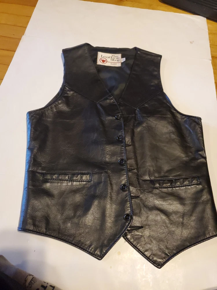 Up for sale is a classic black leather vest from The Leather Shop, perfect for any occasion, be it travel, casual, formal or workwear. The vest is made of high-quality leather and features a solid pattern with a button closure. It is a short-length vest with a regular fit and is available in size 36. This vintage vest has accents of button and is lined with lightweight nylon material. It is perfect for riding in any season, be it winter, summer, fall or spring. The vest also has pockets to carry your essentials. The vest is a perfect addition to your wardrobe if you love Western, motorcycle or cowboy-themed outfits. Fast Shipping!