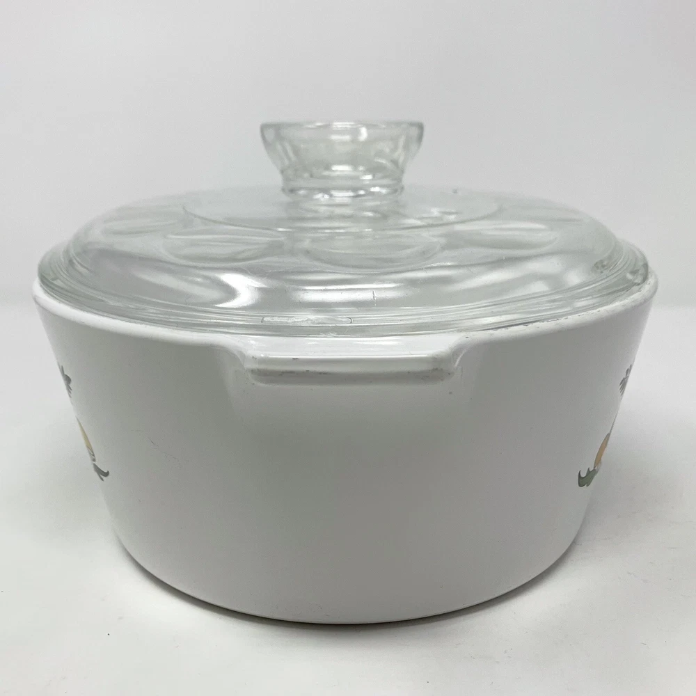 Vintage Merry Mushroom Corning Ware 1.75 Qt Casserole Dish w Dimple Lid *READ* Vintage used condition with lid. Lid has 4 good size chips on the inside rim (see photos). Casserole has some wear/scratches particularly the top rim. Please check photos for details of condition. Please choose economy or priority shipping in the options. Feel free to contact me with any questions, I'm happy to help.