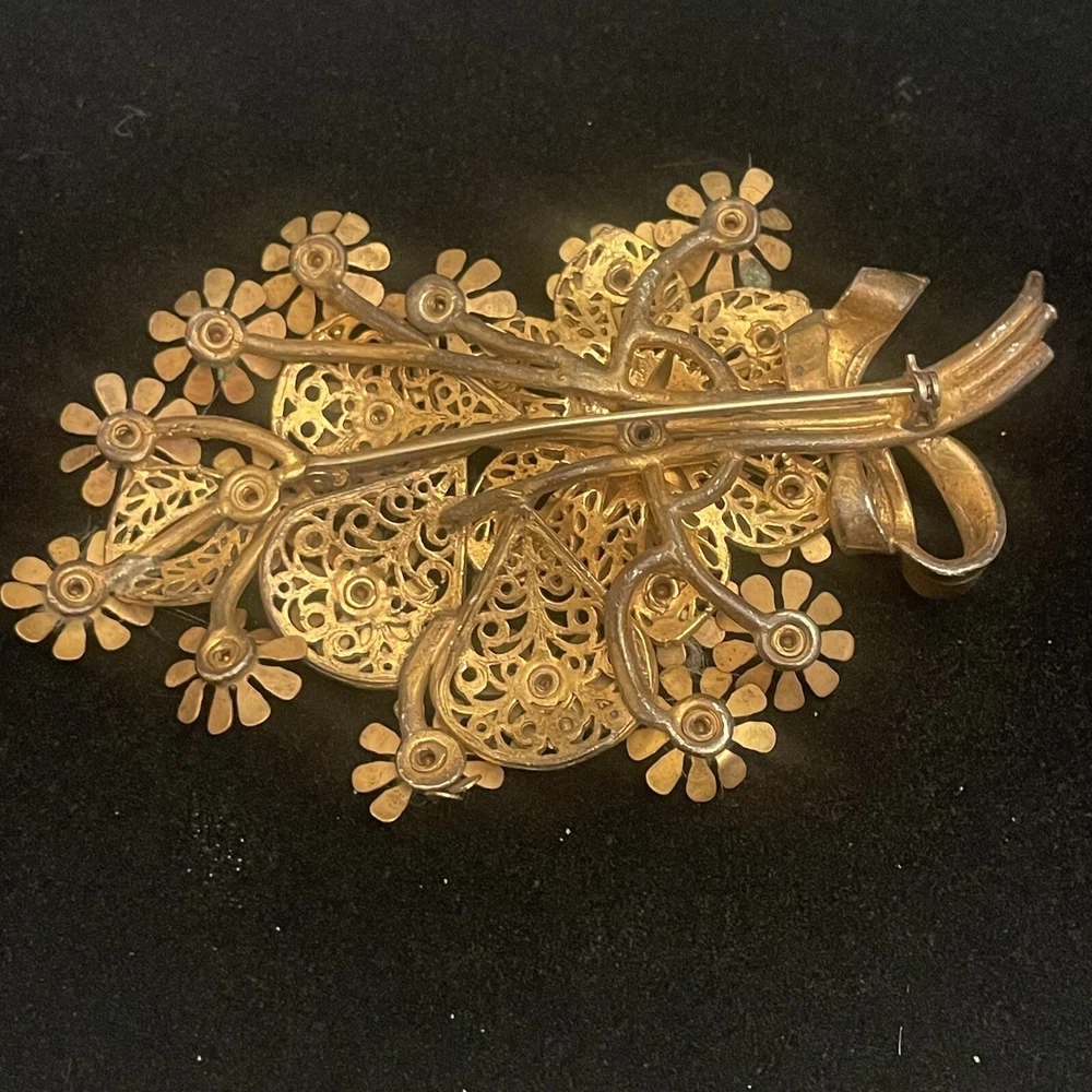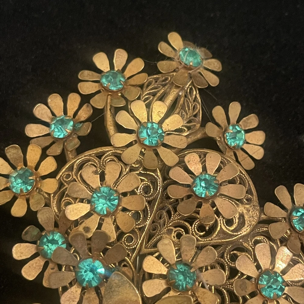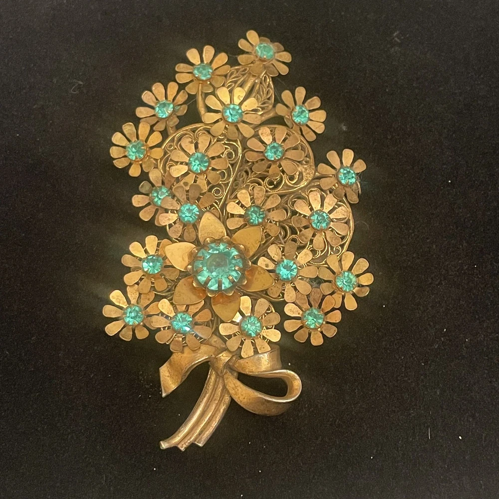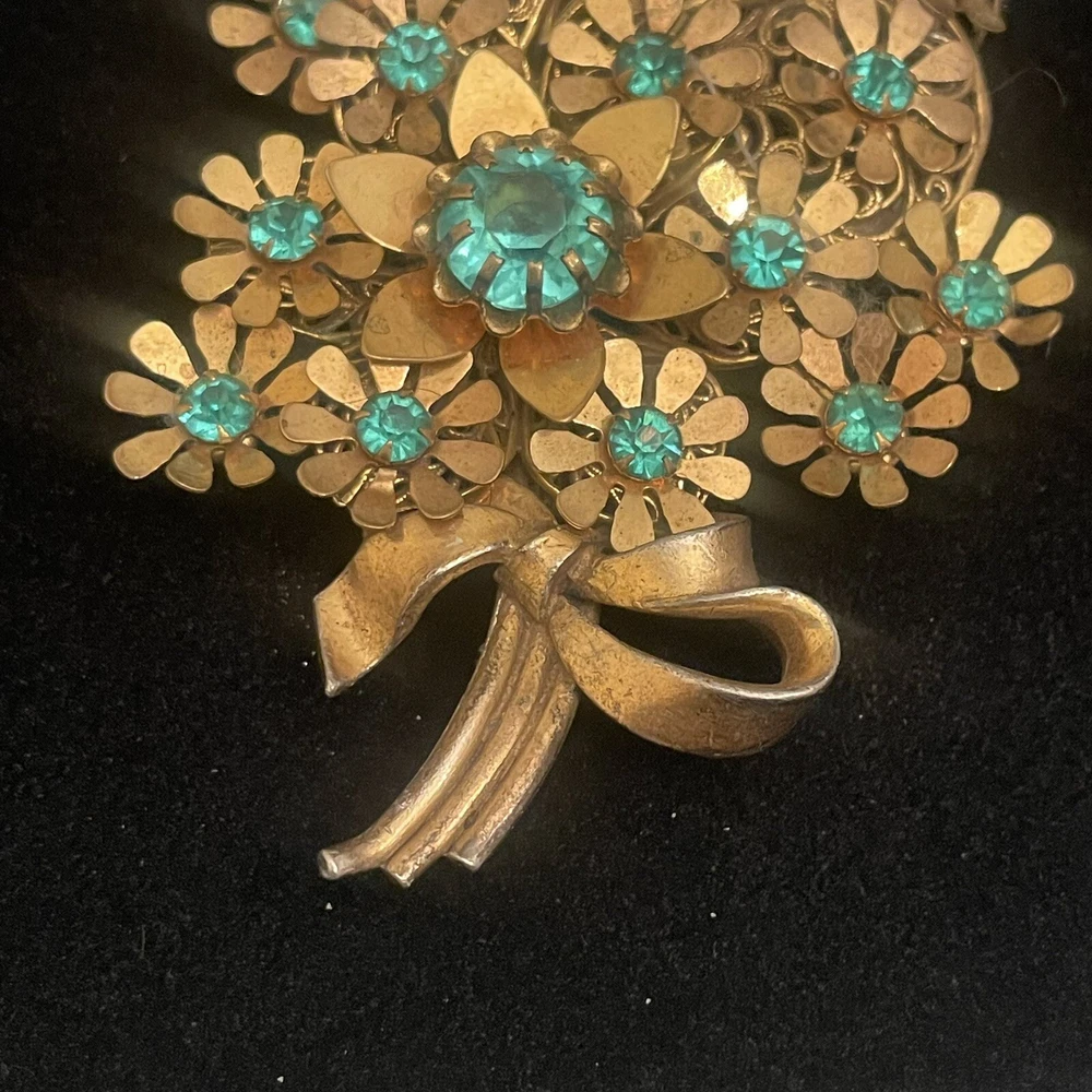 VTG Metal Floral Bouquet Ribbon Tied Brooch Aqua Rhinestones Shows Some Age & Wear. SEE ALL PICTURES