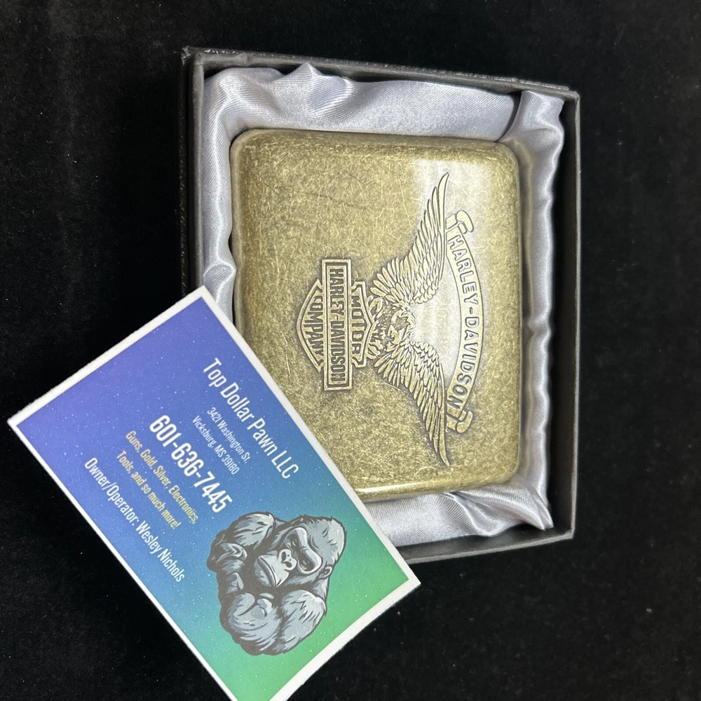 The vintage metal cigarette case is a bronze box designed in a retro Harley style, featuring a double-sided design for holding tobacco products. This tobacciana collectible showcases a unique and stylish appearance, making it a desirable item for collectors or those looking for a vintage accessory to store cigarettes. The intricate details and design of the case reflect a bygone era of tobacco culture, adding a touch of nostalgia to the item.
