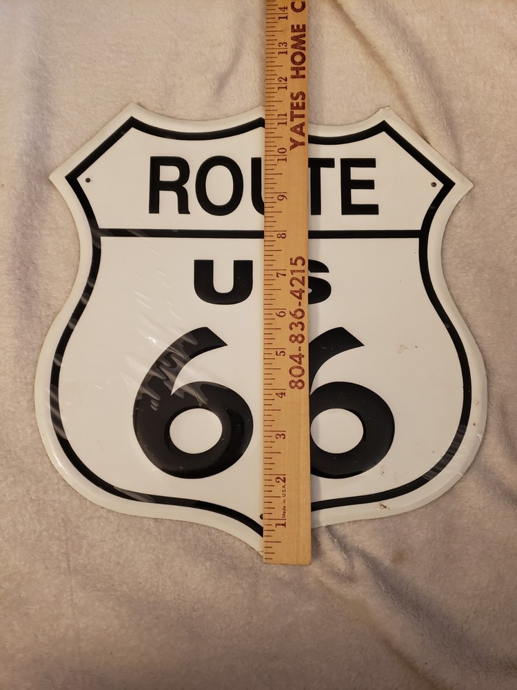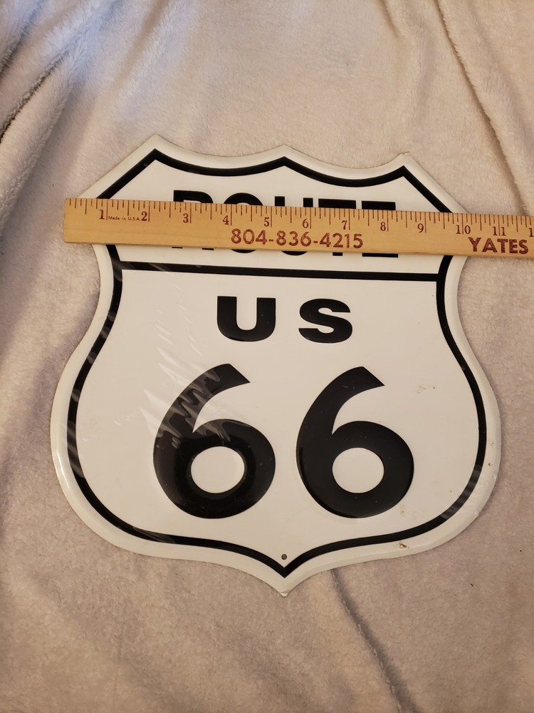 This Vintage Metal US Route 66 Road Sign measures 11" x 11 1/2" and is new in wrapped plastic, making it a perfect addition to any mancave or collection. The white sign features the iconic Route 66 branding and is a reproduction of the original advertising piece. Made in the United States, this sign captures the nostalgia and theme of gas & oil, making it a must-have for collectors of Route 66 memorabilia.