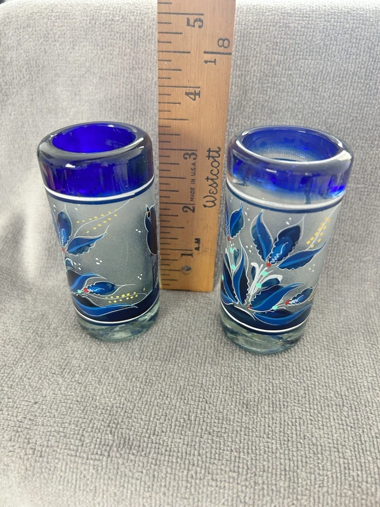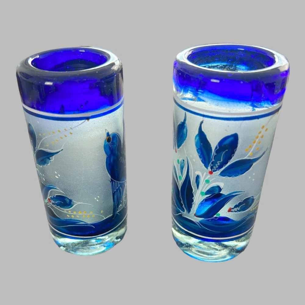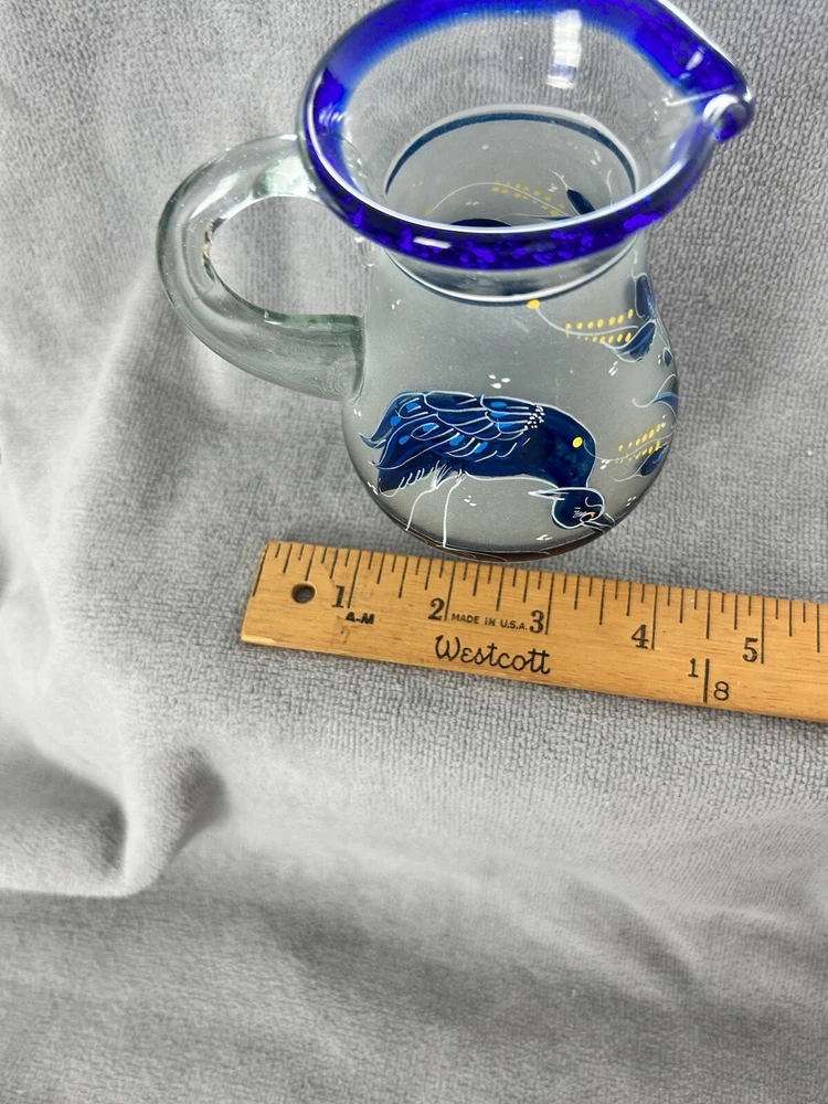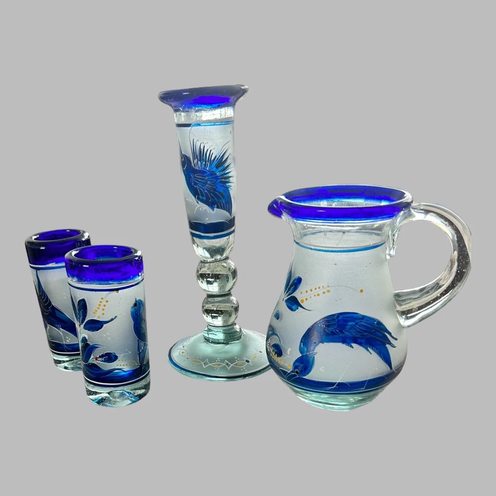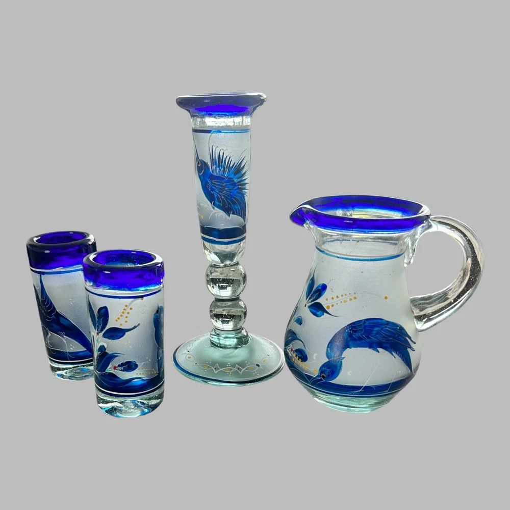 Add a touch of vintage style to your kitchen with this stunning four-piece glassware set. Featuring a beautifully hand-painted bird pattern in blue and frosted glass, this set includes a mini pitcher, two glasses, and a candlestick. Made of high-quality glass and crafted in Mexico, this set is both functional and decorative. Perfect for entertaining or as a thoughtful gift, this set is sure to impress. The mini pitcher and glasses are the perfect size for cordials or cocktails, while the candlestick adds a cozy touch to any table setting. With measurements included in the photos, you can be sure that this set will fit perfectly into your home décor.