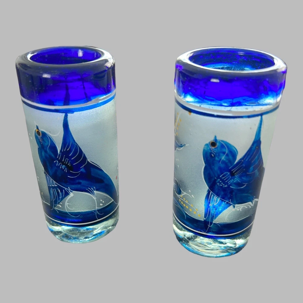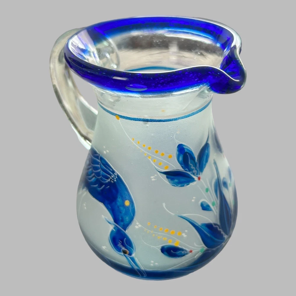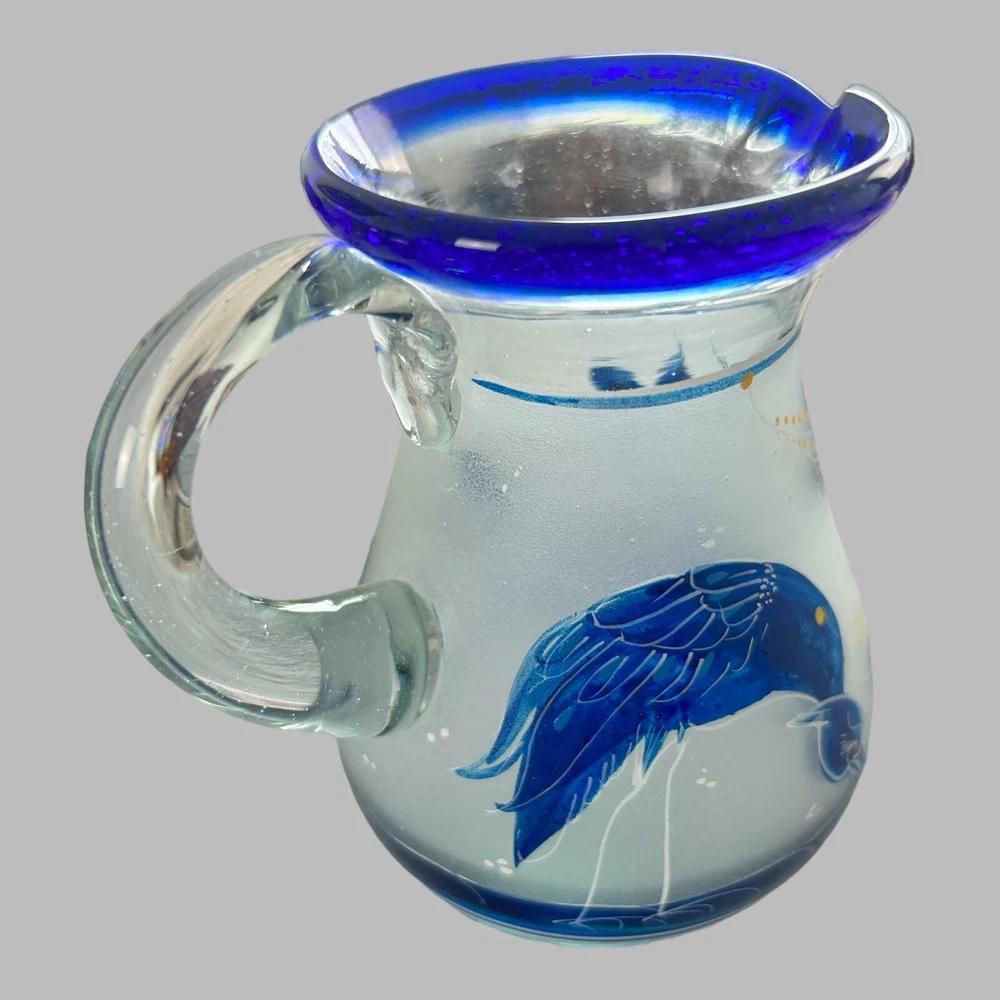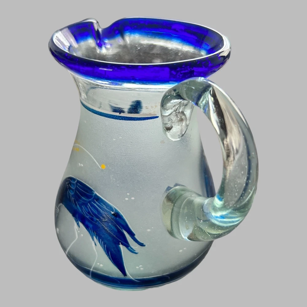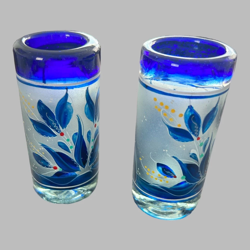 Add a touch of vintage style to your kitchen with this stunning four-piece glassware set. Featuring a beautifully hand-painted bird pattern in blue and frosted glass, this set includes a mini pitcher, two glasses, and a candlestick. Made of high-quality glass and crafted in Mexico, this set is both functional and decorative. Perfect for entertaining or as a thoughtful gift, this set is sure to impress. The mini pitcher and glasses are the perfect size for cordials or cocktails, while the candlestick adds a cozy touch to any table setting. With measurements included in the photos, you can be sure that this set will fit perfectly into your home décor.