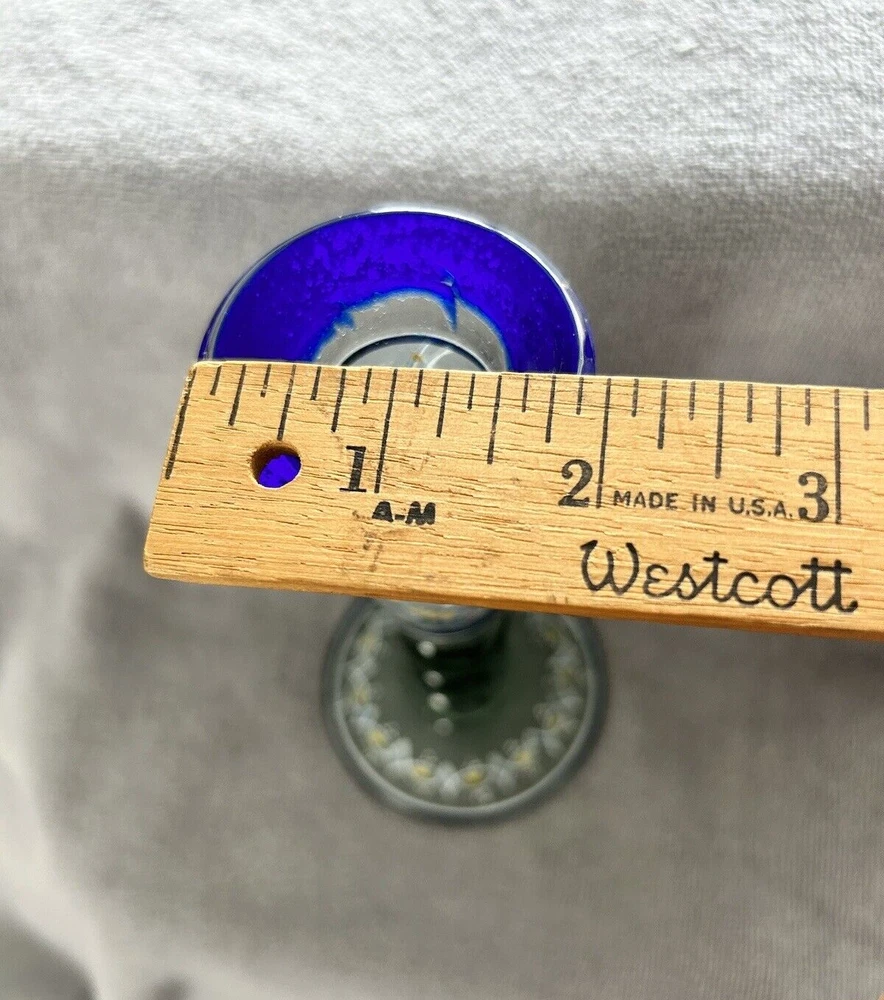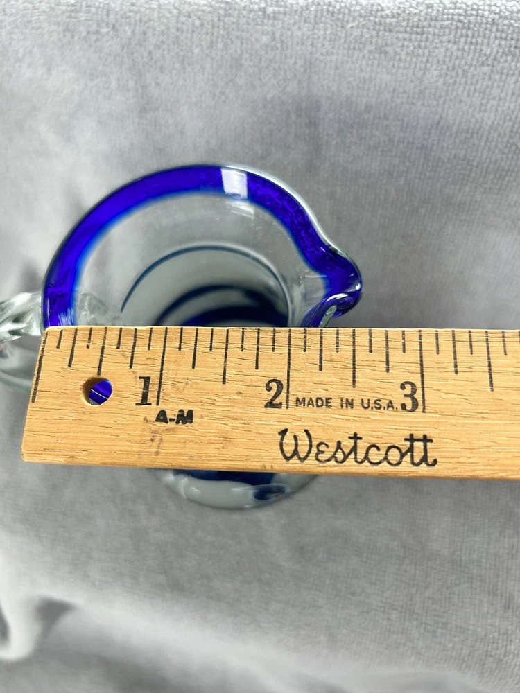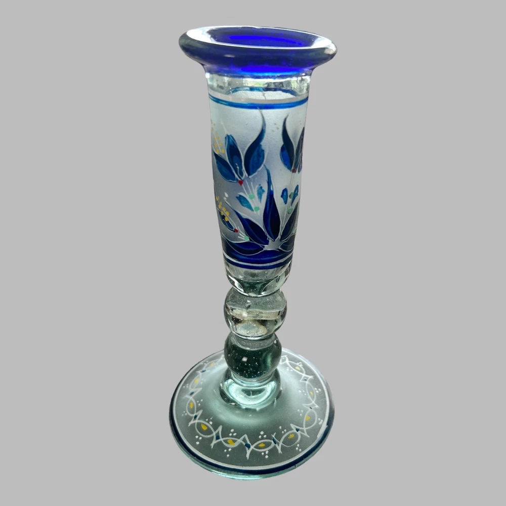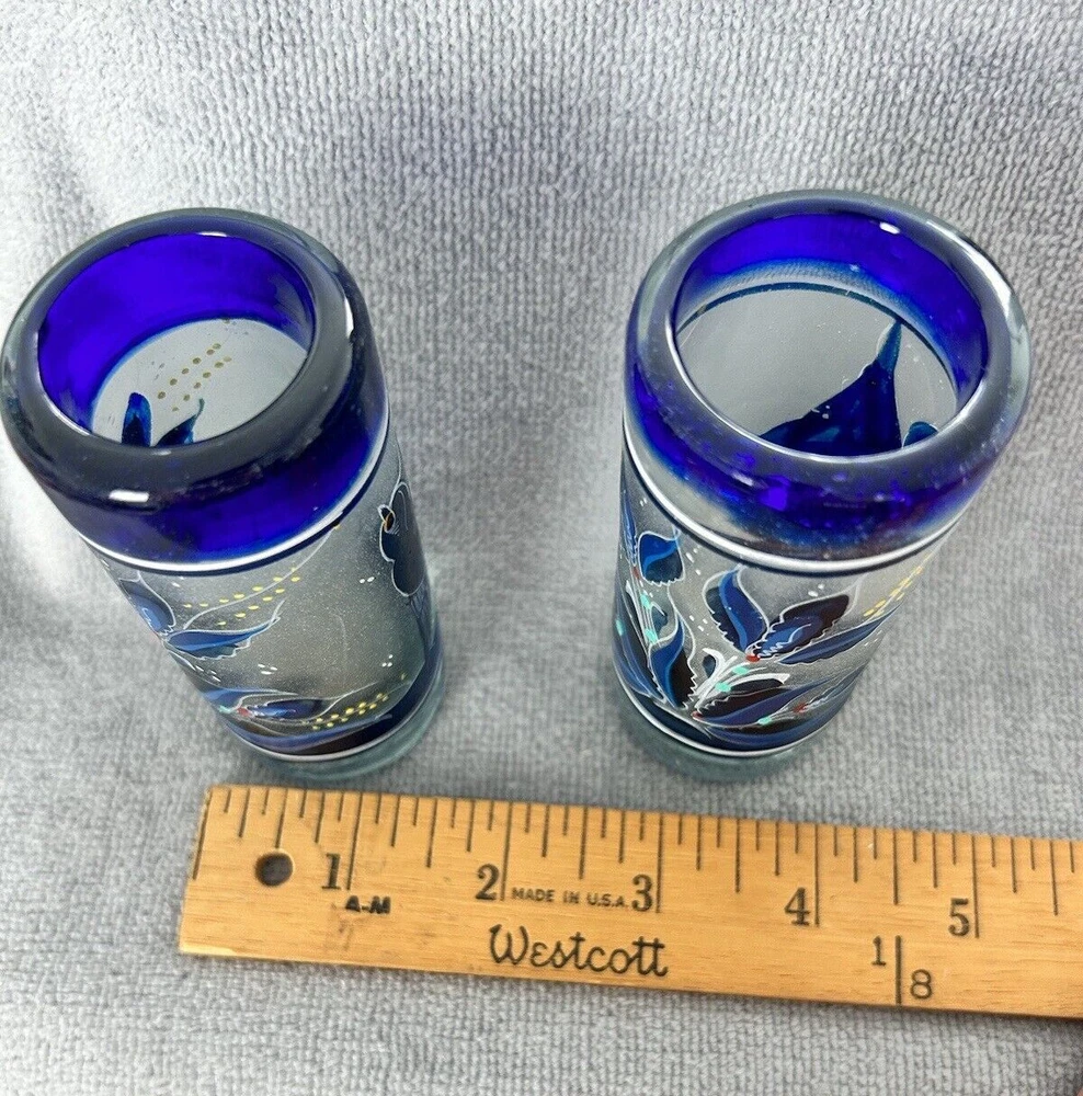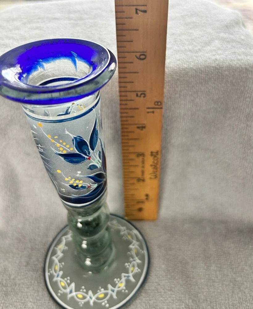Add a touch of vintage style to your kitchen with this stunning four-piece glassware set. Featuring a beautifully hand-painted bird pattern in blue and frosted glass, this set includes a mini pitcher, two glasses, and a candlestick. Made of high-quality glass and crafted in Mexico, this set is both functional and decorative. Perfect for entertaining or as a thoughtful gift, this set is sure to impress. The mini pitcher and glasses are the perfect size for cordials or cocktails, while the candlestick adds a cozy touch to any table setting. With measurements included in the photos, you can be sure that this set will fit perfectly into your home décor.