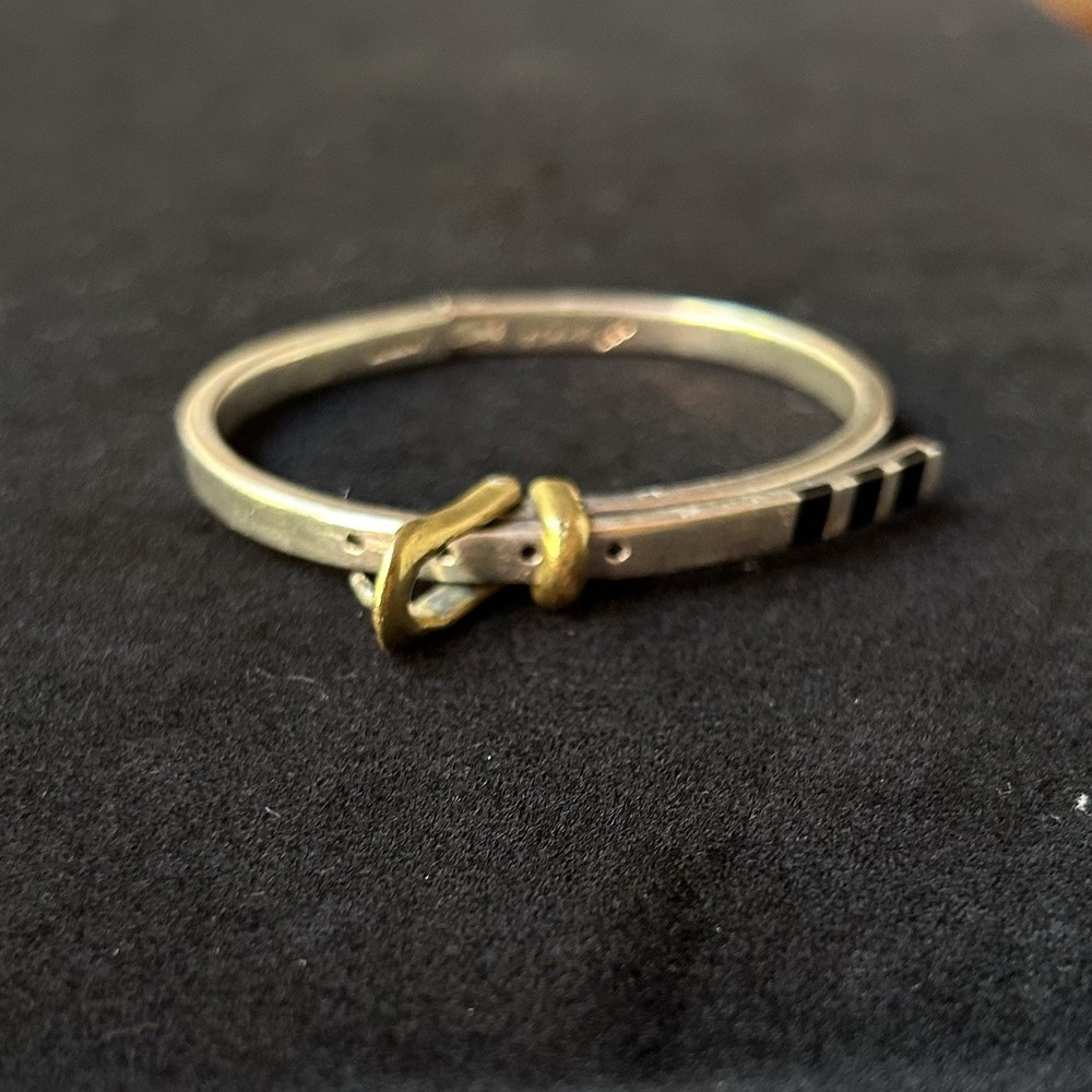 This adjustable bangle is so clever and unique! I love how it works like a real buckle, and the mix of silver, brass, and onyx gives it such a cool, authentic vibe. It's a fantastic conversation piece and fits perfectly.