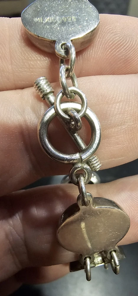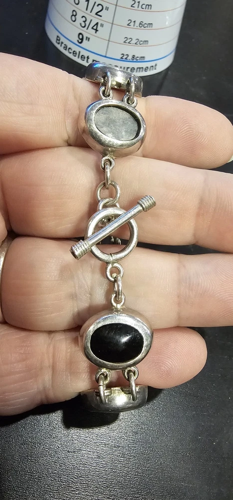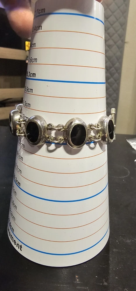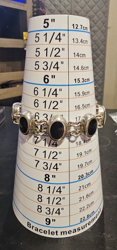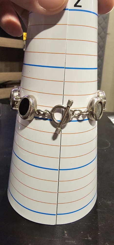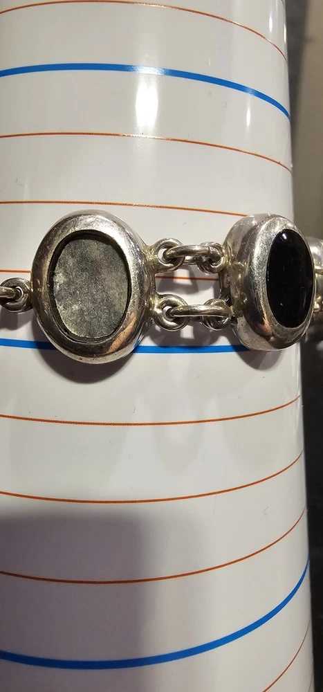 ✨ Vintage Mexican Sterling Silver Black Onyx Panel Bracelet – 36g – Classic Taxco Style ✨ A beautiful vintage Mexico 925 sterling silver panel bracelet featuring bold oval black cabochons set in smooth polished bezels and connected with double links. This design is a classic Taxco-style Mexican modernist bracelet known for its clean lines and substantial weight. The bracelet measures 7 inches and weighs an impressive 36 grams, giving it a solid and luxurious feel on the wrist. One cabochon is currently missing, making this a perfect restoration opportunity or a great piece for someone who works with jewelry repair or stone setting. Replacement stones for this style are inexpensive and easy to source. Even as-is, the bracelet presents beautifully and retains strong vintage character. Details • Metal: Solid Sterling Silver (.925) • Marked: Mexico 925 • Weight: 36 grams • Length: 7 inches • Stone: Black Onyx / Black Cabochon style • Era: Vintage (likely 1970s–1990s) • Closure: Toggle clasp • Condition: Good vintage condition with one missing cabochon Why Collectors Love These Mexican sterling jewelry—especially Taxco-style pieces—is highly collectible for its bold modernist designs and heavy silver construction. These bracelets layer beautifully or make a statement piece on their own. Condition Vintage pre-owned condition with normal wear and patina. One stone setting is empty (see photos). Bracelet is otherwise structurally solid. Shipping Carefully packaged and shipped securely. SEO Tags / Keywords vintage mexican bracelet mexico 925 bracelet taxco sterling bracelet sterling silver panel bracelet onyx sterling bracelet vintage onyx bracelet mexican silver jewelry 925 mexico jewelry taxco style bracelet heavy sterling bracelet black onyx sterling bracelet modernist silver bracelet vintage silver panel bracelet