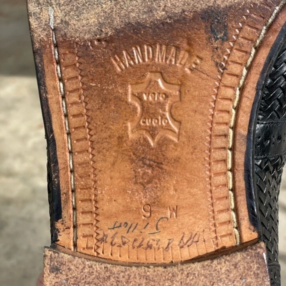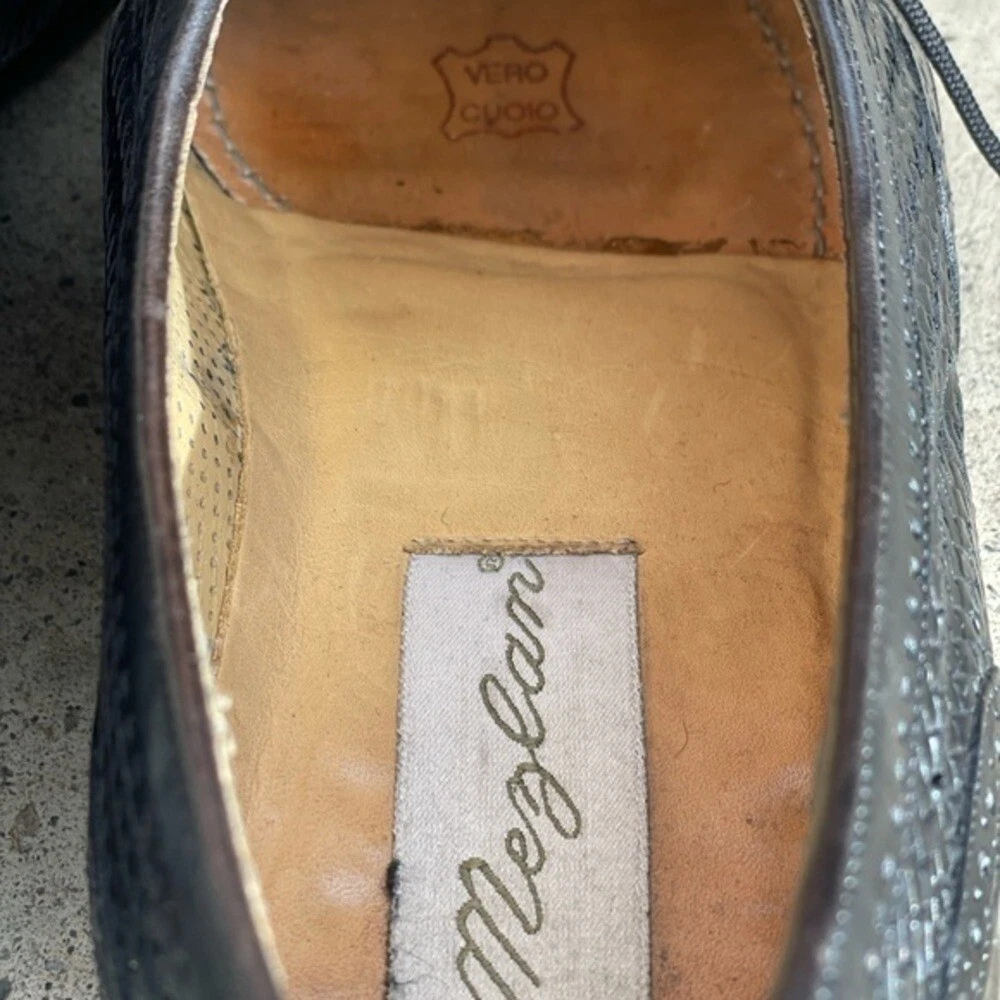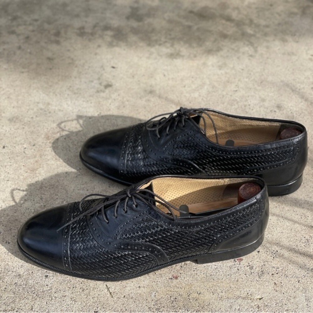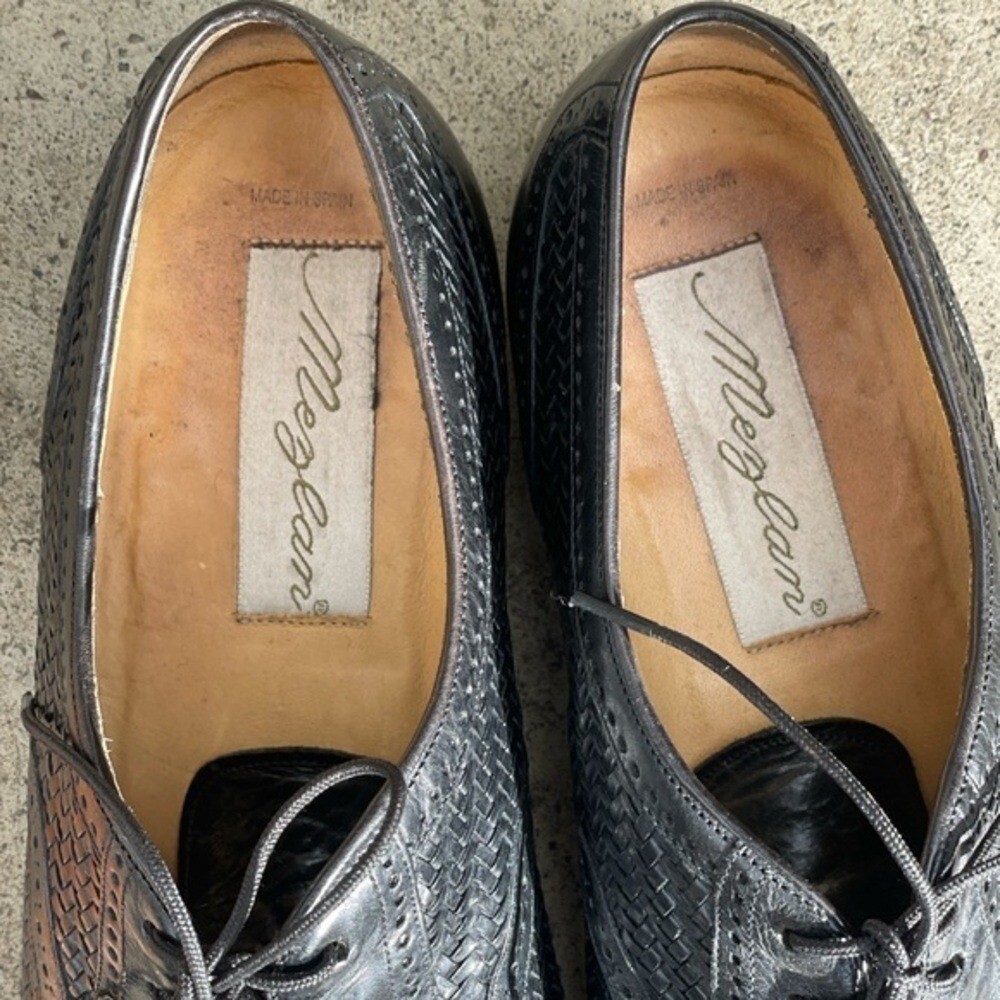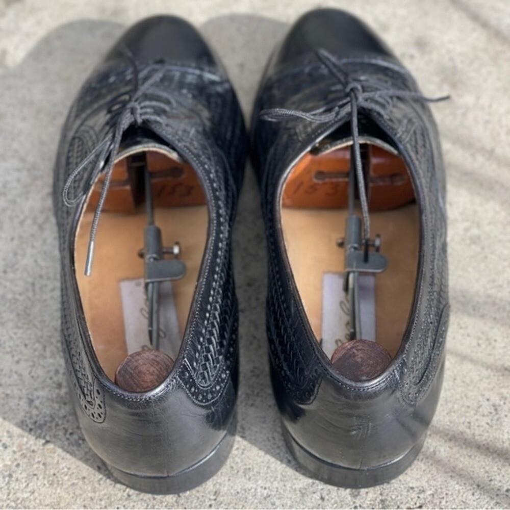Vintage Mezlan Martinique Black Woven Captoe Oxfords Men's size 9W Handmade Preworn condition Classic Oxford style with black polished leather uppers. There is cap toe with brogue detailing and across the length of the shoe and toe-box woven detailing. Stacked leather combination heals and leather soles. Handmade in Spain. Shoe tree not included