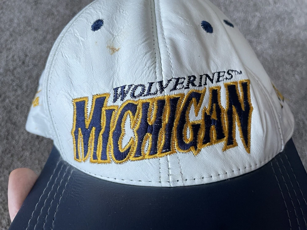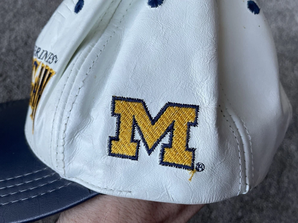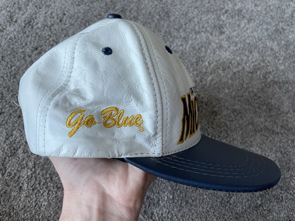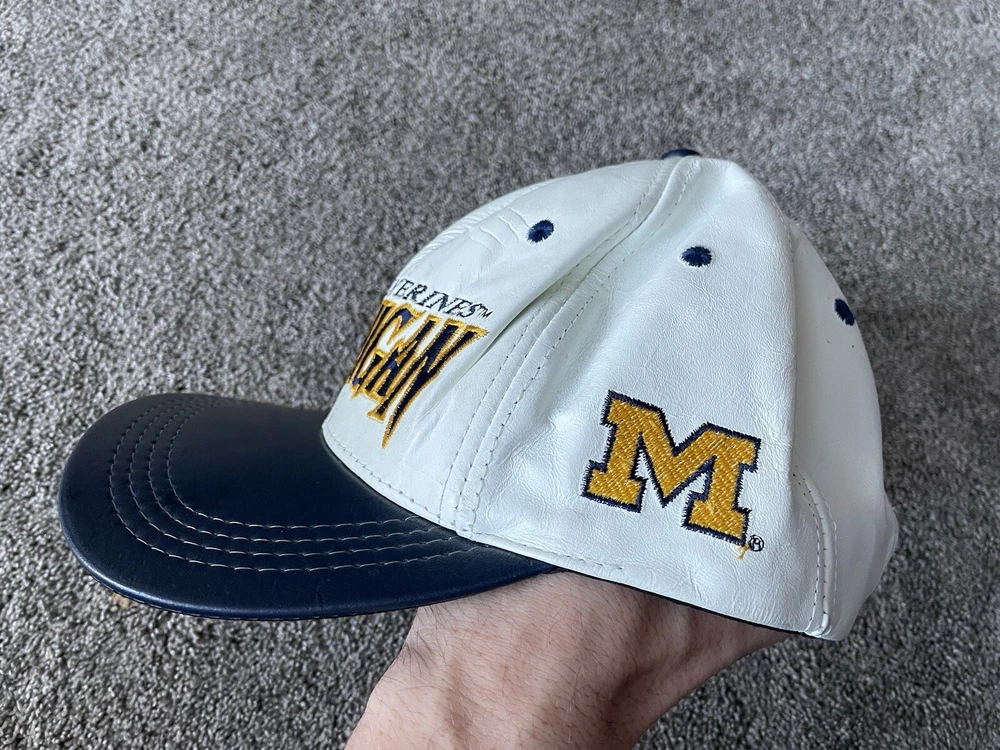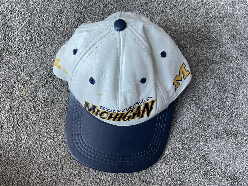 Show your support for the Michigan Wolverines with this vintage white snap-back hat. Made with genuine leather, this hat is perfect for any fan who loves football and wants to represent their team during the regular season and playoffs. The hat features the team's logo on the front and is one size fits all. This hat is a great addition to any fan's collection and is perfect for those who love vintage clothing. Made in the United States, this hat is a great way to show your patriotism while supporting your favorite team. Get your hands on this 90s-era hat today and complete your fan gear!