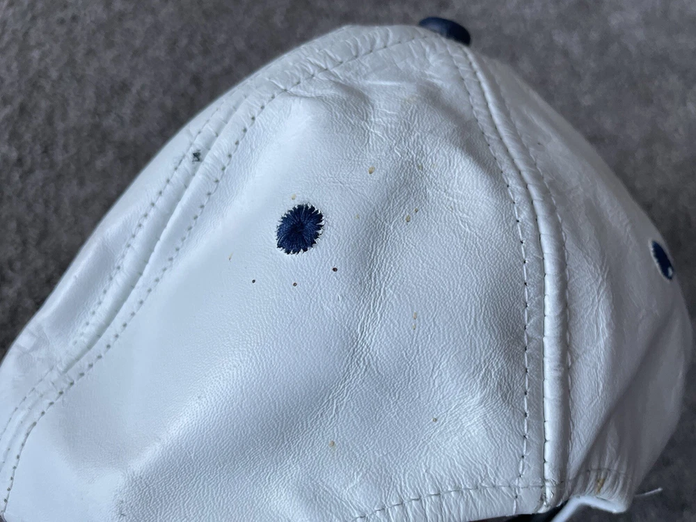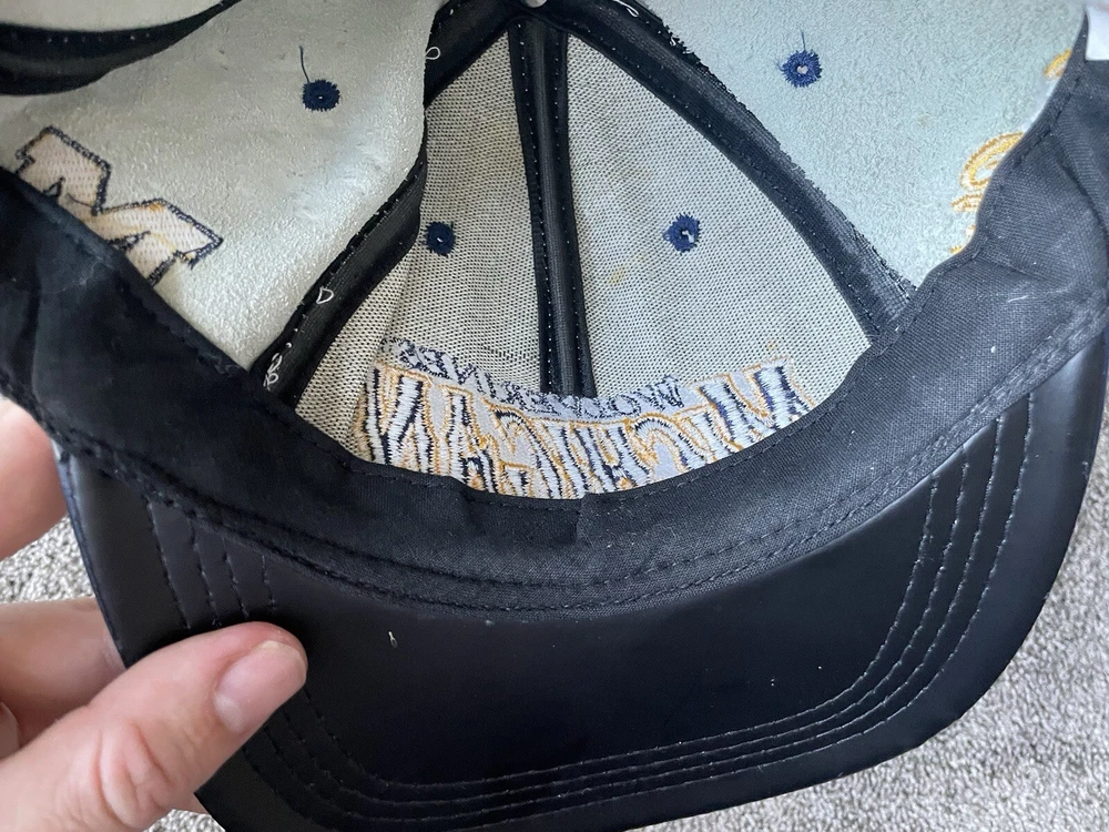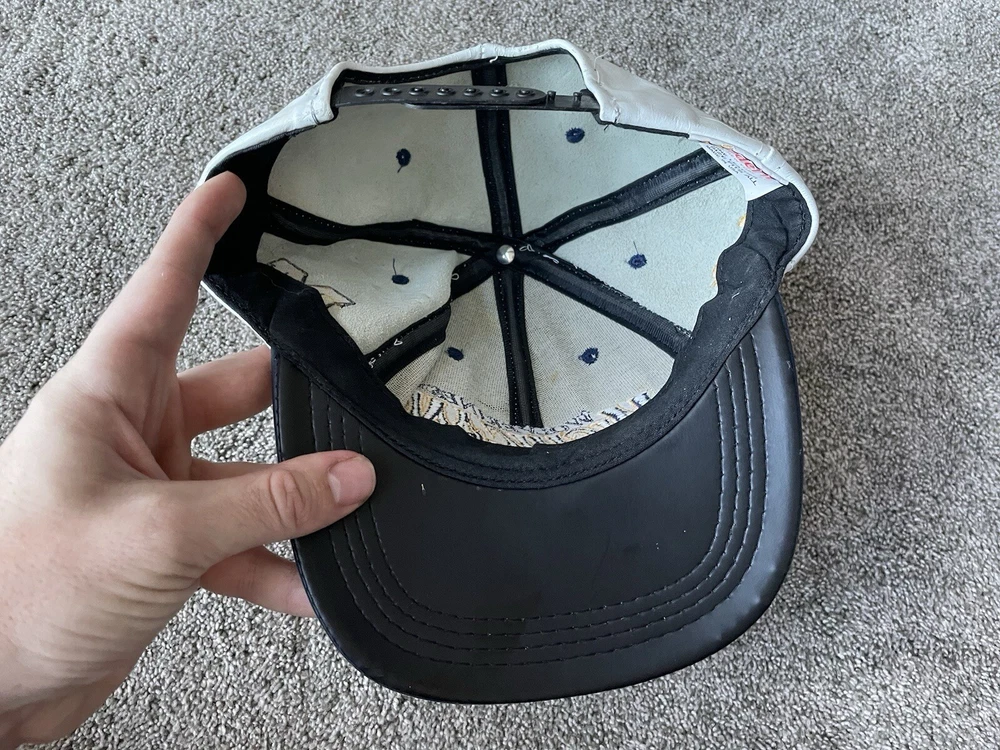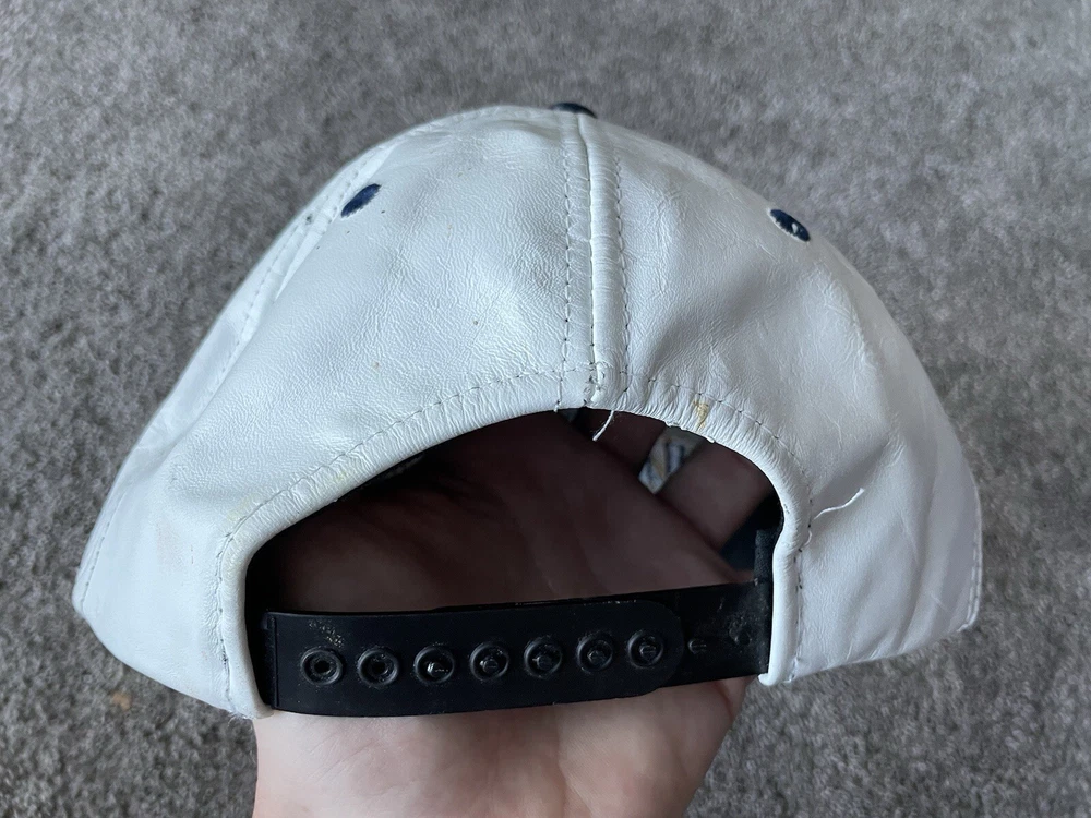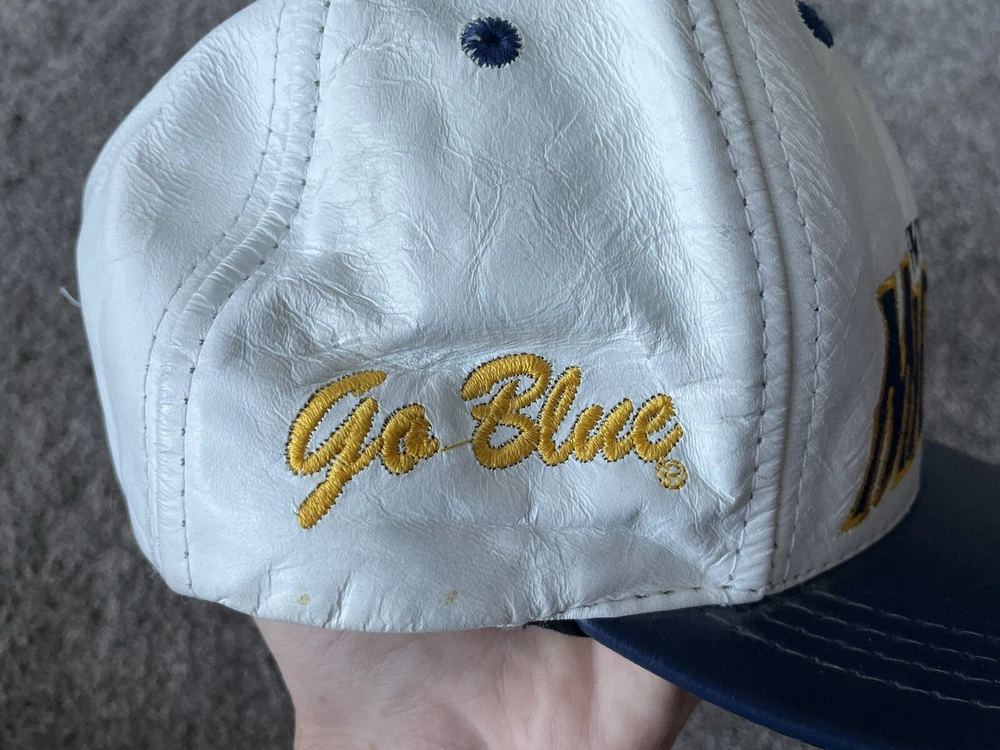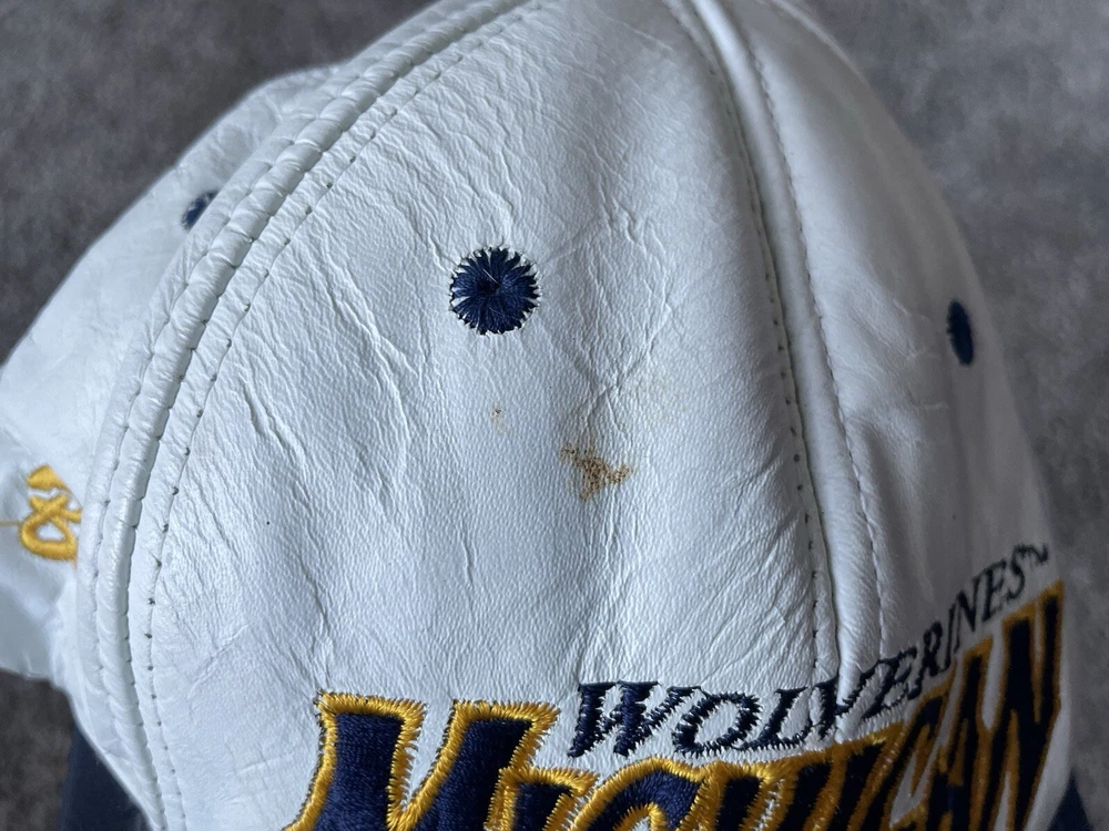 Show your support for the Michigan Wolverines with this vintage white snap-back hat. Made with genuine leather, this hat is perfect for any fan who loves football and wants to represent their team during the regular season and playoffs. The hat features the team's logo on the front and is one size fits all. This hat is a great addition to any fan's collection and is perfect for those who love vintage clothing. Made in the United States, this hat is a great way to show your patriotism while supporting your favorite team. Get your hands on this 90s-era hat today and complete your fan gear!
