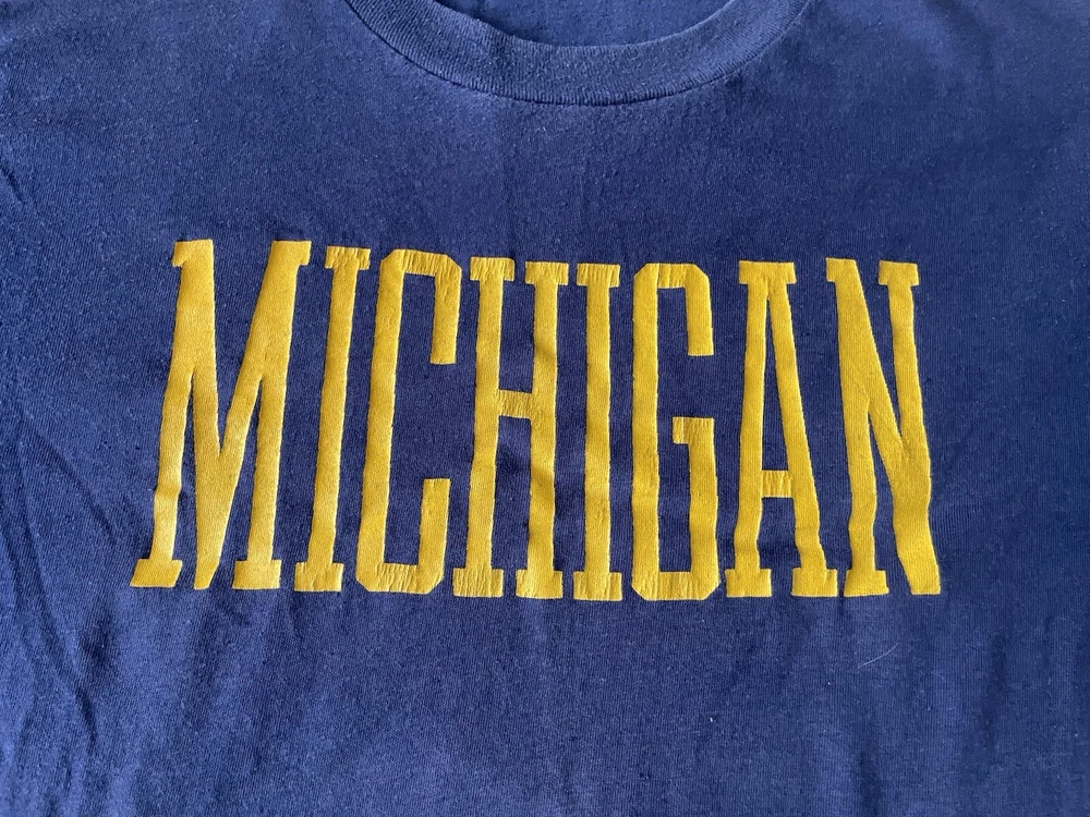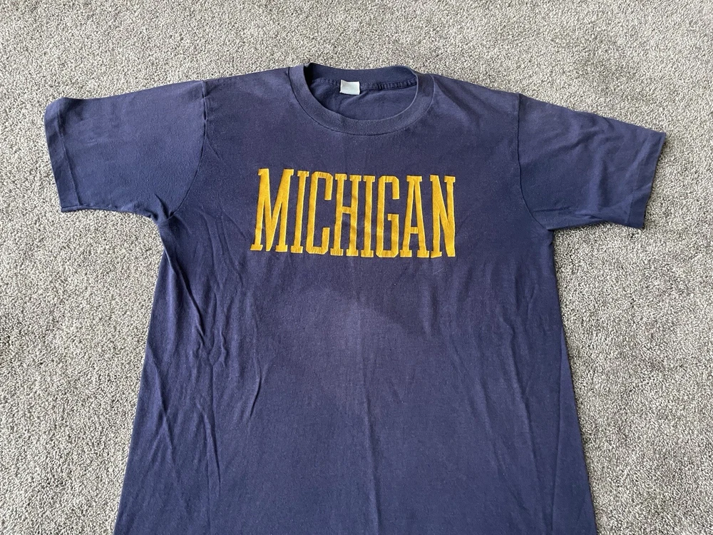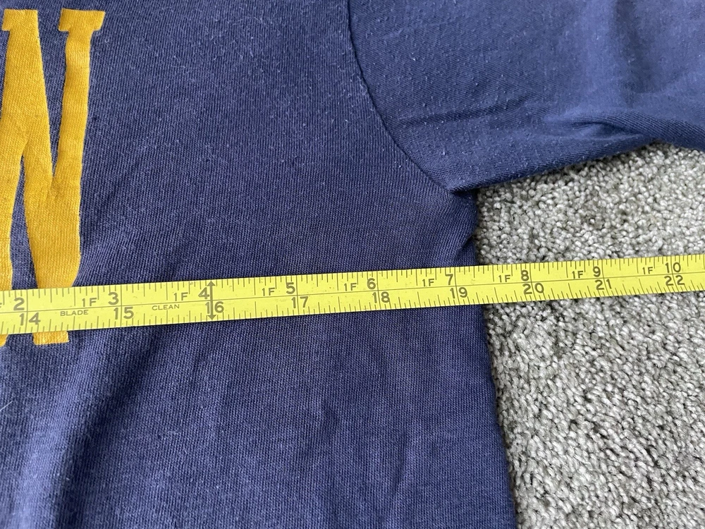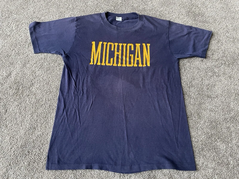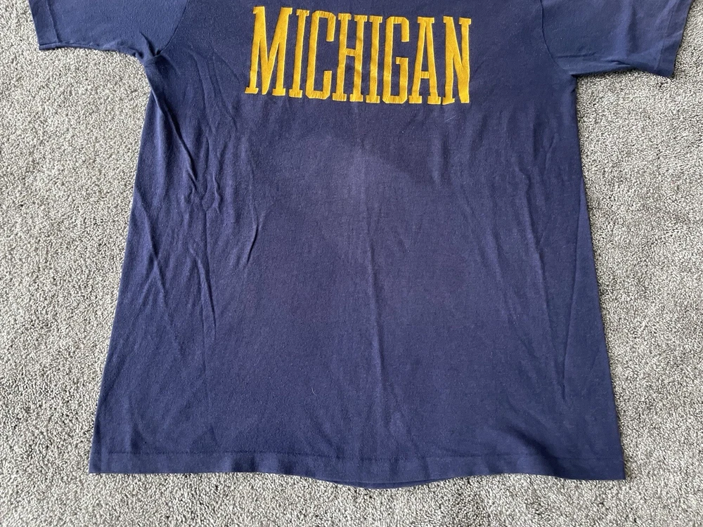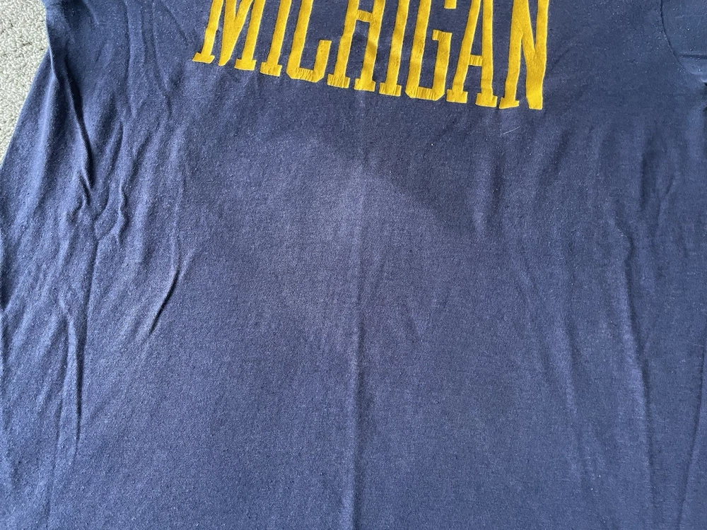 Show off your love for the Michigan Wolverines with this vintage Artex shirt. The blue shirt features a bold spell out of the team's name, perfect for any fan looking to represent during the regular season or playoffs. The shirt is a men's size large and has a classic 70s faded distressed look that any vintage collector would love. Made in the United States, this shirt is a must-have for any true fan of the team and is perfect for any college-NCAA sports memorabilia collection. Whether you're a student, alumni, or just a fan of the sport, this shirt is a great addition to any wardrobe.