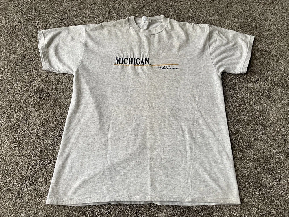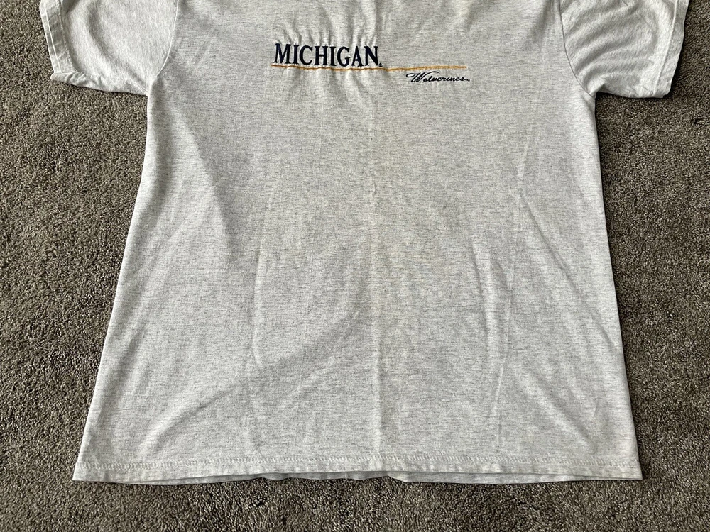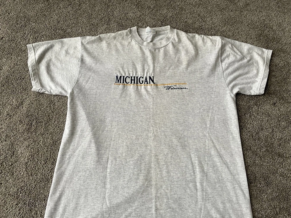 Crafted by Apparel Sales Company, this vintage Michigan Wolverines shirt is a testament to classic college football fandom. The shirt features a bold, embroidered spell-out of the team's name, showcasing the iconic gray color that's perfect for game day or everyday wear. Designed for the regular season and beyond, it's a must-have for any die-hard fan looking to show their team spirit. With a comfortable size large fit, this shirt is made for men who want to represent their allegiance to the Michigan Wolverines. Made in the United States, it's a piece of fan memorabilia that captures the spirit of the playoffs and the fervor of college sports. Whether you're at the stadium or out with friends, this shirt is sure to be a conversation starter.