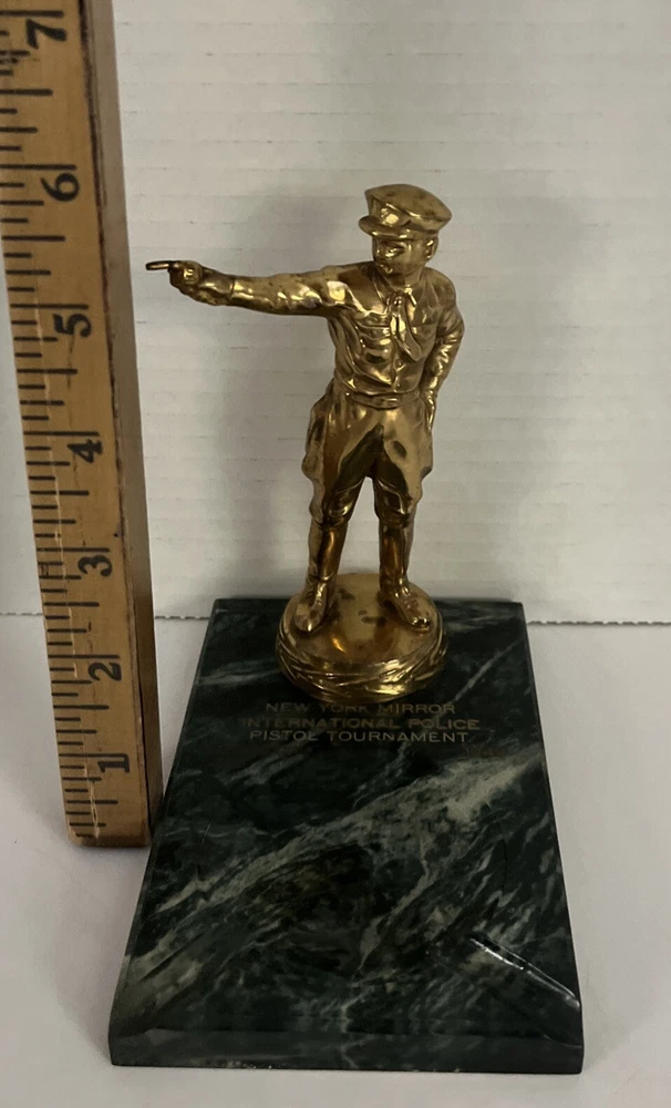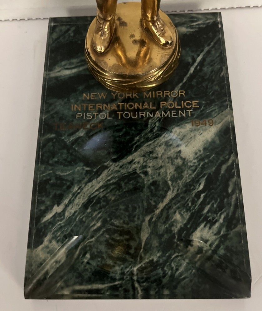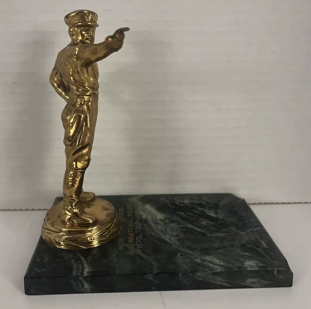 Mid Century Brass Police Shooting Trophy With Resin Ashtray Figural trophy ashtray is in very nice condition. The police figure is brass and the ashtray is some kind of resin. I believe this is mid century.