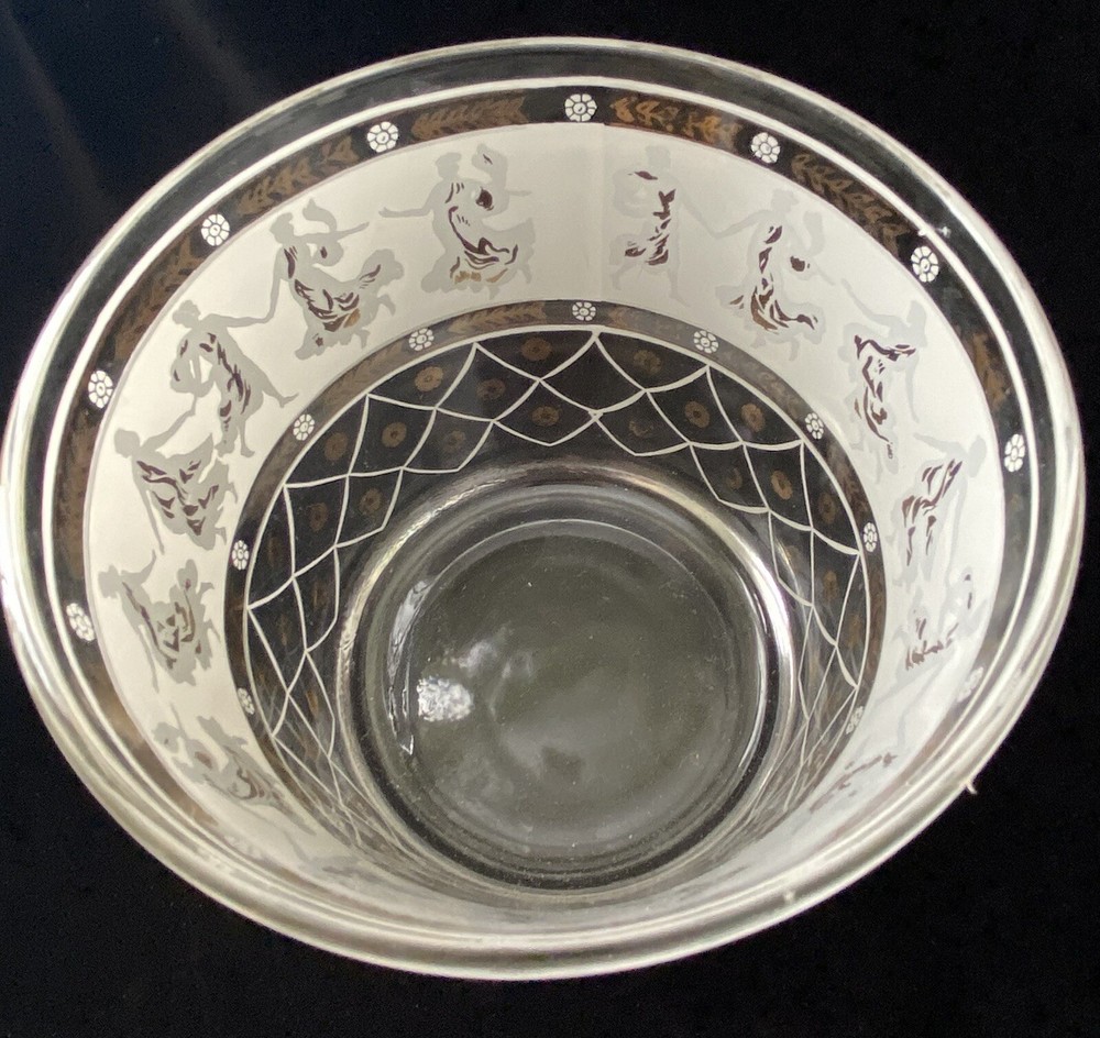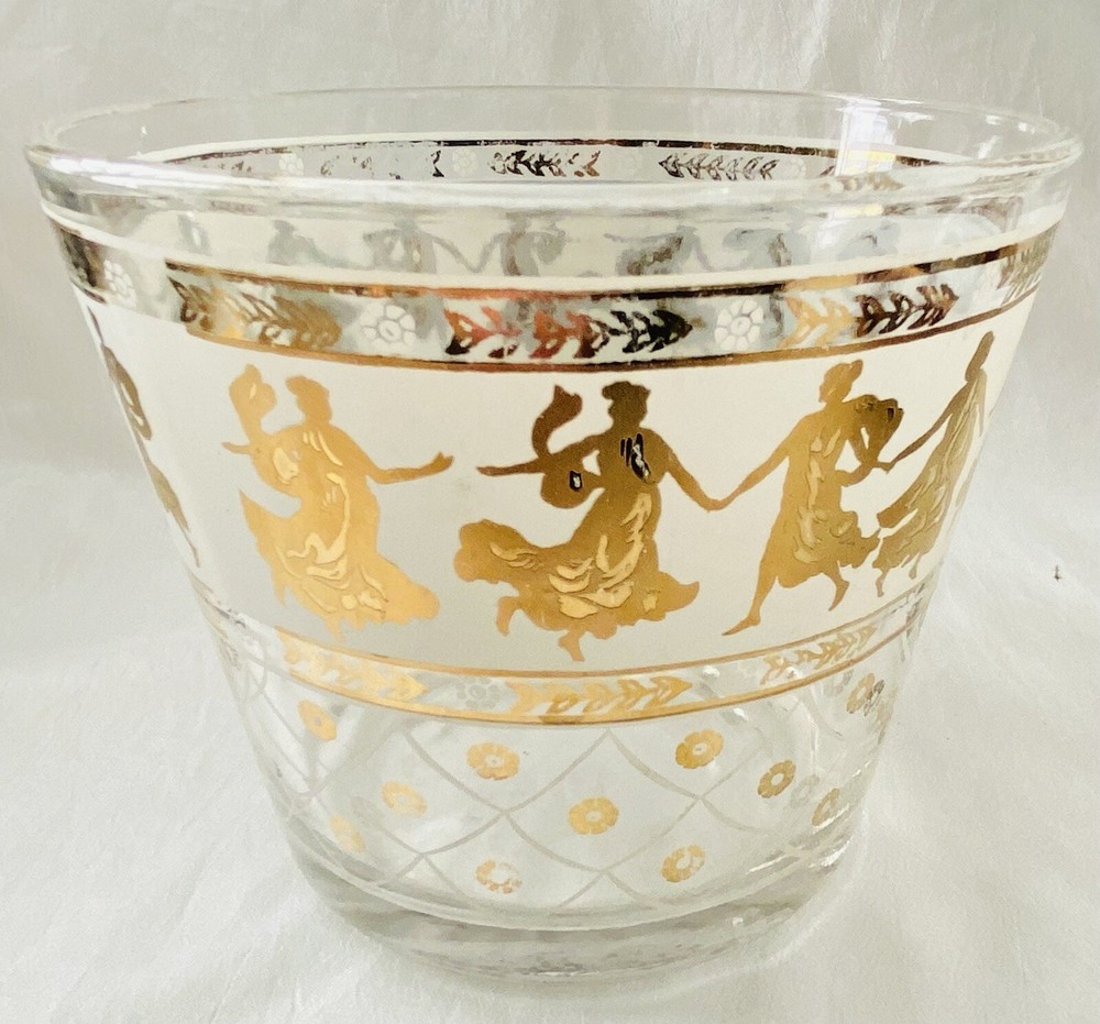 Description: For your bidding consideration is a Vintage MidCentury Glass Ice Bucket with Gold Grecian Figures and White Lattice Work onthe bottom with Gold Florets. The glass bucket measures 4 & ¾” high and 5& ¾” in diameter. Please see the other items that I have listed on ~objet_de_arto ~ MY POLICIESPLEASE READ - IF BID YOU AGREE: Payment: PLEASE make payment within TWO days of the end of the auction . NOE-checks - PAYPAL ONLY ***Due to an increase of non-paying buyers, anunpaid item case will automatically be opened if payment is not made within 2days. Shipping: FAST shipping! I will ship your items to you thesame day I receive your payment whenever possible. When payments are made after2 p.m. Monday thru Friday or on weekends and Holidays I will ship your item thenext business day. Packing, time, gas supplies, and fees are included, soif shipping is high to you, please pass on my items, thank you. I amalways willing to combine shipping costs (combined shippingFirst Class or Priority, whichever is best for the items/quantity) whenmore than one item is purchased, so check out the other items that Ihave listed! Refunds: Only for gross errors. Not for remorse or very minor thingsas an excuse. Feedback: I appreciate your business and prompt payment. I leavepositive feedback and I appreciate you leaving me positive feedback too. If youhave any questions regarding your purchase please contact me before opening acase or leaving any neutral or negative feedback so that I can have theopportunity to resolve the issue so we both are happy! Thanks so much! Communication: Through eBay messages, please.