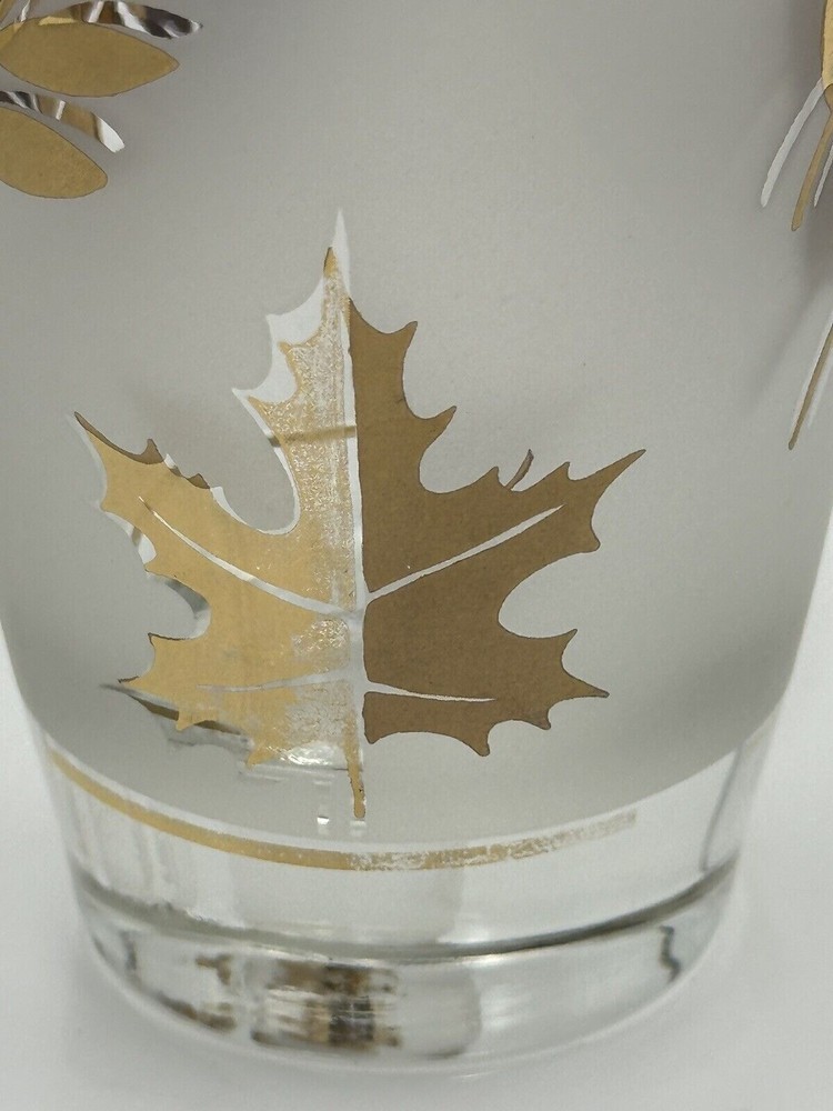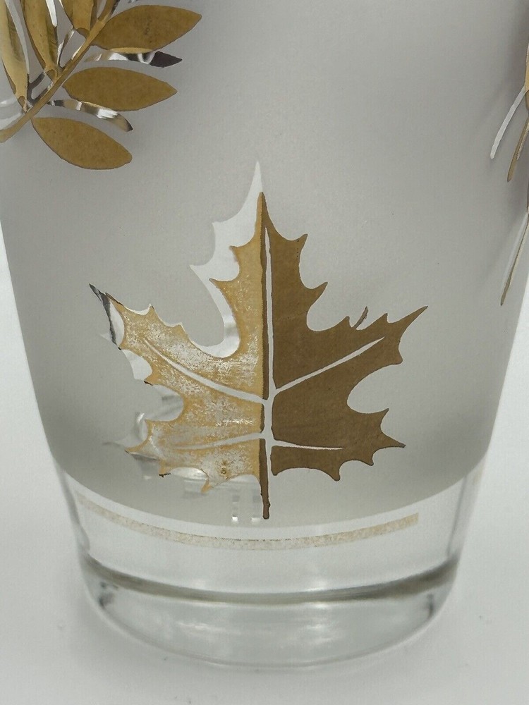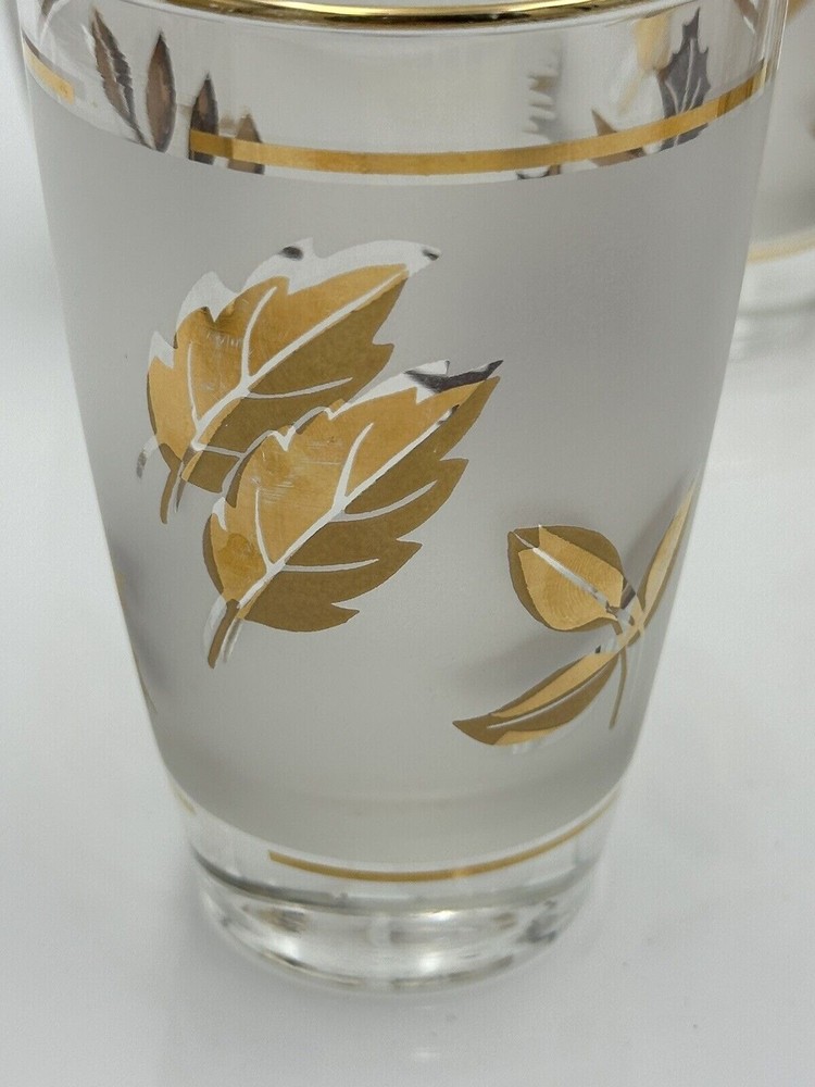 Vtg MCM Libbey Frosted Gold Leaf Golden Foliage Glasses 12 Oz Set Of (7) 4.5” Great condition with some of the gold rubbed off. I have taken pictures of each spot/place.