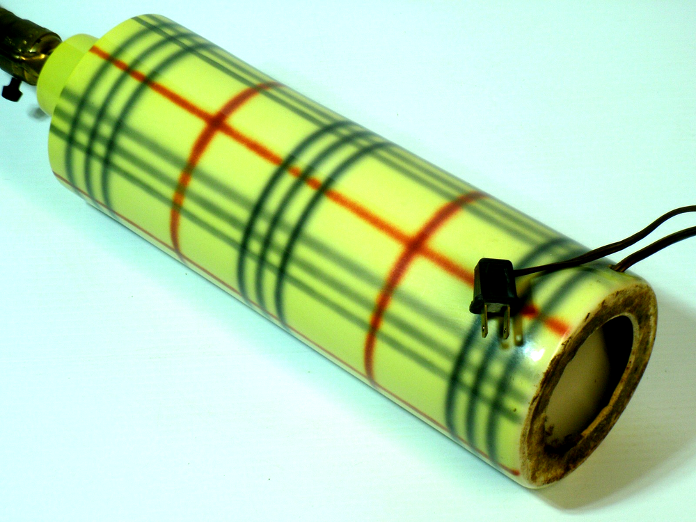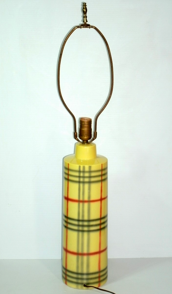 This vintage mid-century cylindrical porcelain table lamp features a geometric pattern. The lamp stands 29 inches high.