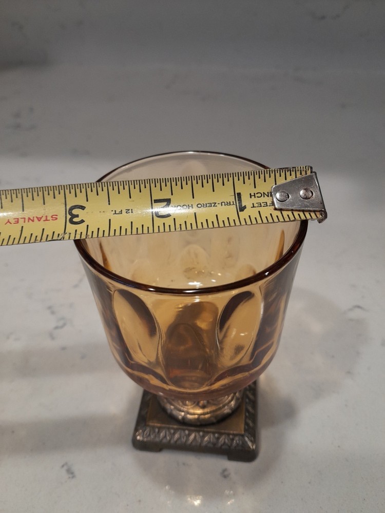 This Vintage MCM Cast Brass & Amber/Gold Glass Votive Tea Light/Candle Holder exudes a 1960s bohemian style with its art nouveau design, featuring an all-over pattern and a gold finish. Made of brass and glass, this candle holder is versatile for both indoor and outdoor use, making it suitable for any occasion. The unboxed and retired piece adds a unique touch to any home decor collection, reflecting the retro charm of the era. Beautiful Condition