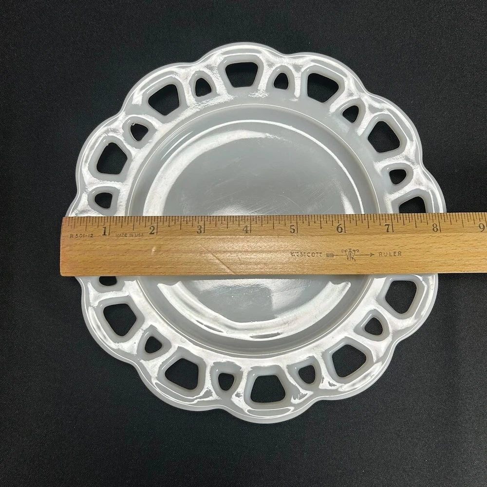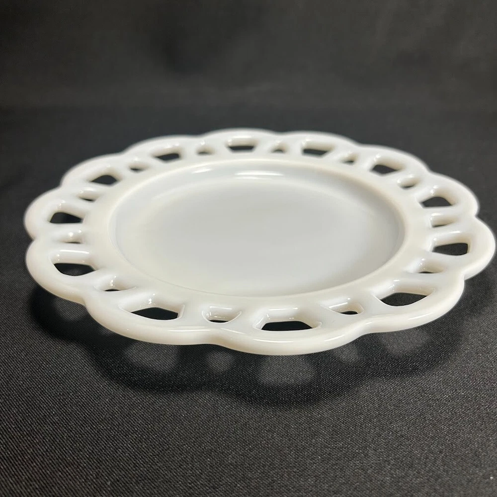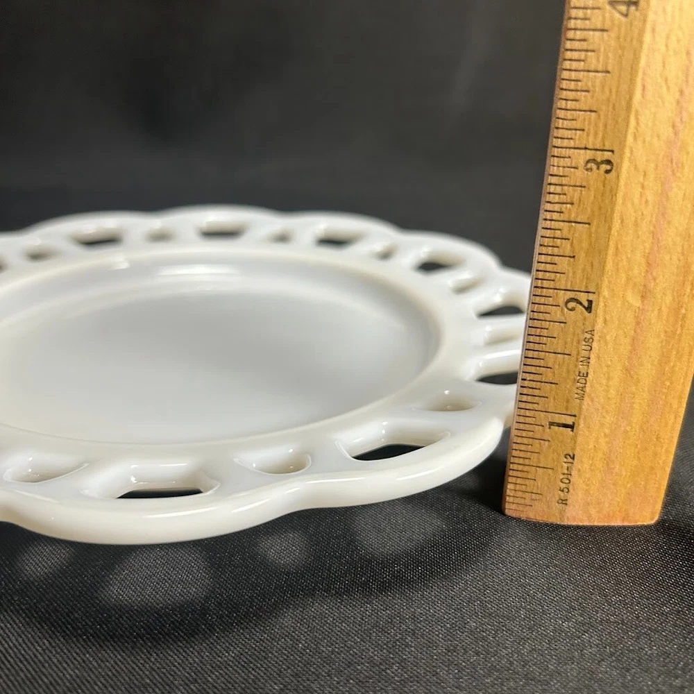 This vintage milk glass lace plate is a beautiful addition to any collection. The round plate measures 8.25 inches in diameter and features a delicate white color with a unique pattern. Made in the United States, this original piece is stackable and decorative, perfect for adding a touch of colonial style to any dining table. The plate is unmarked, but its quality and authenticity are undeniable. Whether you are a collector or simply looking for a unique piece of decorative cookware, this vintage milk glass plate is sure to impress.