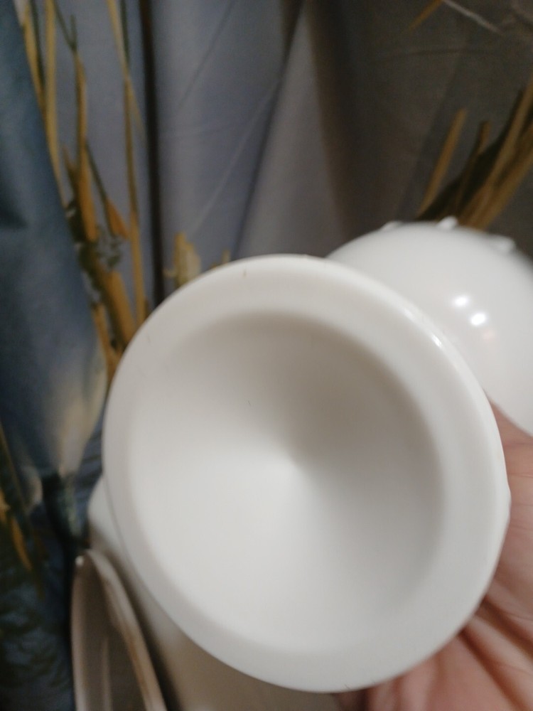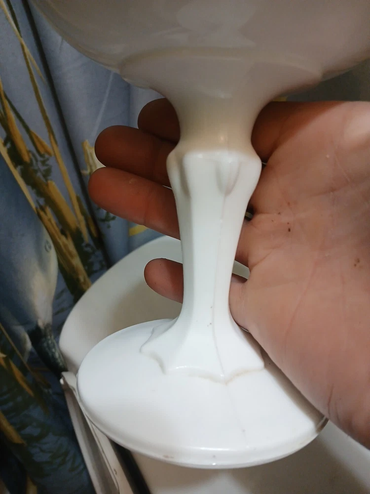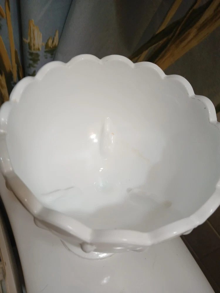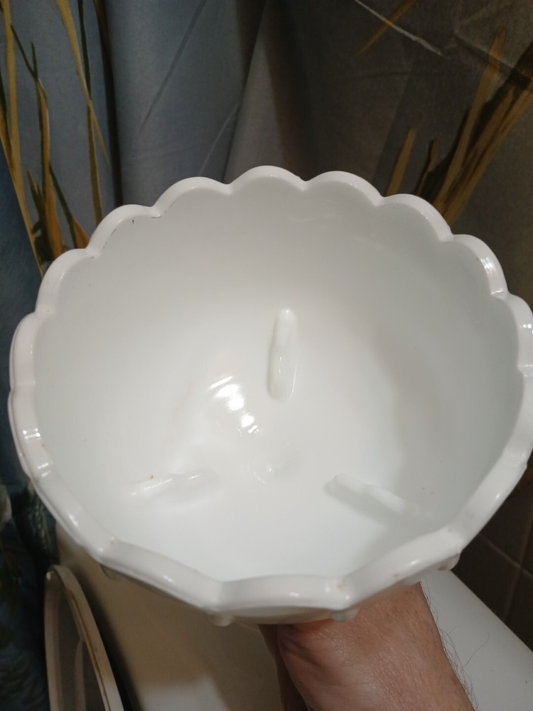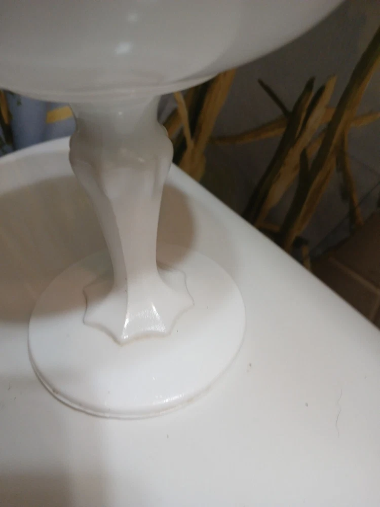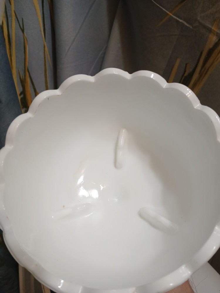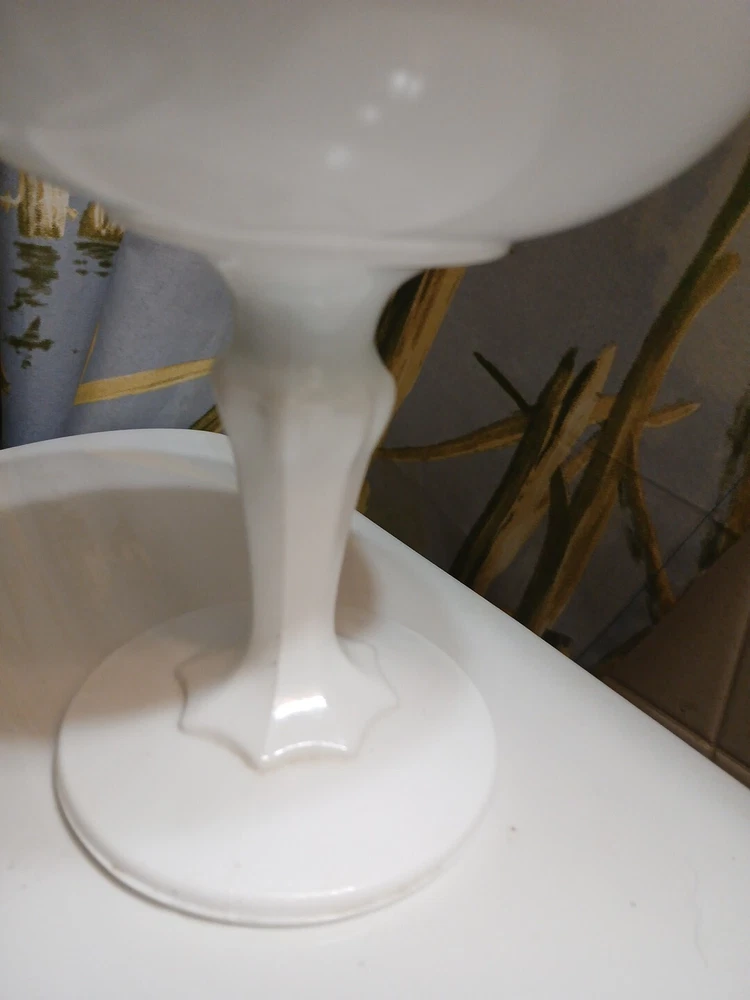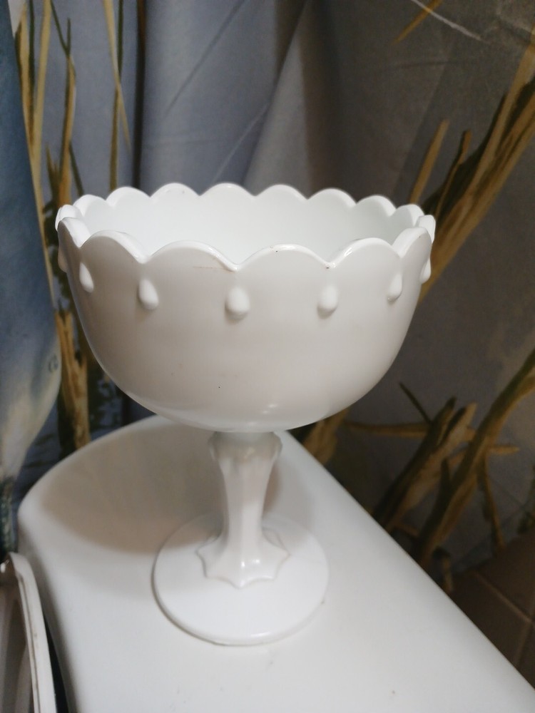 This vintage milk glass teardrop footed candy dish/compote bowl is a beautiful addition to any collection. Made in Indiana, the bowl features a laced edge and measures 7-1/2" tall. The white color and milk glass production style make it a perfect choice for any decor. The dish is perfect for serving candies, fruits, and other small treats. The bowl is a great example of vintage pattern and production style and is sure to be a conversation starter.