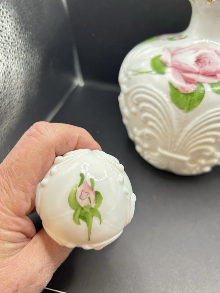This vintage milk glass decanter is a stunning piece with intricate handpainted pink roses, embodying the Victorian style. Made in the United States, this original decanter features a stopper and stands out with its white color and delicate design. Perfect for collectors or those looking to add a touch of elegance to their home decor.