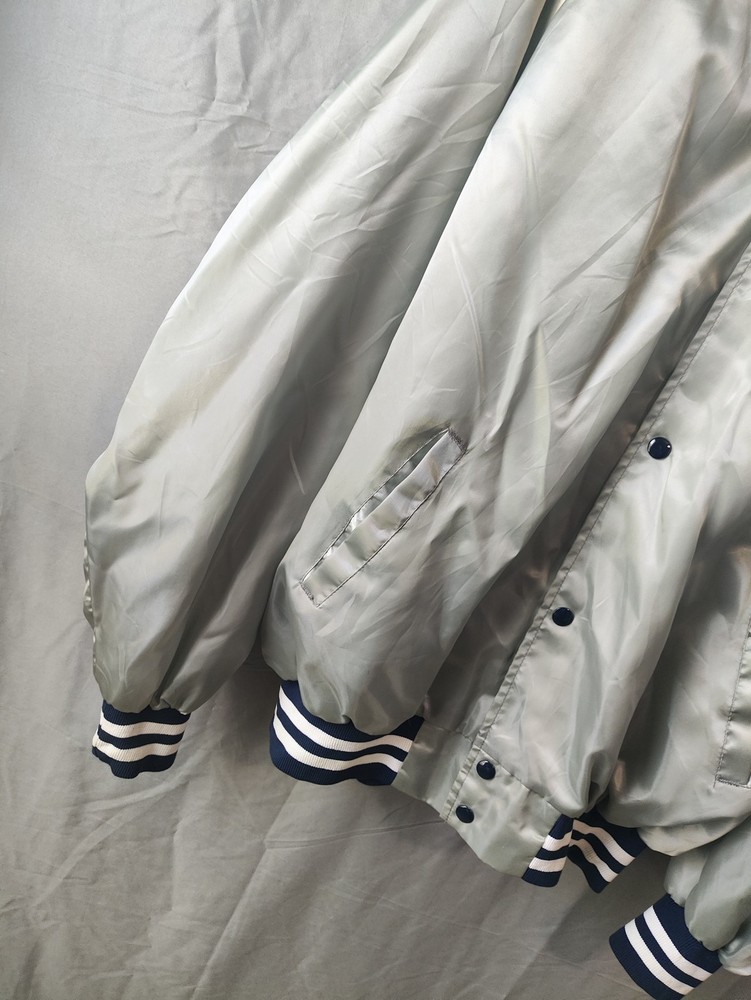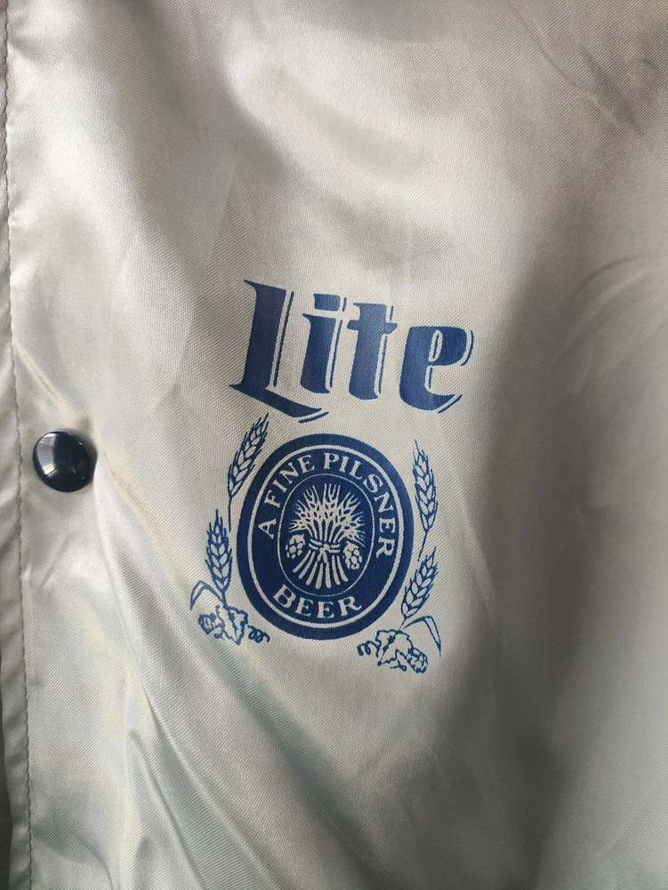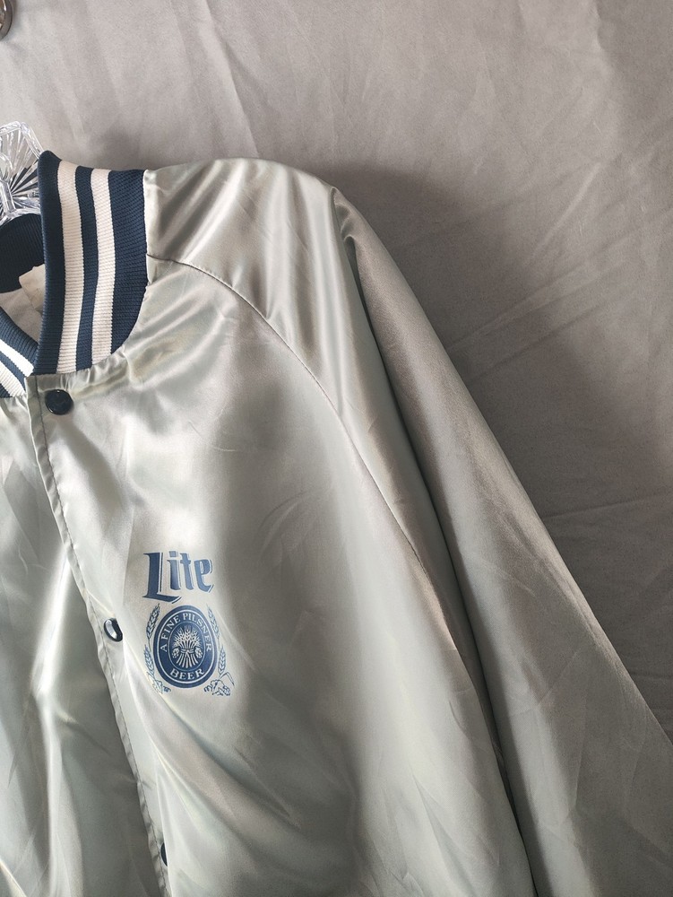 Vintage Miller Lite Jacket Mens Large Silver Blue Satin Bomber Beer Promo 80s USA Condition: Good vintage condition with light overall wear and minor wrinkling from storage. No major stains or tears noted. Please see photos for details. 100% polyester, made in USA (see faded collar tag) Classic Miller Lite "A Fine Pilsner Beer" front chest logo and large Lite Beer graphic on back in blue print Silver satin shell, blue and white striped ribbed knit collar, waistband, and cuffs Snap button front closure, two front hand pockets Bomber/varsity style silhouette with raglan sleeves Estimated size: Large (see measurement photos for reference) Great collectible beer promo jacket, ideal for retro parties, memorabilia display, or everyday vintage wear