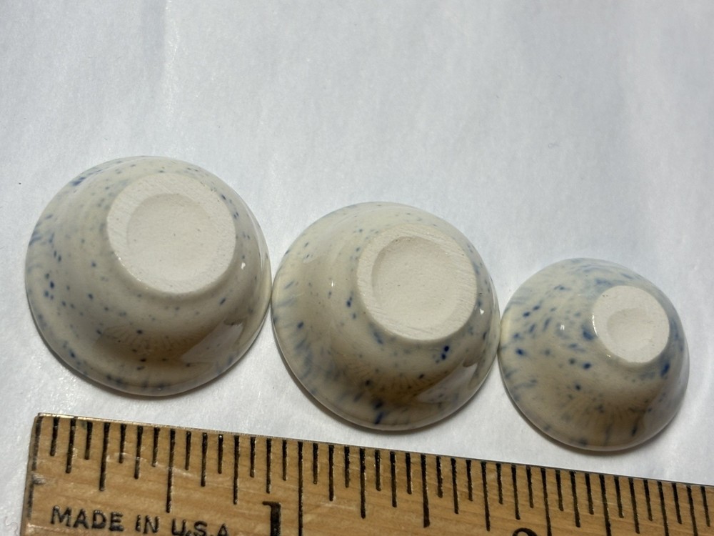 Vintage MCM 3 miniature dollhouse (2-7/8” diameter and 1 about 5/8” diameter)blue speckled bowls , with off white background, either made out of pottery or ceramic , very good vintage condition , slight wear to glaze Please examine all pictures and read entire description before purchasing this item Any questions please contact me before purchasing Smoke Free home