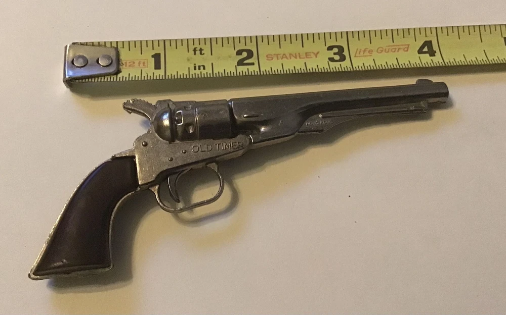 4” miniature cap gun pistol. Strong hammer pull and trigger. Old Timer, Numbered 1116.