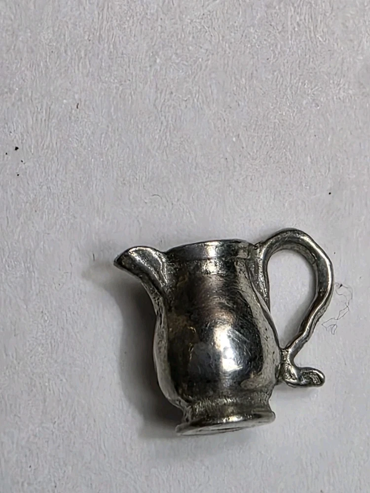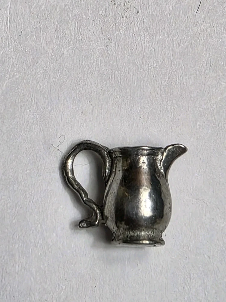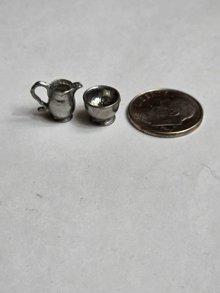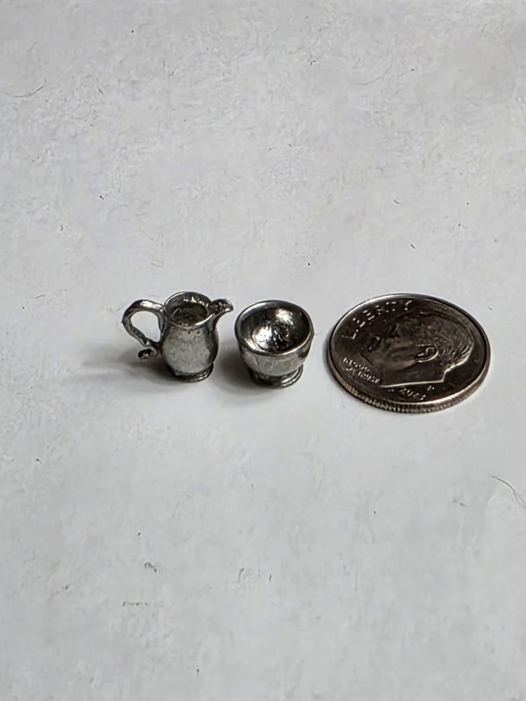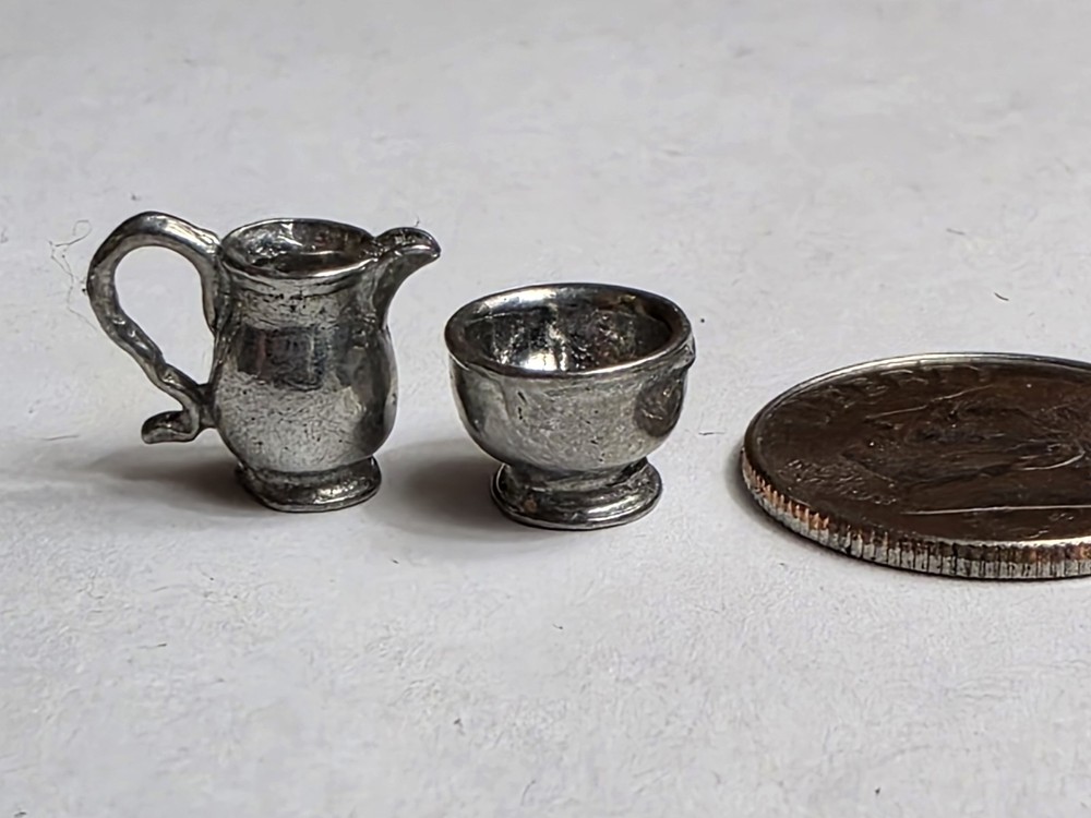 This vintage artisan dollhouse miniature is a sterling silver sugar and creamer set, perfect for adding a touch of elegance to any dollhouse dining room. Handcrafted with attention to detail, this piece captures the beauty and craftsmanship of a bygone era, adding a touch of vintage charm to your dollhouse decor.