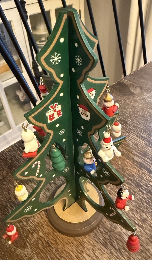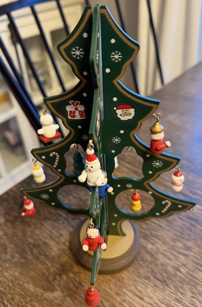 Vintage Miniature Wooden Christmas Tree With Miniature Wood Ornaments Hand Painted Adorable item that measures 9.5” tall about 6” wide . Missing star on top but anything could be added . Comes with 15 ornaments that measure about 1” long with hook. Tree has open hooks if you would like to add more ornaments.