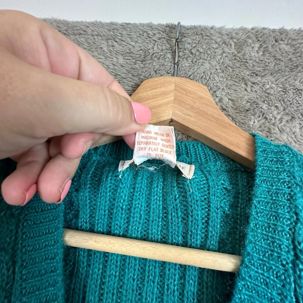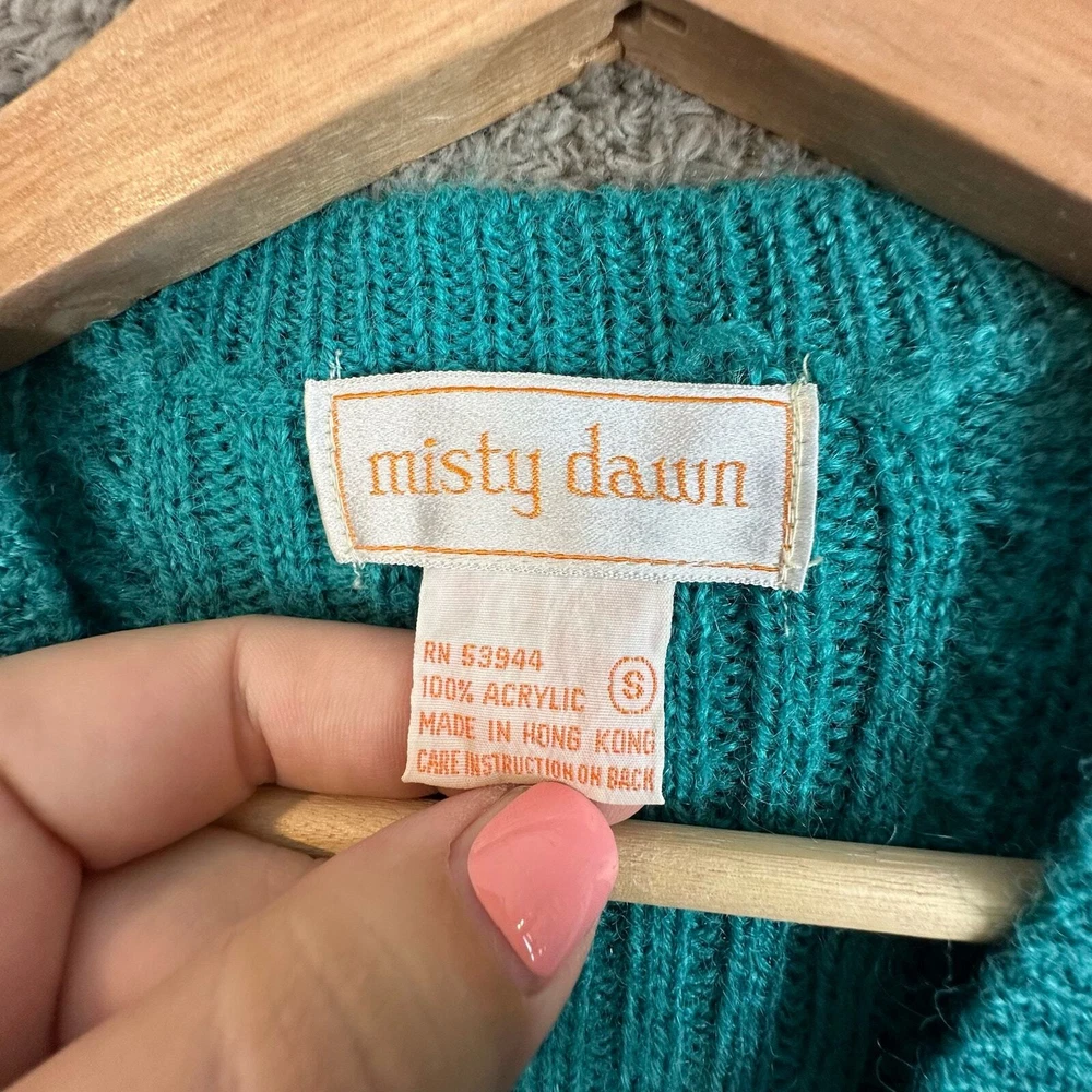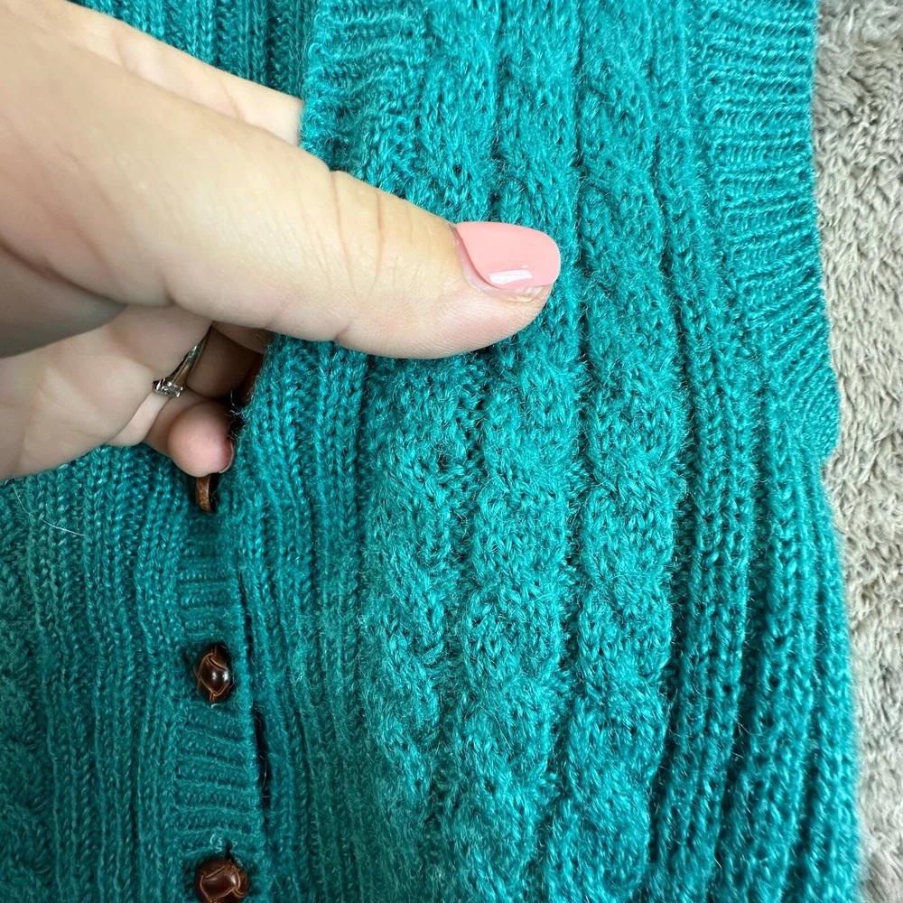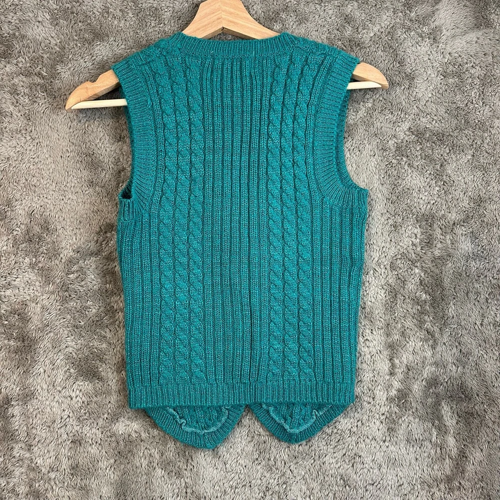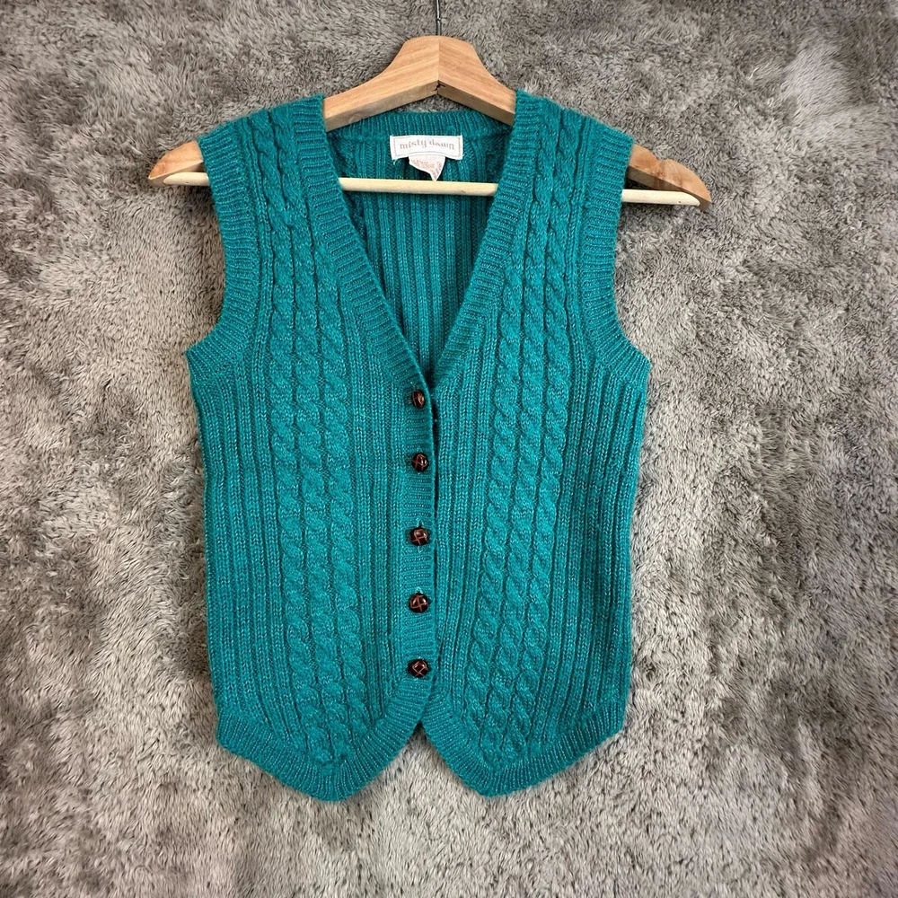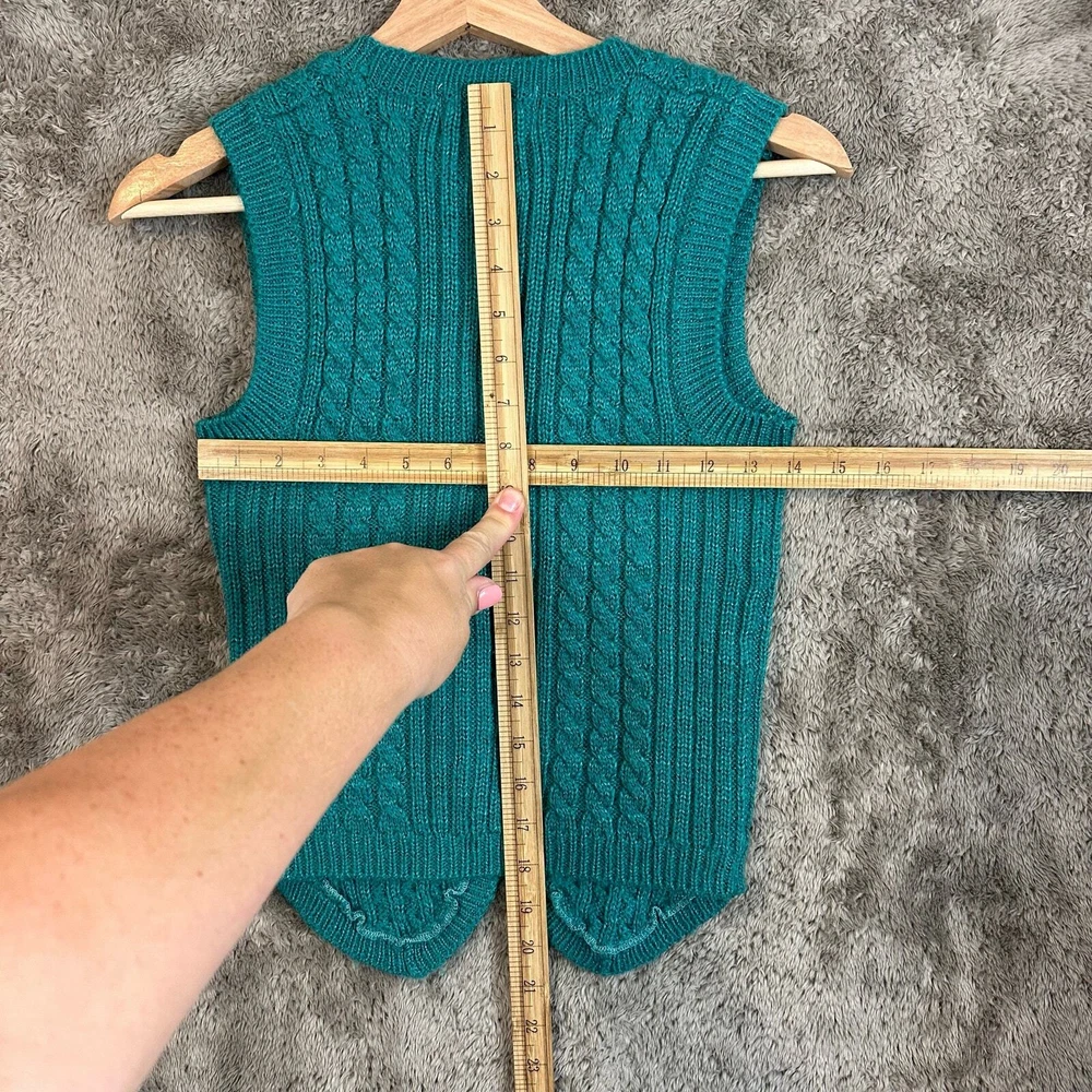 Vintage Misty Dawn Cable Knit Cableknit Cardigan Sweater Vest Teal Green Women's Size S Small Warm Size small, approx measurements unstretched in photos. Good condition, no major flaws, minor wear, tiny pick in fabric near buttons see photos.