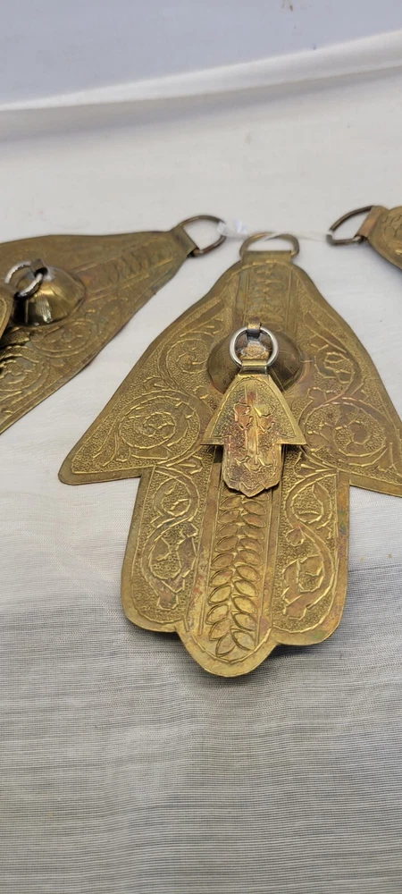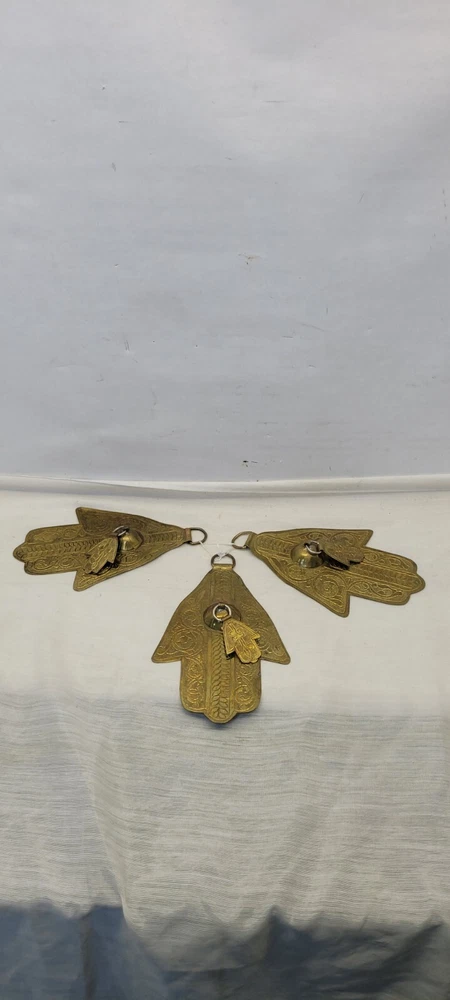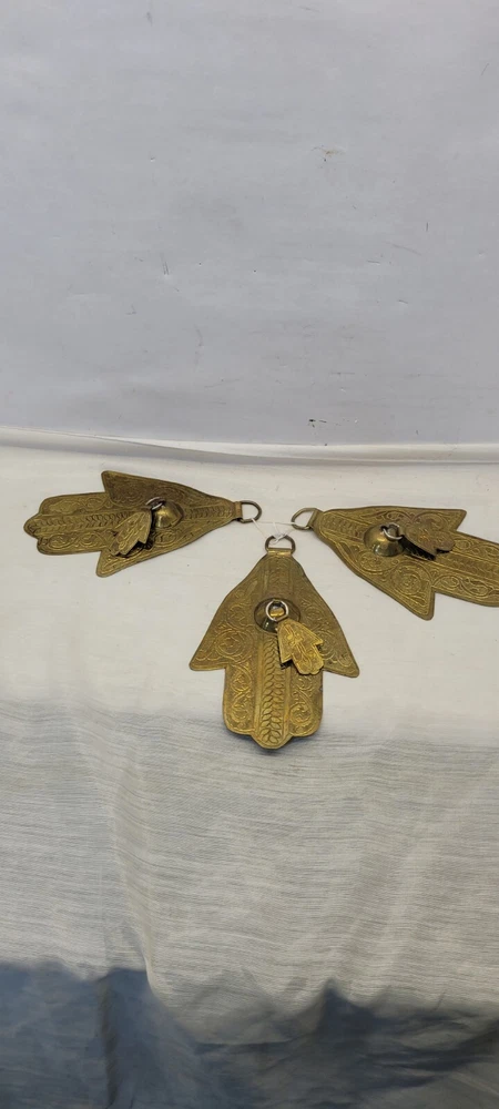 This vintage Moroccan double Hamsa amulet brass talisman wall hanging set of 3 is handmade and features a design rooted in Judaism. The intricate brass work reflects the cultural and religious influences of Morocco, making it a unique and symbolic piece for collectors of Judaica or spiritual items.
