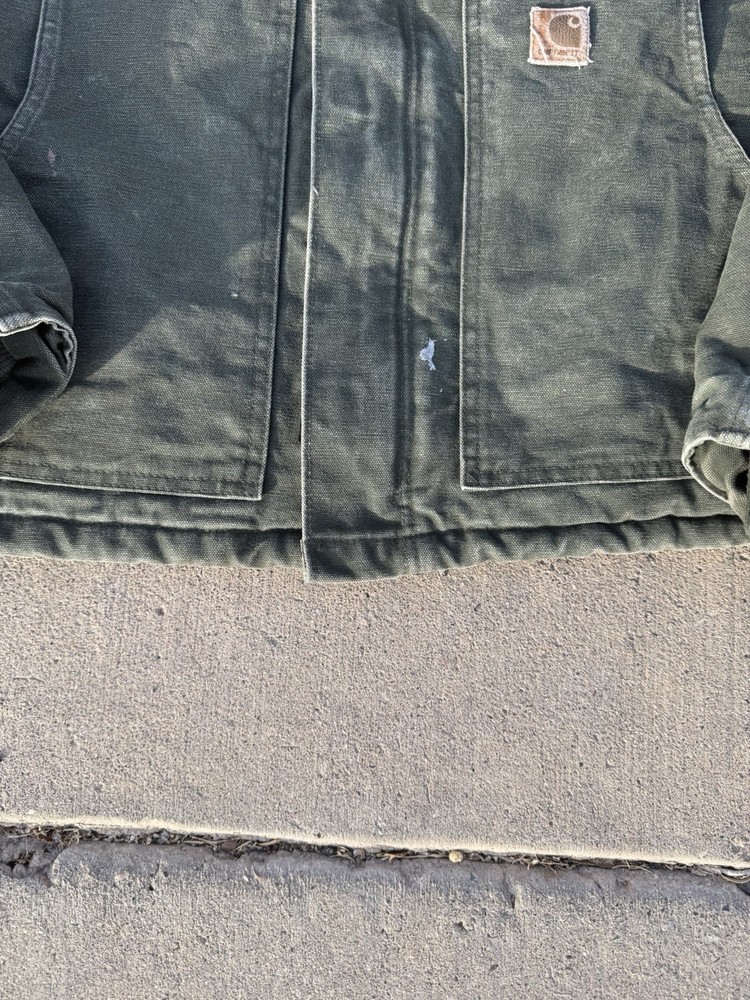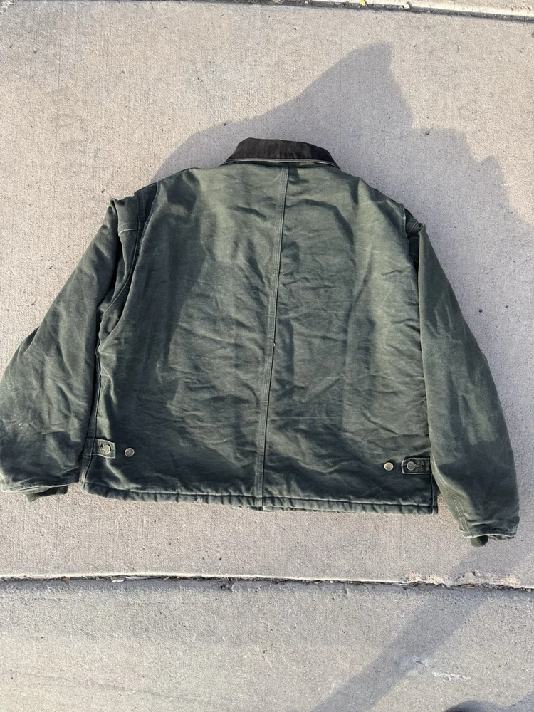 This Vintage men’s moss green Carhartt jacket in size XL is a classic workwear piece made of durable cotton canvas with a polyester lining and insulation, perfect for the winter, fall, and spring seasons. The bomber style jacket features a zip closure and the signature Carhartt logo accents, adding to its vintage appeal. With a regular fit and mid-length design, this jacket is suitable for casual wear and outdoor activities like walking and hunting, reflecting the rugged and practical heritage of the Carhartt brand.