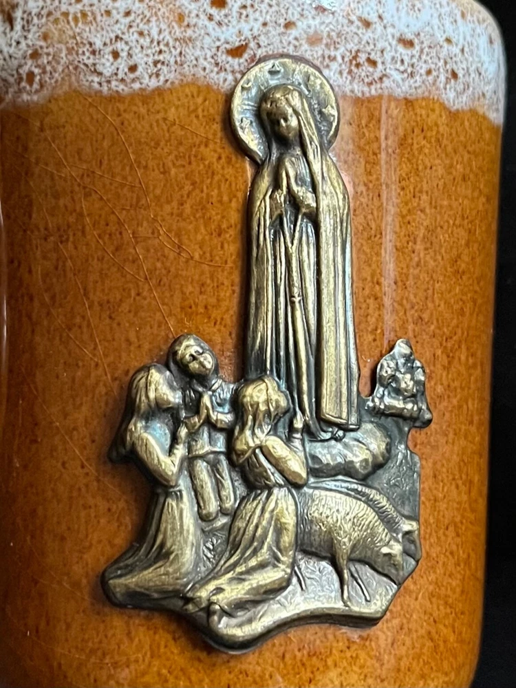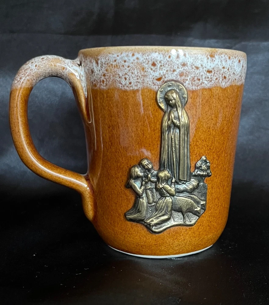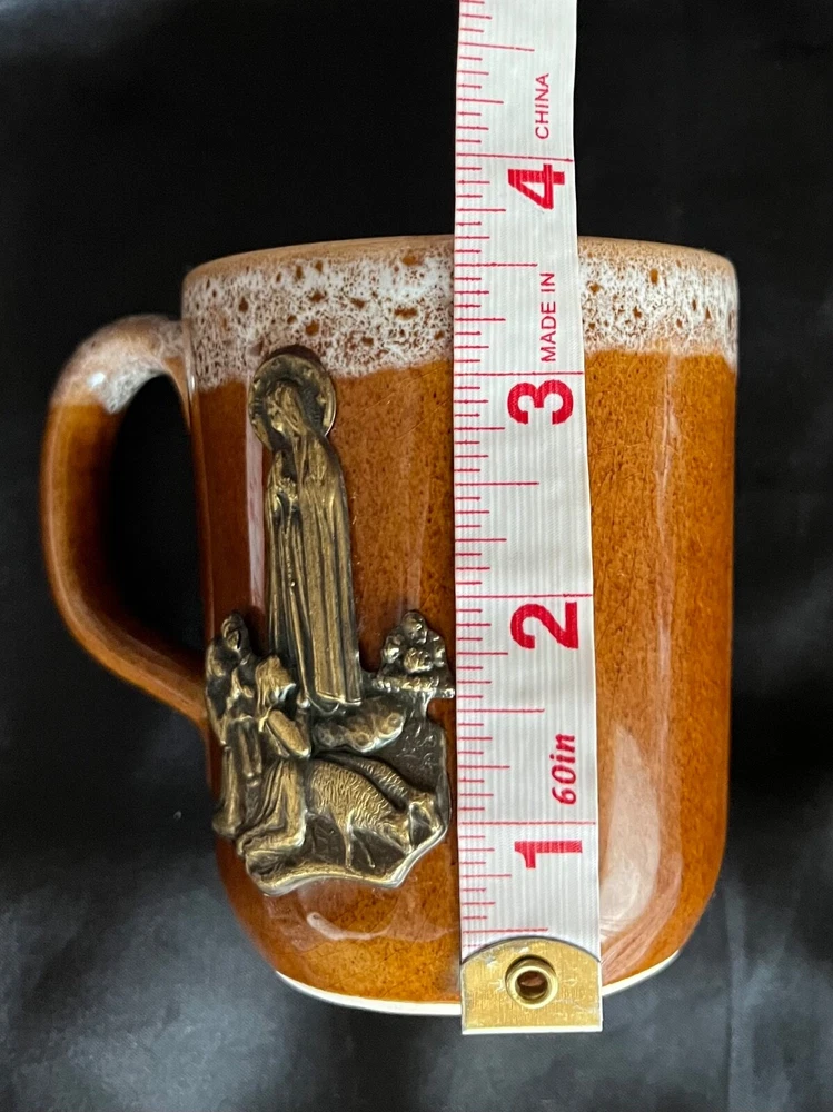 The Vintage Mother Mary Cup features a classic design with a metal embellishment depicting the Blessed Mother praying with children. This rare 12oz ceramic coffee mug is adorned with a brown color scheme and a religious theme, making it a special piece for those who hold the Catholic faith or have a devotion to Mother Mary. The mug is 3.5 inches in height and 4.3 inches in width, perfect for enjoying your favorite hot beverage while reflecting on faith and spirituality.