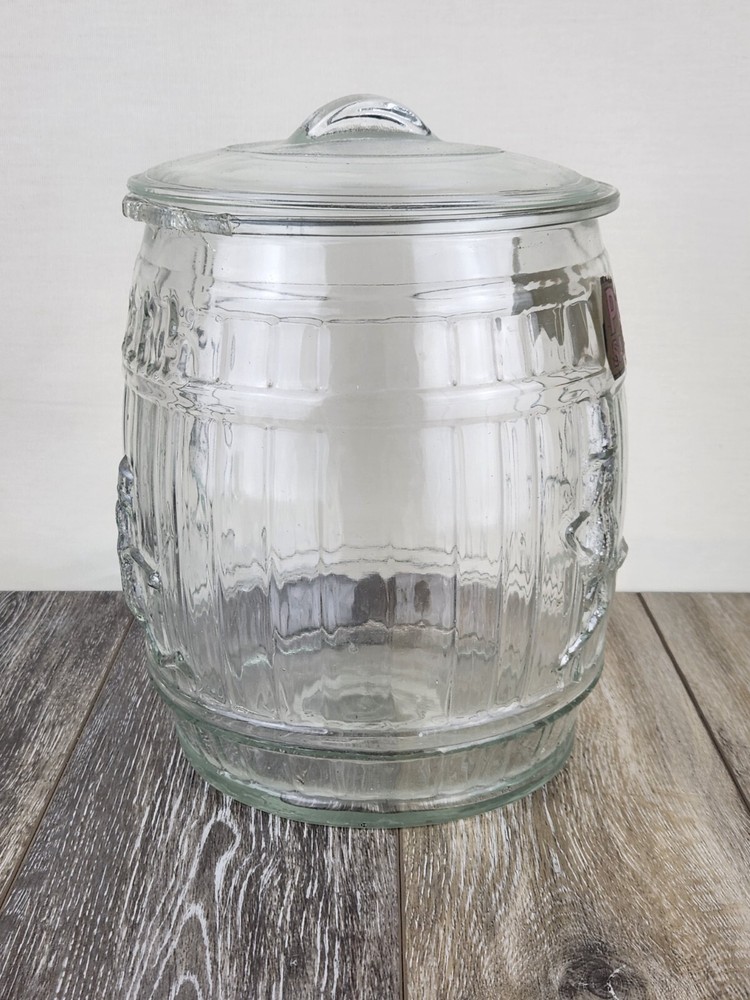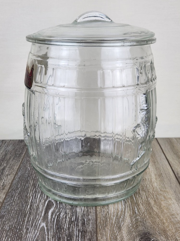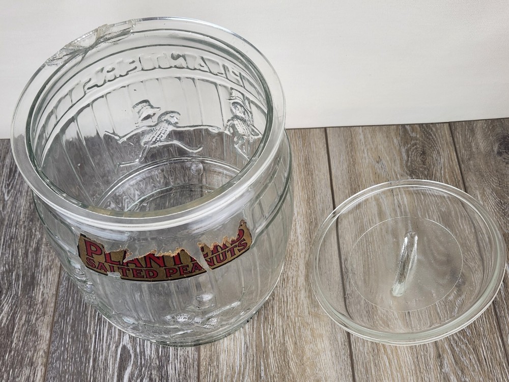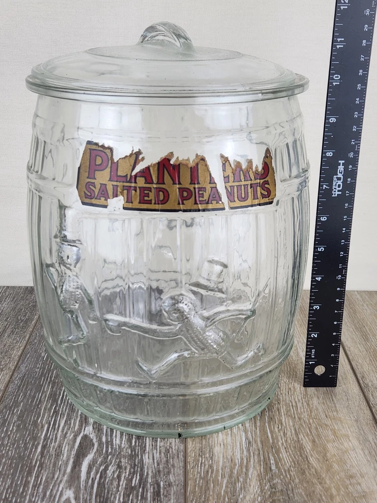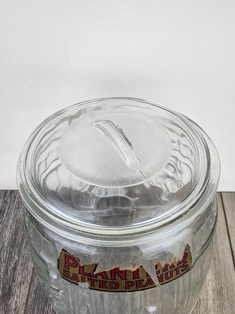 Showcasing the iconic Running Mr. Peanut, this vintage Planters glass barrel jar with lid is a must-have for collectors of advertising memorabilia, Planters Peanut Company history, or retro kitchen display pieces. The embossed glass design features Mr. Peanut in motion, complete with monocle and cane, and the included lid makes it ideal for display or light storage. A stunning piece of vintage Americana, this jar once held peanuts on a general store counter and now shines as a rare countertop collectible for the kitchen, pantry, or mancave. *The rim of the jar appears to have been repaired , and I am unsure if this is the lid that is supposed to go with the jar, but it does fit nicely.