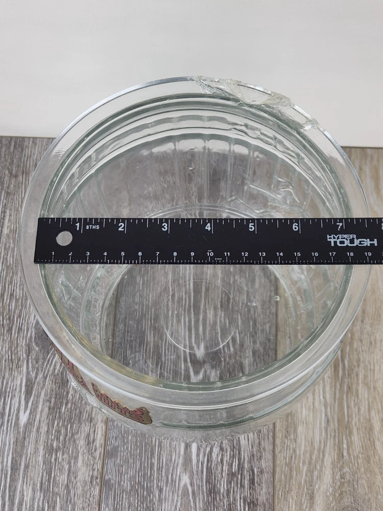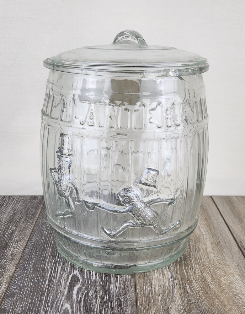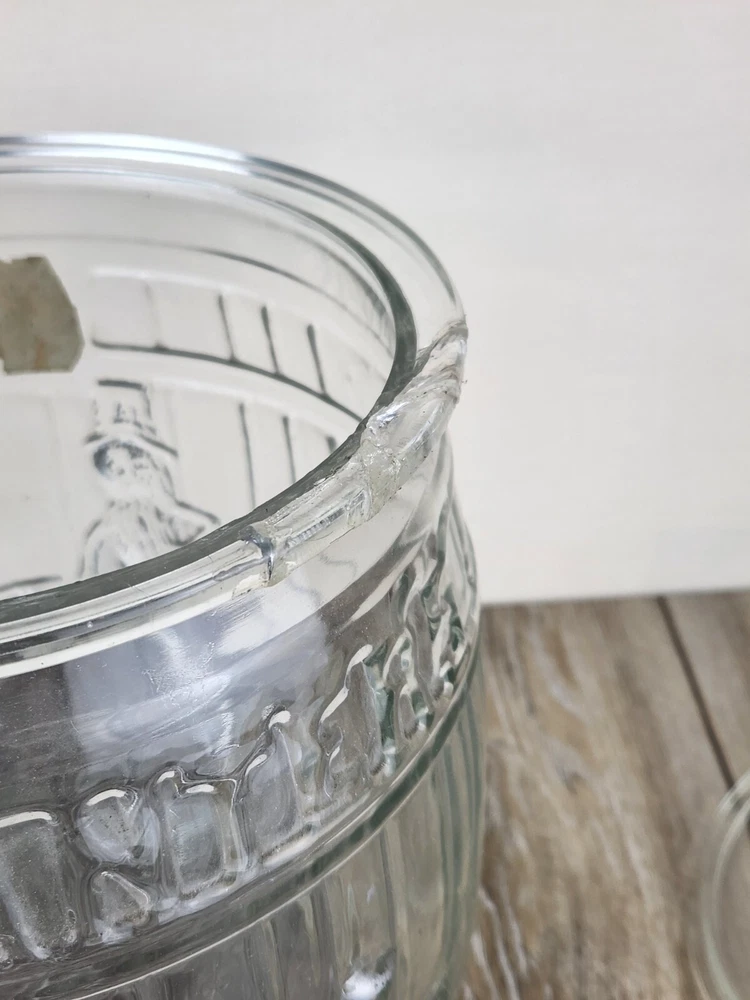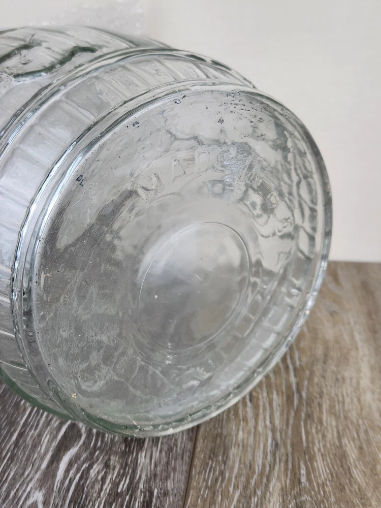 Showcasing the iconic Running Mr. Peanut, this vintage Planters glass barrel jar with lid is a must-have for collectors of advertising memorabilia, Planters Peanut Company history, or retro kitchen display pieces. The embossed glass design features Mr. Peanut in motion, complete with monocle and cane, and the included lid makes it ideal for display or light storage. A stunning piece of vintage Americana, this jar once held peanuts on a general store counter and now shines as a rare countertop collectible for the kitchen, pantry, or mancave. *The rim of the jar appears to have been repaired , and I am unsure if this is the lid that is supposed to go with the jar, but it does fit nicely.