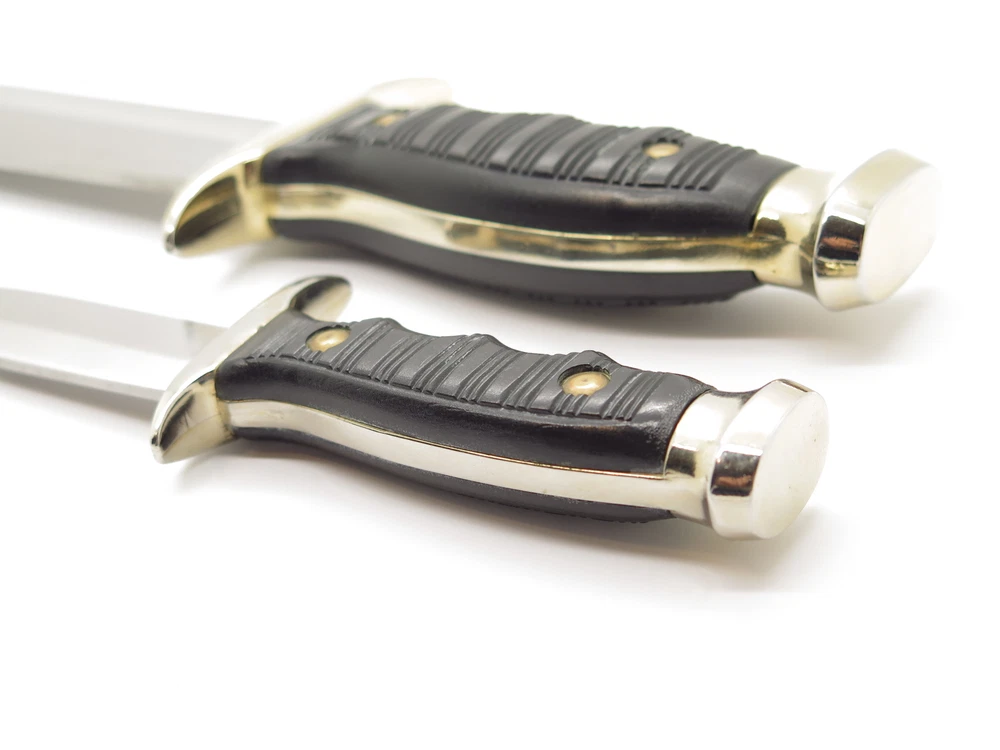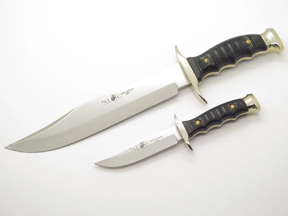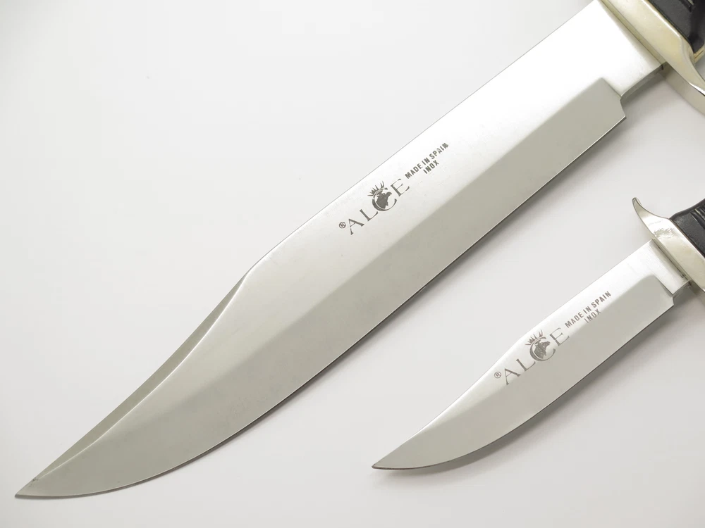 ePrague Contact Visit Store New Items Alce Twin bowie set This is a very nice vintage Alce twin knife set made by Muela in Spain. It features synthetic handles with a cast guard, liner, and pommel. A nice older set. Discontinued. Product Highlights Model: Alce Twin bowie set Condition: Original unused factory edge, light handling wear/aging. Box has wear. Made in Spain Folder Closed, or Fixed Overall Length: 13.3" and 7.6" Blade: 8.7" and 3.8" long, Stainless Steel Handle: Synthetic Comes with sheath in box About Us A member of eBay since the year 2000, ePrague Knives has helped customers find the perfect everyday-carry knife as well as the “safe queen” collectible. Based in Post Falls, Idaho, we offer new and used knives and we specialize in obtaining rare cutlery direct from Seki, Japan. Online retail requires a company that is able to bring the showroom experience to the web - we do this with superior photography, detailed descriptions, great customer service, and speedy safely packaged shipments. Newsletter Click "❤ Save This Seller" on the main product page then go to "Saved Sellers" and check the box to subscribe to newsletter. Desktop users please click the "Sign up for Newsletter" link above. Terms Laws change and vary according to location. By purchasing, you verify that you are legally able to purchase the Product and you verify that you are over the age of 18 years and are aware of and in compliance with all local, state, and federal laws. You shall be responsible to check all applicable federal, state, and local laws concerning the purchase, ownership, use, and possession of any Products sold to you by ePrague, LLC. By purchasing Product, you verify that you are of legal age (no minors), and will use the Product legally and assume all responsibility. By ordering and purchasing Product from ePrague, LLC, you agree that the Product can legally be purchased and owned by you in accordance with all federal, state, county and local laws. ePrague, LLC and its employees shall be held blameless and will not be held liable for any infraction of laws by the purchaser. ePrague, LLC will not be held liable for any injuries from any item purchased from ePrague, LLC. Contact Can't find what you are looking for? Please contact us and we will be happy to help.