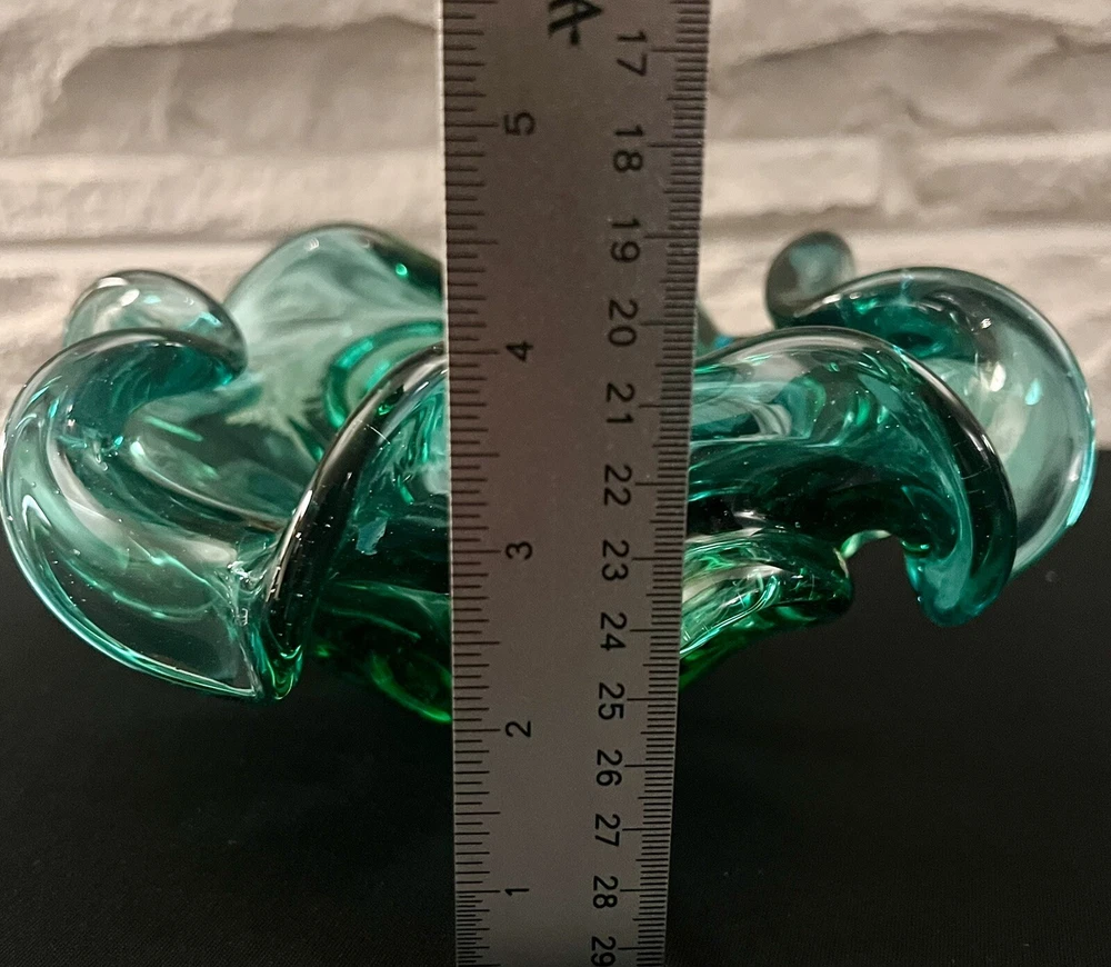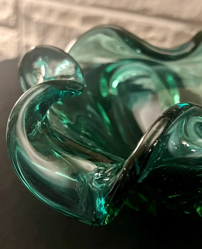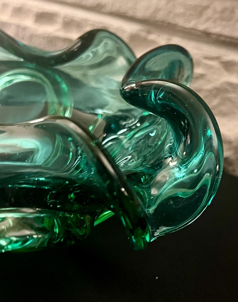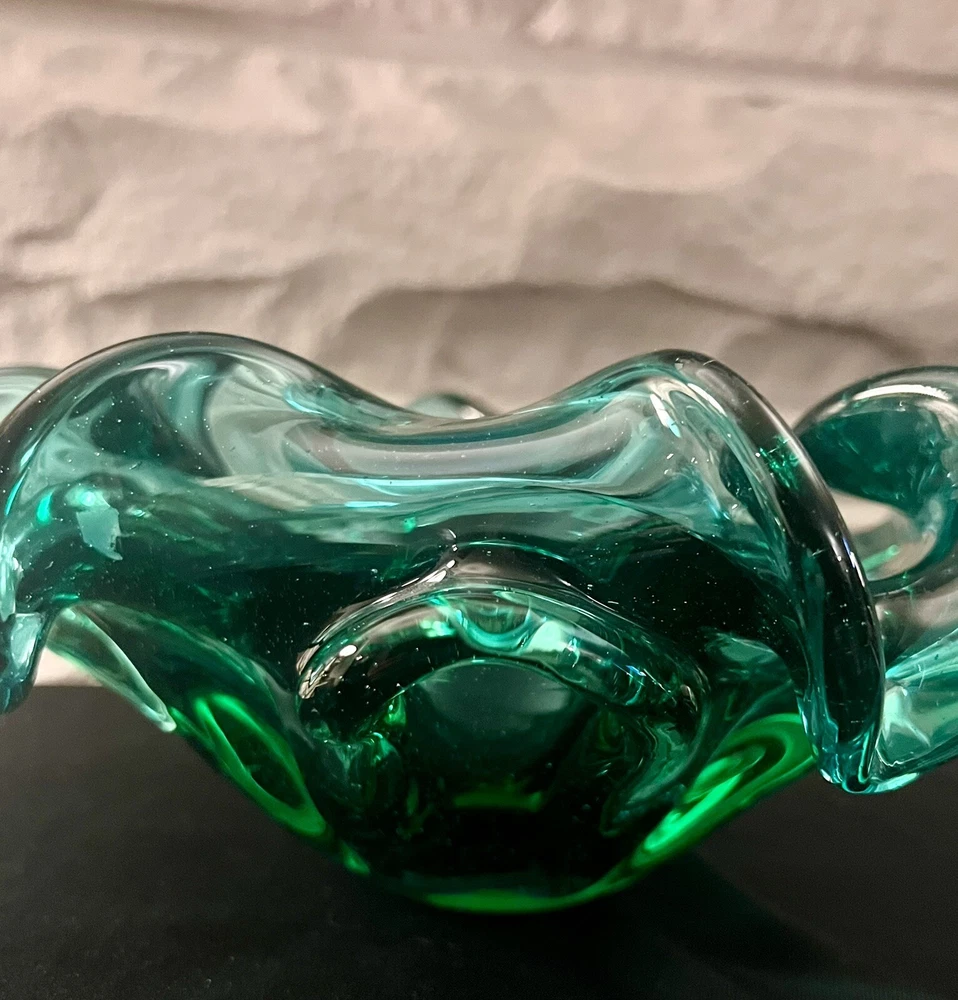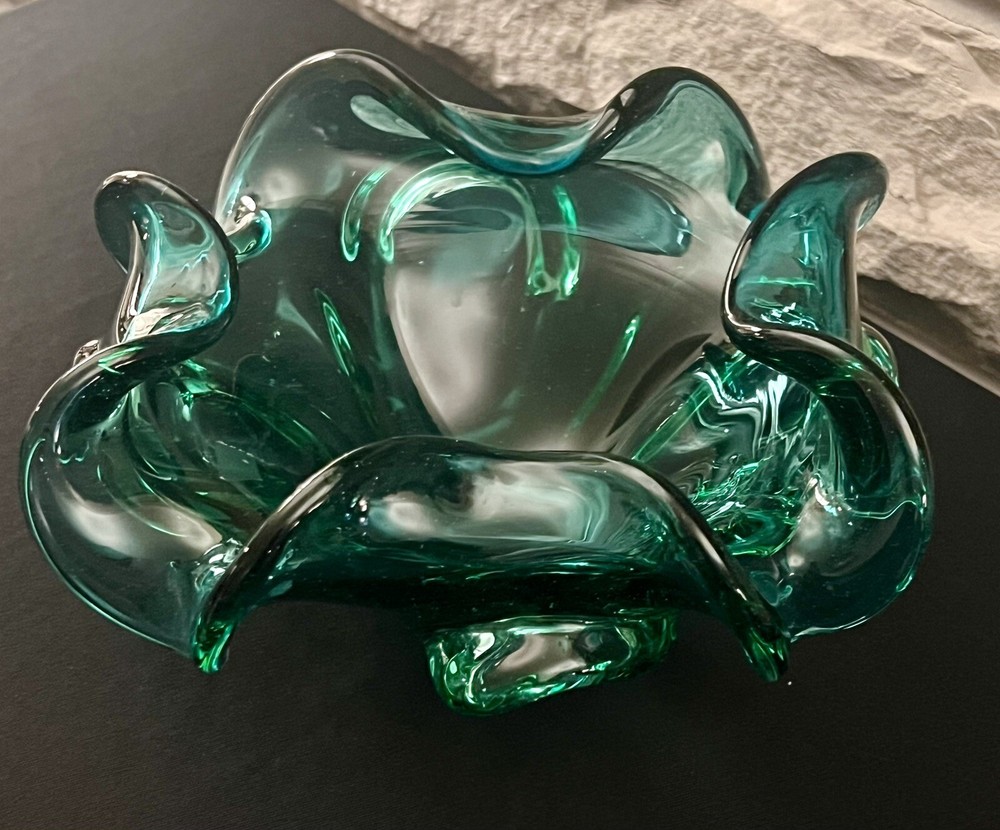 This is a vintage Murano glass bowl by Barovier Toso, originating from Murano, Italy. The bowl is round with a floriform shape and features a green rolled edge. It is hand blown and measures 8.6 inches in length and 4 inches in height. The bowl is part of the Mid-Century Modern style, with a limited edition decorative design suitable for use as a fruit bowl, console dish, or centerpiece.