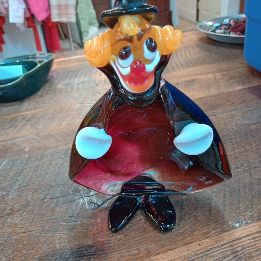 This vintage Murano Italian art glass clown ashtray is a beautiful addition to any collection. The hand-blown glassmaking technique used to create this piece is evident in its unique and colorful design. Measuring at 9 inches in length and 6 inches in width, this ashtray is the perfect size for any smoker. The clown theme is consistent with the subject/theme, and the multi-color glass material is eye-catching. This contemporary original piece was produced in Murano, Italy, adding to its value.