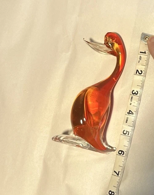 This product is a vintage Murano Italy handblown glass 6" duck figurine from the 60s/70s, showcasing the Italian craftsmanship and Mid-Century Modern style. The orange glass figurine is intricately handcrafted with a glossy finish, making it a unique and decorative piece for any collection. Originating from Europe and featuring a European brand, this handblown glass duck figurine is a charming representation of Italian artistry and a beautiful addition to any home decor. This Mirano glass art figurine is in excellent condition with no chips or cracks. There is a rough edge to the pontil mark on the bottom. The label is still intact but has moderate wear. See All Photos for details. The art glass will be packed very secure in bubble wrap and packing paper and marked fragile to prevent damage during shipment.