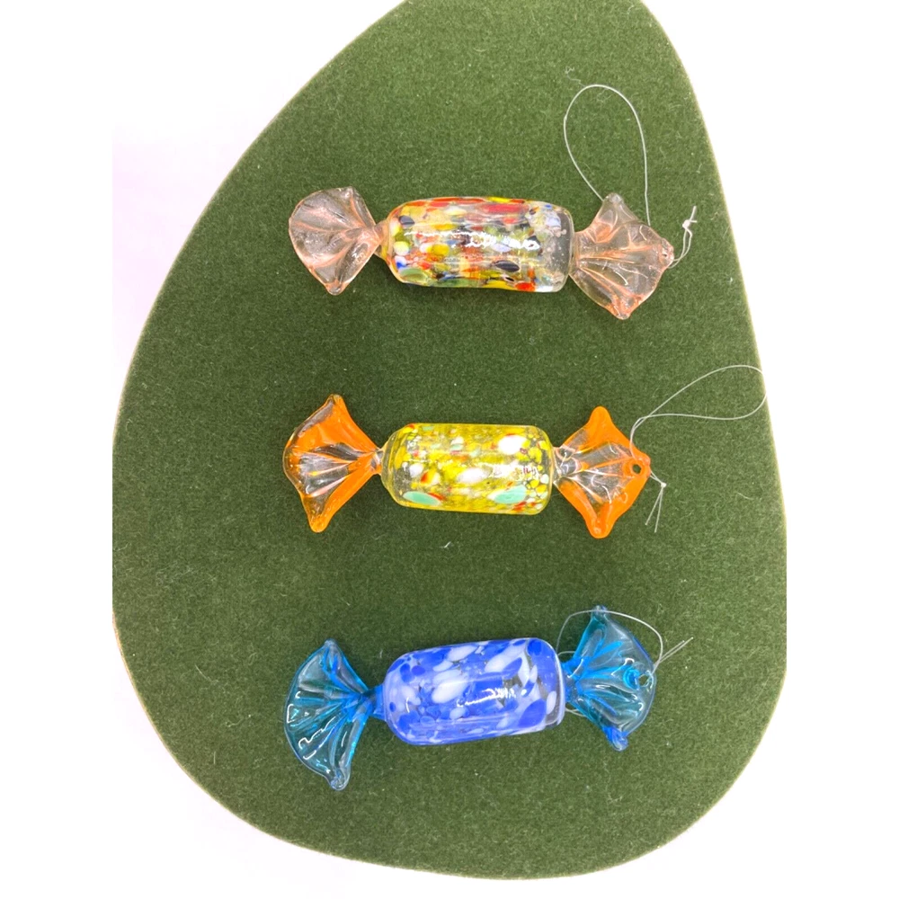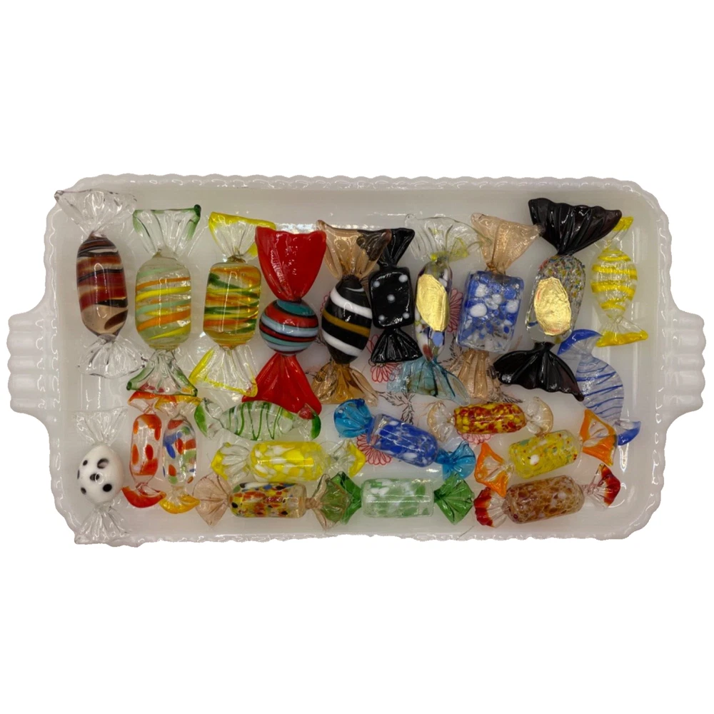 This is a vintage collection of 22 hand-blown candy pieces made of glass by Murano, Italy. The candies come in different sizes, ranging from 3 inches to 2 inches, and are multicolored, some are textured and others have a clear string for hanging. Two come with original Murano sticker. They feature carvings, a 3D effect, high gloss, translucent, and some have a textured finish. The candies are bright and have a total weight of 1 lb 10 oz. They are perfect for all occasions and are ideal for adults who love art. Set only includes 22 candies. These exquisite set of Original Murano are in overall good condition. However, two pieces have chipped corners. Some have clear strings attached for hanging. Please refer to pictures.