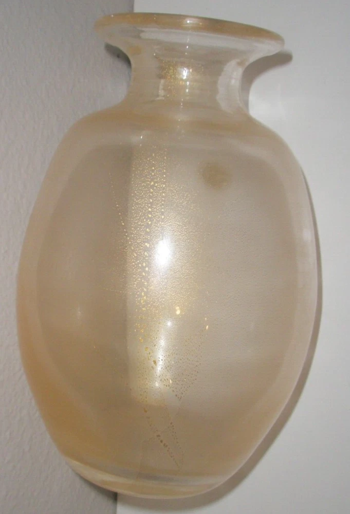 Vintage Murano 8" glass vase with gold speck streaks. Unit is labled Vetro E Lavorazione Di Mastri Di Murano, 6 Inch wide, 3 inch lip Combine Shipping and Save. Local Pickup always encouraged