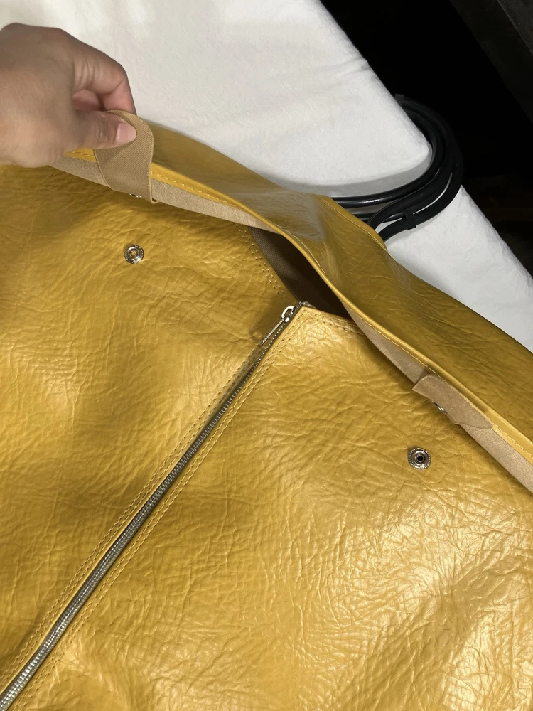 This is a vintage American Tourister garment bag in mustard yellow. It features a clothing compartment and is made of faux leather or possibly real leather. Not super sure. The bag is designed for carry-on use and has a size of 37". Suitable for both men and women, this stylish garment bag is a practical and fashionable choice for travel. Retro traveler. Zip and button snap closure.