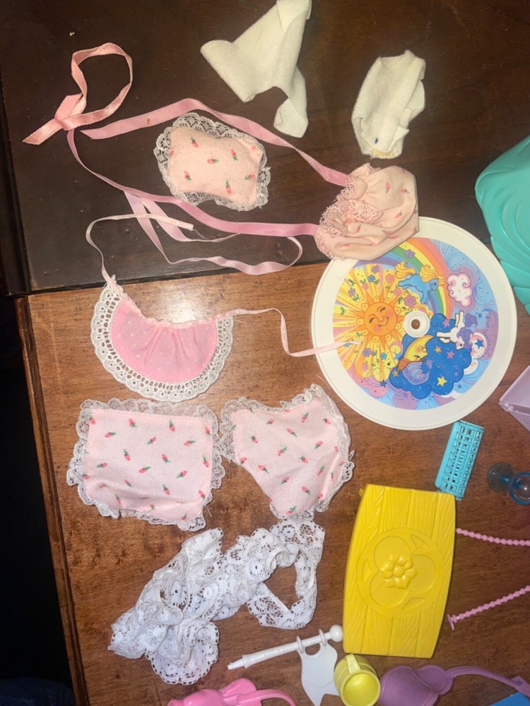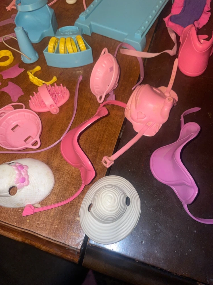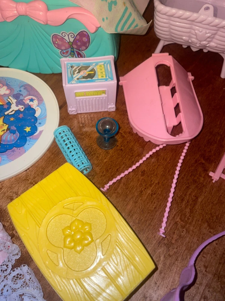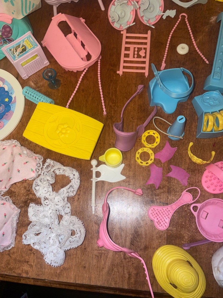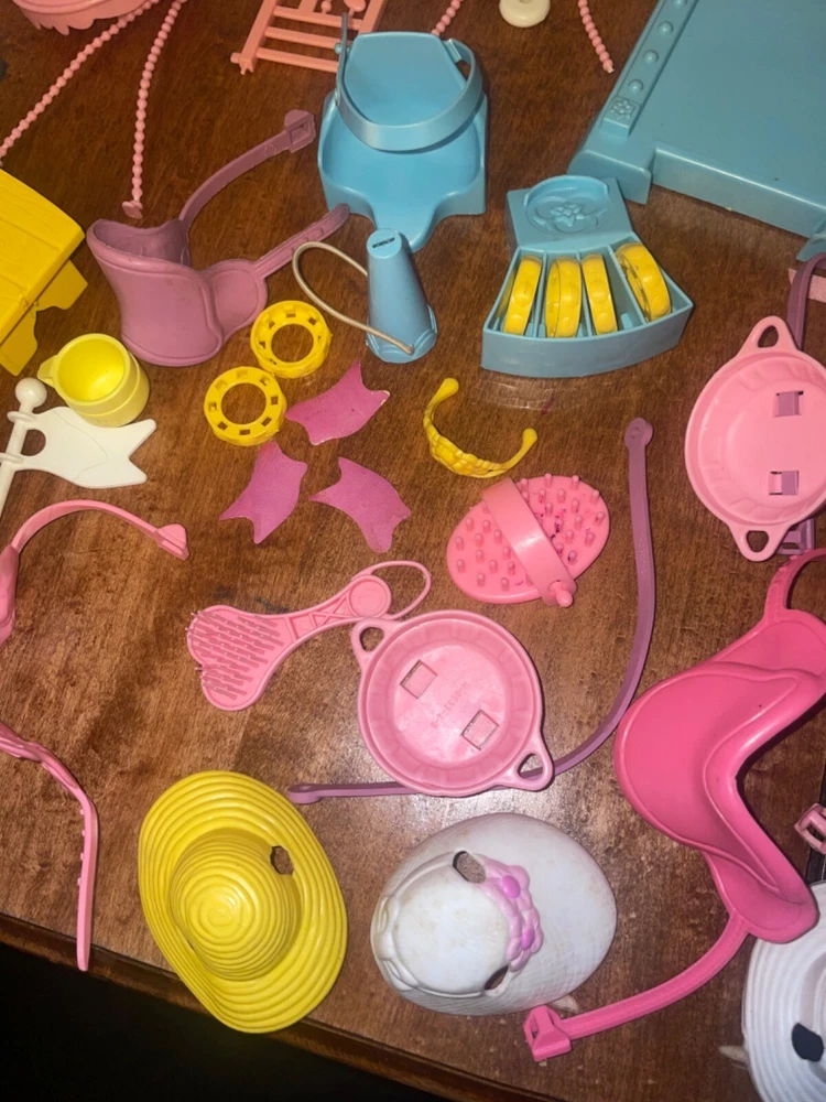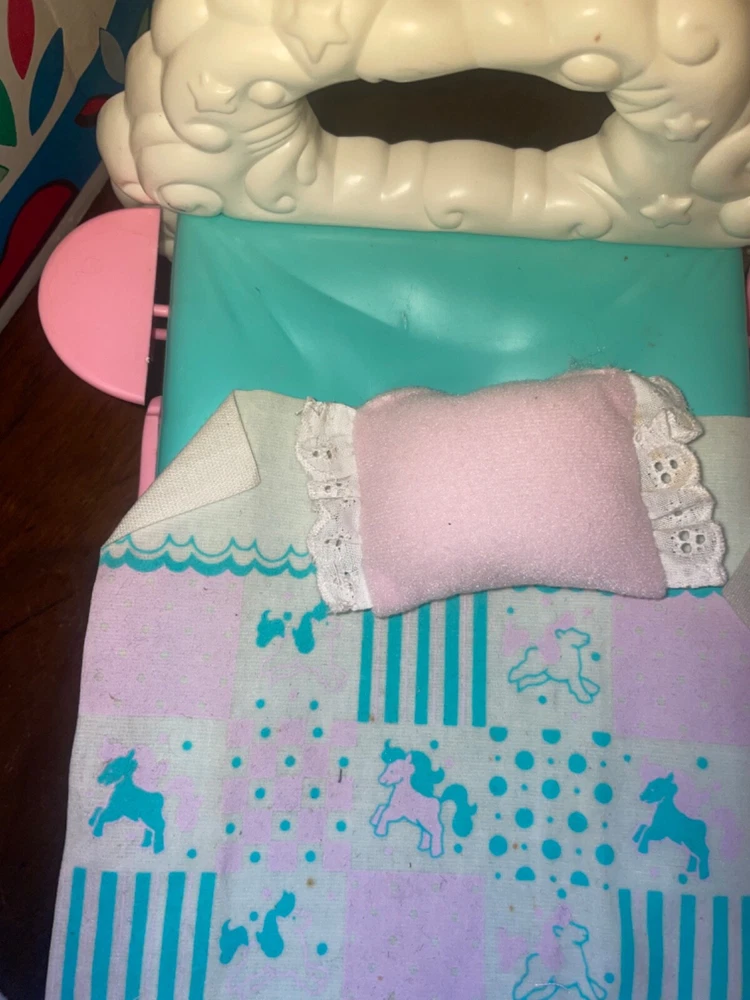 Lots of accessories for several different G1 My little pony play sets. There’s parts for the baby buggy, castle, bed, nursery, and more. Some items are in better shape than others as conditions vary. The spinning thing that goes to the bed is missing whatever attaches it to the bed. Some of the rubber hats and saddles have some condition issues, need to be cleaned, or have spots or marks. May need to clean up some of this stuff or all of it. There’s a sticker on the bed. May show other signs of use or wear but overall decent for its age. Sold as is no returns. Handling within two business days. Thank you!