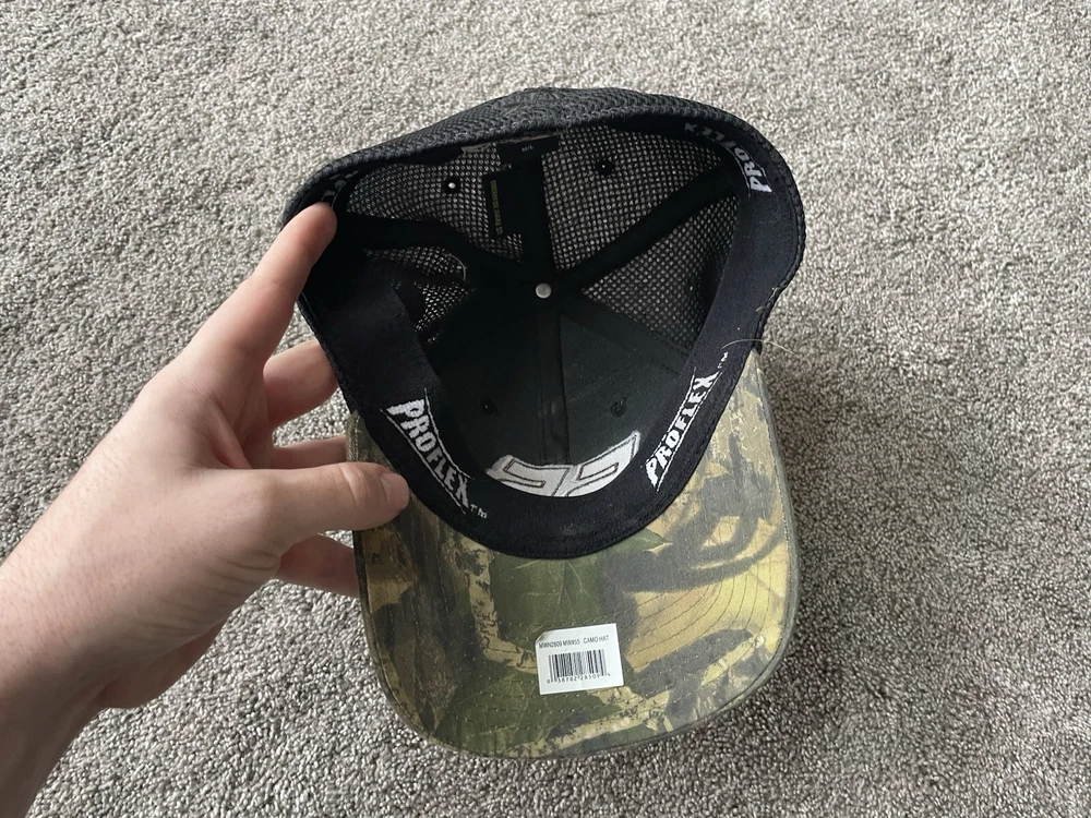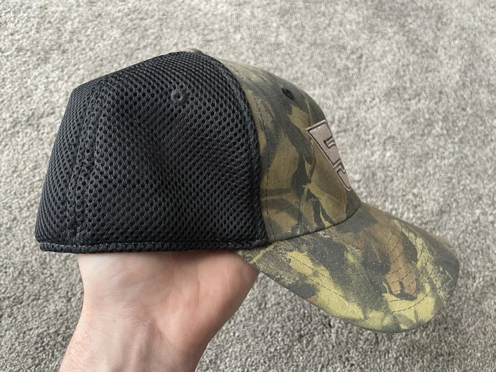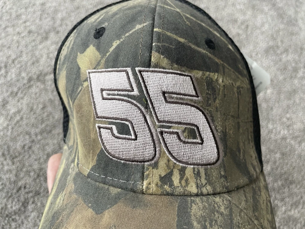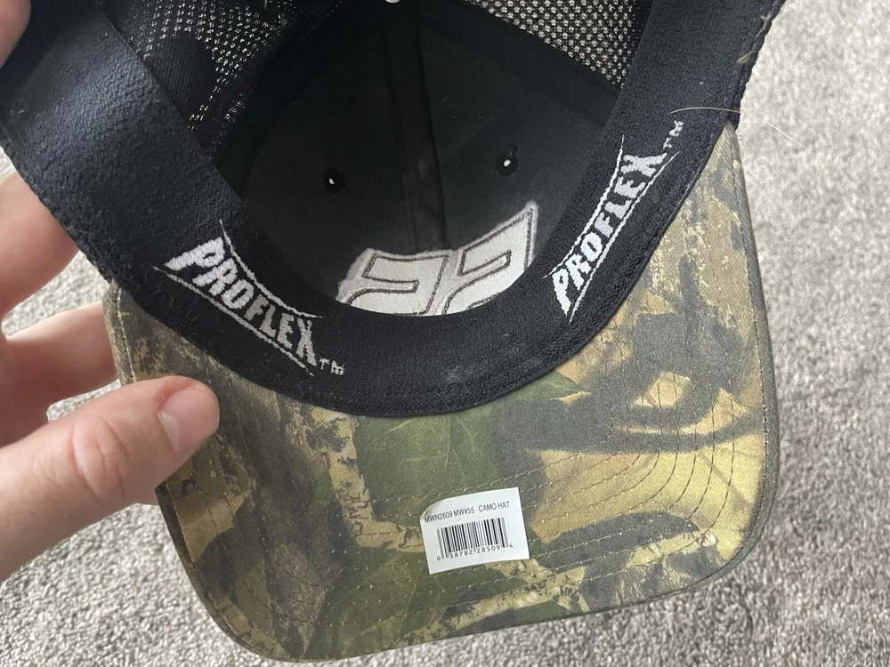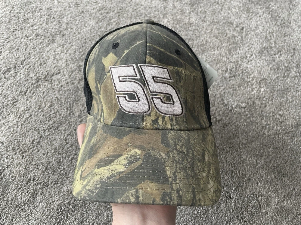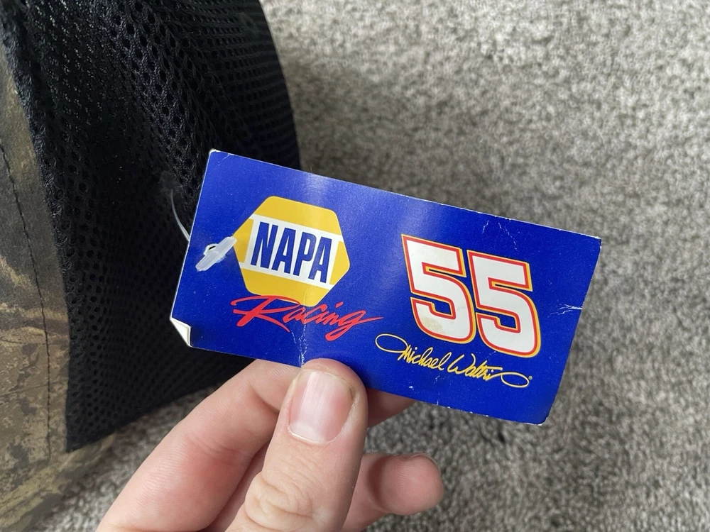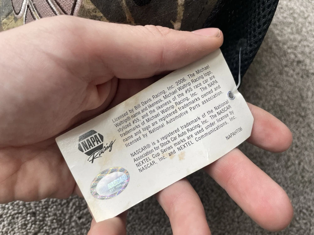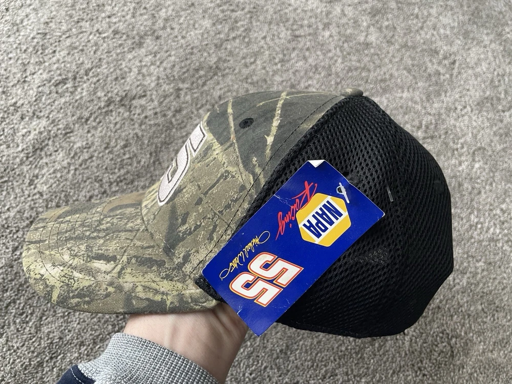The vintage NASCAR hat is a multi-color camo baseball cap featuring the Team Caliber brand and officially licensed by NASCAR. It is designed in size M for men and showcases the driver Michael Waltrip and Team Bill Davis Racing. Made in China, this cap is a unique and collectible item for fans of auto racing.