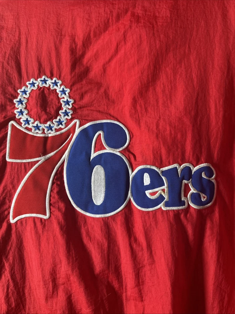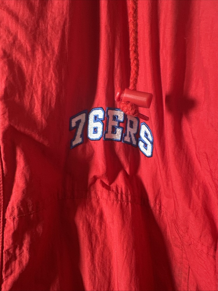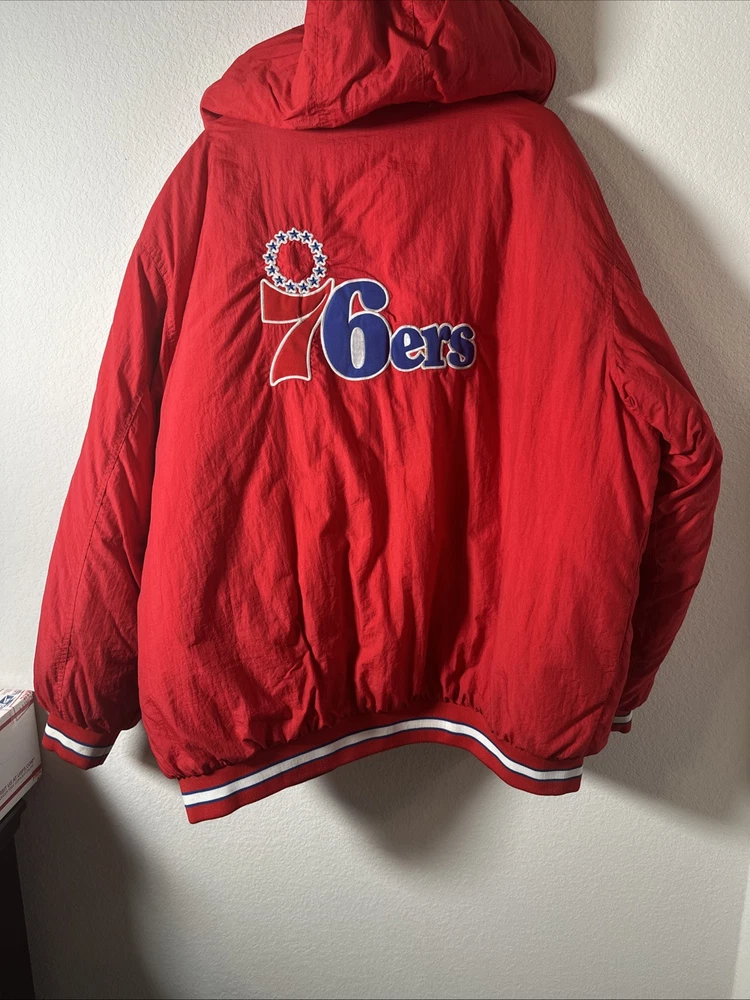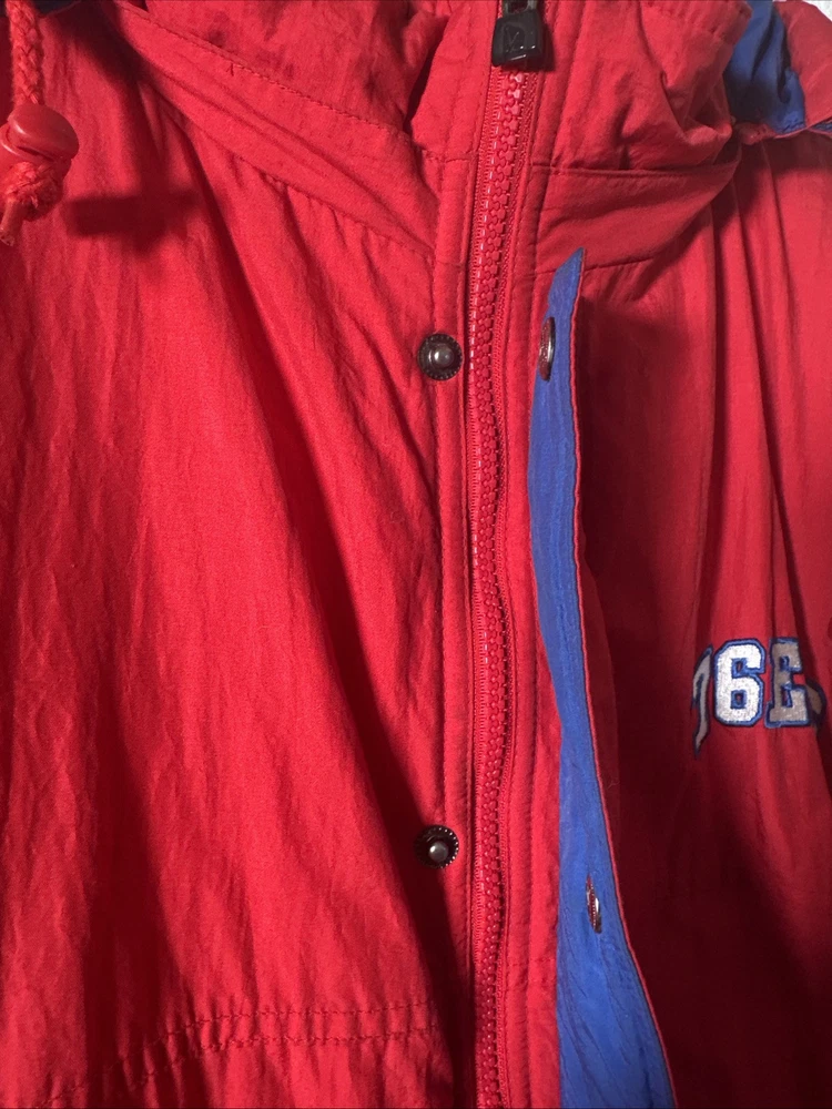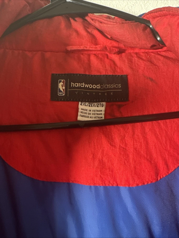 This is a vintage Hardwood Classic NBA Philadelphia 76ers winter parka coat jacket for men in size 2XL. It is officially licensed by the National Basketball Association (NBA) and features player Charles Barkley. The jacket is red in color and is designed for the Philadelphia 76ers team. It is a men's jacket made in Vietnam.