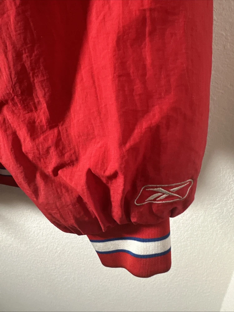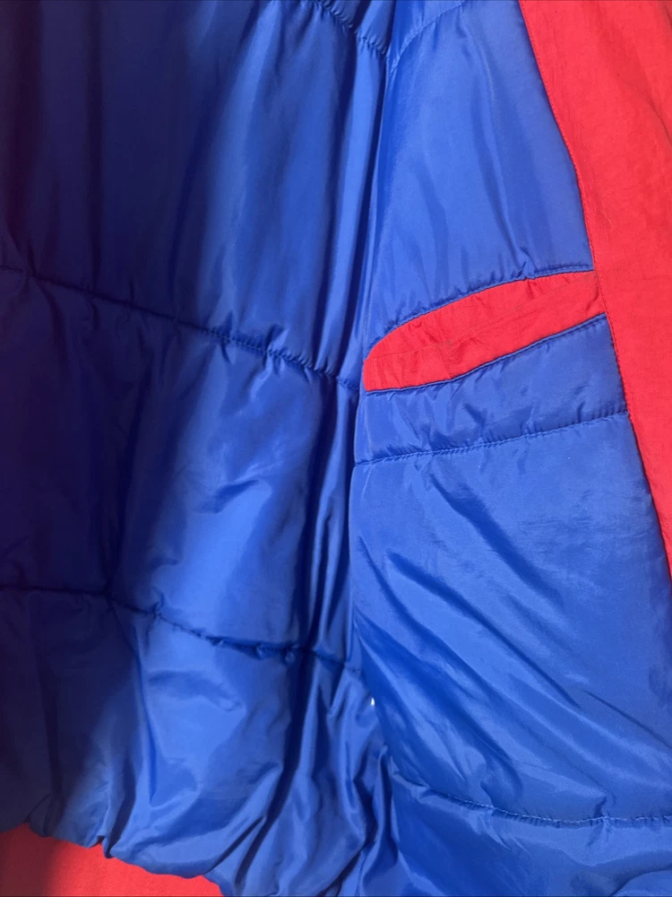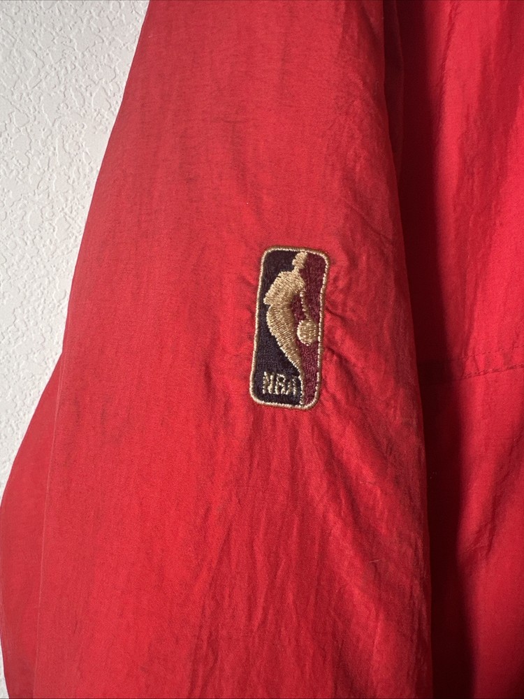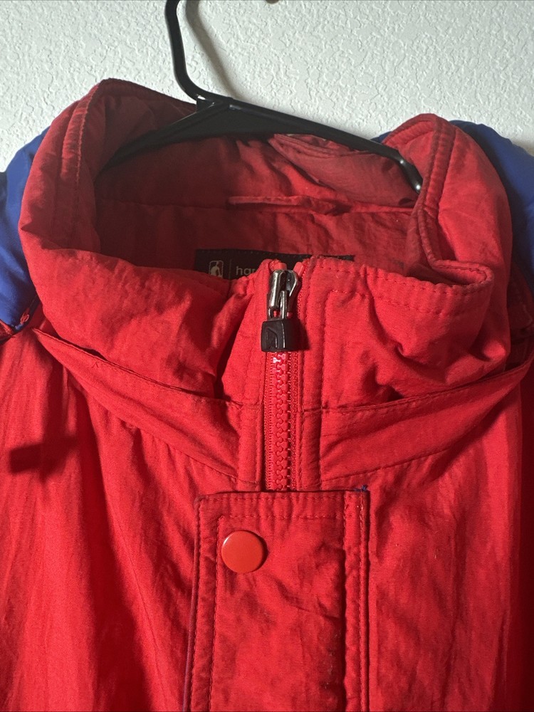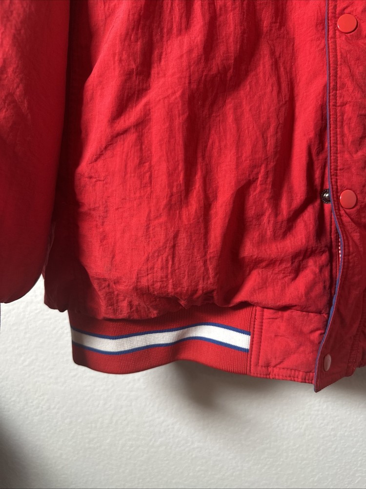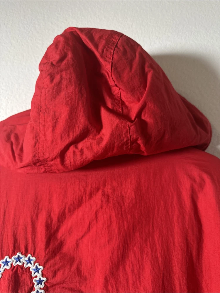 This is a vintage Hardwood Classic NBA Philadelphia 76ers winter parka coat jacket for men in size 2XL. It is officially licensed by the National Basketball Association (NBA) and features player Charles Barkley. The jacket is red in color and is designed for the Philadelphia 76ers team. It is a men's jacket made in Vietnam.