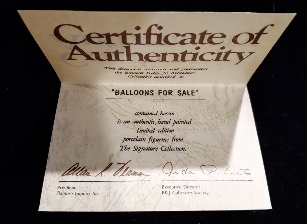 New in box Emmett Kelly Jr. 'Balloons for Sale' figurine Authentic hand painted limited edition, signed and numbered Comes in box with certificate of authenticity Miniature porcelain figurine from The Signature Collection Flambro product Your Emmett Kelly, Jr. Collectible is excellence in fine porcelain achieved by artisans applying their ancient craft heritage. It is distinguished by qualities prized by collectors for investment value. Cherish it among your keepsakes.
