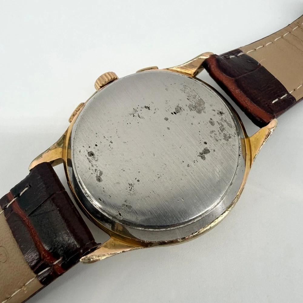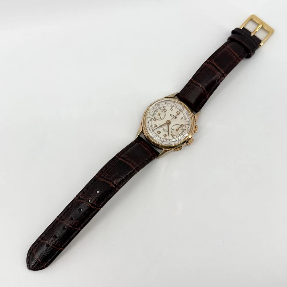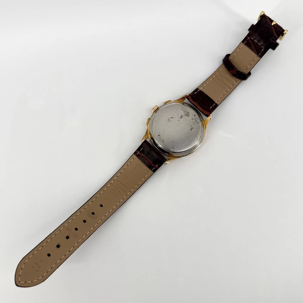 Vintage NIGA Swiss Chronograph Watch – Landeron 51 – Gold Plated – c.1940s–50s Description A handsome vintage Swiss chronograph by Niga, dating to approximately the 1940s–1950s. This classic two-register chronograph is powered by the respected Landeron 51 manual-wind movement and features an attractive multi-scale dial with applied Arabic numerals. The watch is in good working order, winding smoothly and ticking along nicely, with the chronograph starting, stopping, and resetting correctly. A very wearable mid-century chronograph with honest age-related wear. Brand History – Niga Niga was a Swiss watch brand established in the early 1930s in the Jura region of Switzerland, an area long associated with traditional watchmaking. The brand is understood to have been founded by Georges Gagnebin together with his cousin Armand Nicolet, operating under the firm G. Gagnebin & Cie. Drawing on a family watchmaking background, Niga produced a range of mechanical timepieces including wristwatches, chronographs, and pocket watches. Like many independent Swiss marques of the period, the company focused on quality construction and reliable movements rather than mass-market branding. Niga watches were produced into the mid-20th century before the firm ceased operations, a fate shared by many small Swiss houses. Today, original Niga chronographs are relatively scarce and increasingly appreciated by collectors for their authenticity, classic styling, and period-correct Swiss engineering. Movement – Landeron 51 This watch is fitted with the Landeron 51 calibre, a manual-wind chronograph movement introduced in the late 1930s and widely used throughout the 1940s and early 1950s. The Landeron 51 is an early cam-switched chronograph and represents an important development in chronograph design, offering robust construction and easier servicing compared to earlier column-wheel movements. Landeron supplied chronograph movements to a wide range of Swiss brands, and their calibres are now firmly established as collectable movements in their own right. Dial Signed “NIGA” Marked “Antimagnetique”, “17 Rubis”, “Swiss Made” Two subsidiary registers Multi-scale outer track Dial and hands in excellent condition with light, even patina Case Gold plated case showing wear to the plating, consistent with age Stainless steel back with visible pitting Pushers and crown operate correctly Crystal & Strap Crystal in excellent condition Fitted with a leather strap Dimensions Diameter (excluding crown): 35.6mm Width (including crown): 37.8mm Lug to lug: 43.2mm Lug width: 18mm Thickness: 11.3mm Condition In good working order Winds and ticks along nicely Chronograph functions correctly Case shows cosmetic wear and plating loss Stainless steel back with pitting Dial and crystal in excellent condition Summary A well-preserved mid-century Swiss chronograph by Niga, powered by the dependable and collectable Landeron 51 movement. With its clean dial, fully functioning chronograph, and documented brand heritage, this watch represents an excellent and increasingly desirable vintage timepiece. As usual, this item will be packaged carefully and dispatched with tracking. International shipping is available through the eBay Global Shipping Programme (GSP). Important notes about vintage watches This is a vintage mechanical watch. While it is currently running and the chronograph functions correctly, accuracy and long-term reliability cannot be guaranteed. Service history is unknown, and a service is recommended for regular use. The watch is sold as a vintage collectible rather than a modern timepiece.